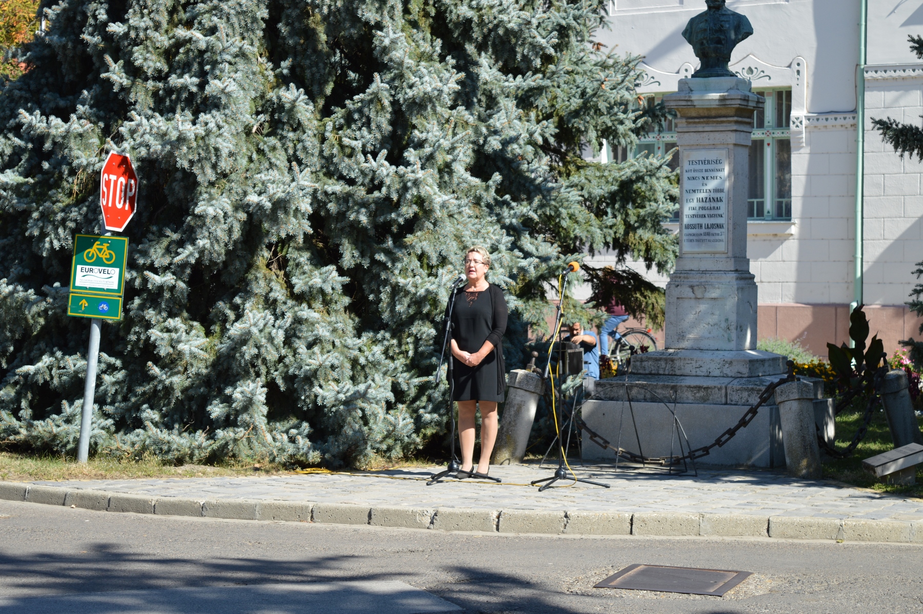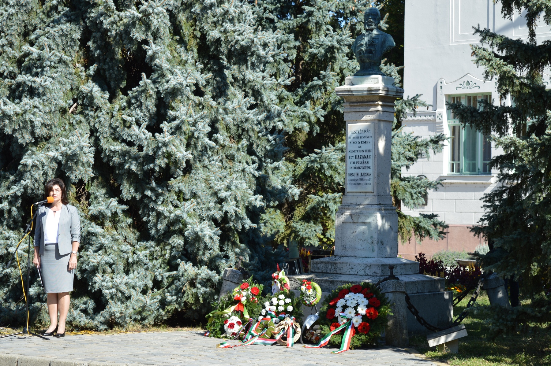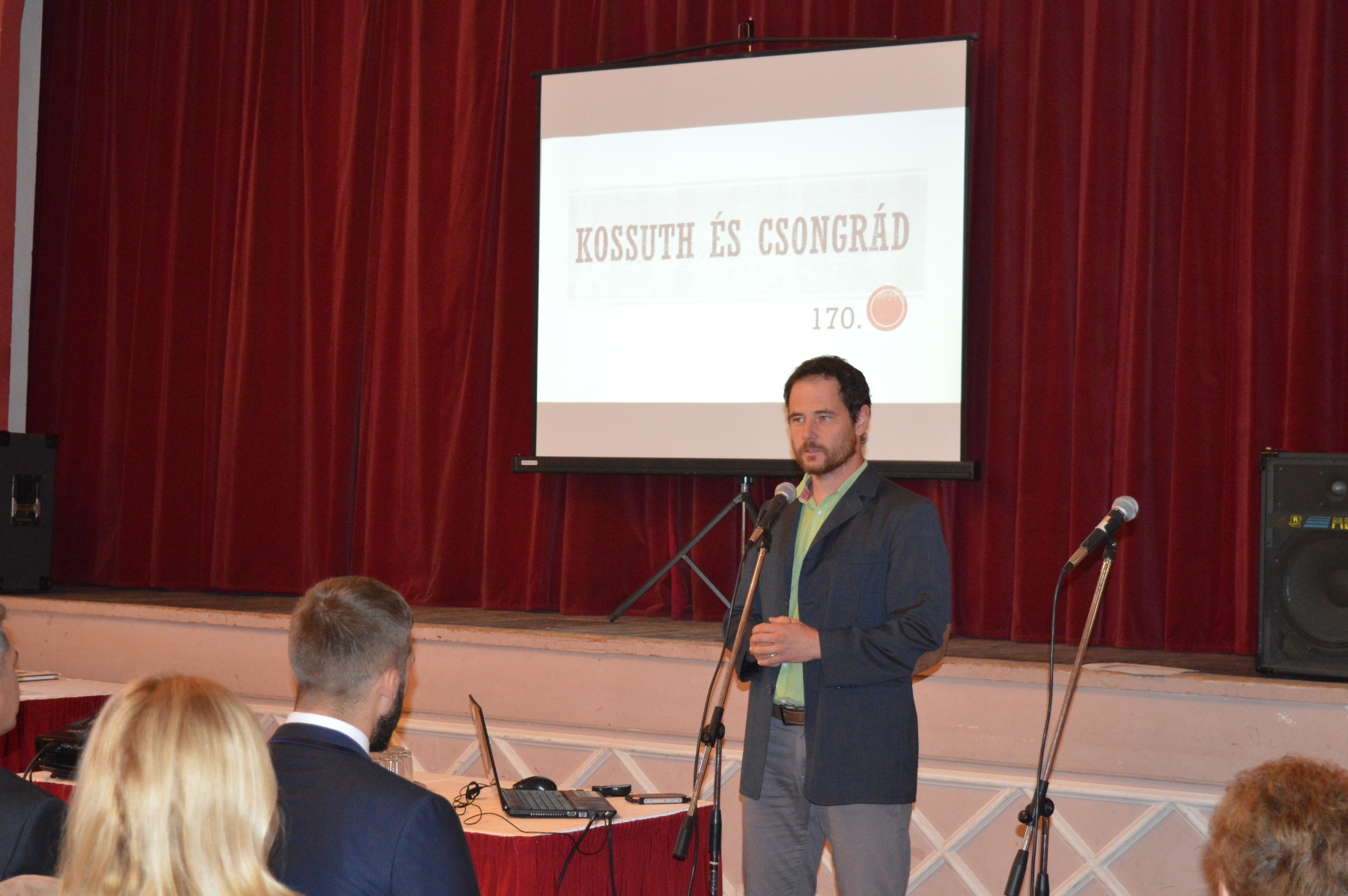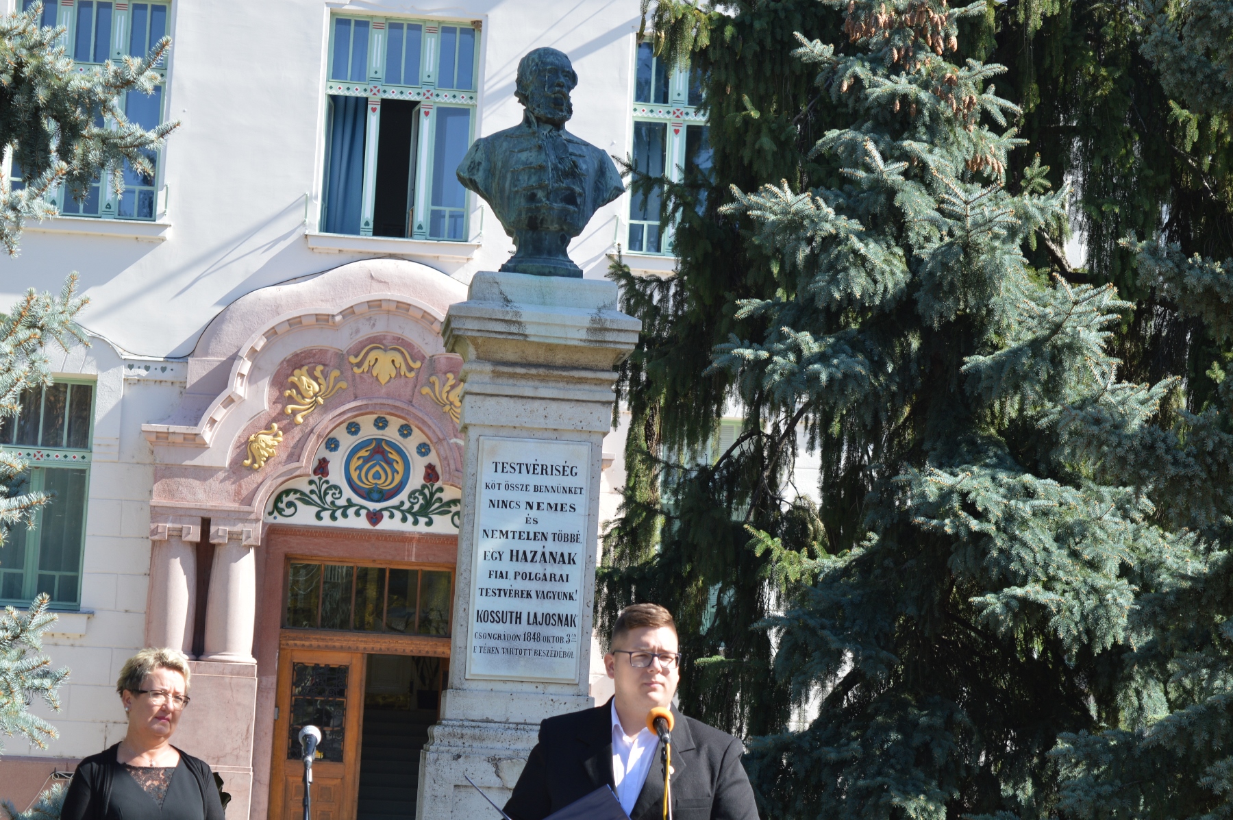 A Kossuth-örökséggel foglalkozó előadások közül elsőként Illés Péter, a Csemegi Károly Könyvtár ás Tari László Múzeum igazgatója mutatta be Csongrád és Kossuth Lajos kapcsolatát és a városban máig élő Kossuth-kultusz fejlődését, kitérve egy online társasjátékra, amelynek segítségével jobban megismerhetővé válnak a szabadságharc eseményei és Kossuth korabeli szerepvállalása. Marton Károly esperes, református lelkész a magyarittabei hagyományokról és a március 15-ei koszorúzások jelentőségéről beszélt, bemutatva a helyi református templom előtt álló Kossuth-szobor hányattatott sorsát és eltűnését is. Szilágyi Edit okleveles jogász, Óbecse önkormányzati képviselője délvidéki mozaikkockákkal foglalta össze a Vajdaság és Kossuth Lajos kapcsolatát, majd Szénási Istvánné, a Kossuth Szövetség elnöke méltatta a szervezet tevékenységét és a csongrádiakkal való együttműködés eredményeit. Ezt követően a gimnázium előtt Kossuth Lajos szobránál Rosta Dávid 12. évfolyamos tanuló szavalt részleteket Kossuth beszédeiből, majd az Alföld Néptáncegyüttes toborzó tánca és Tyukászné Balázs Katalin dallamai után koszorúzással zárult a városi megemlékezés.