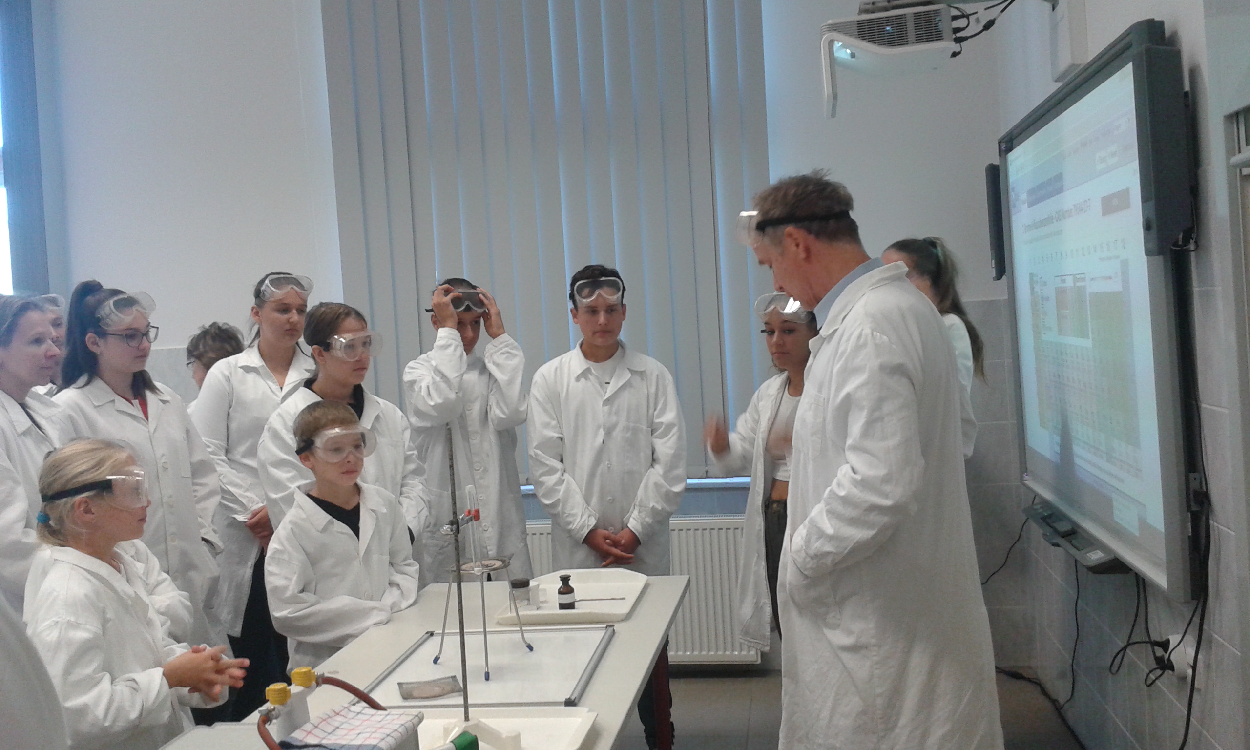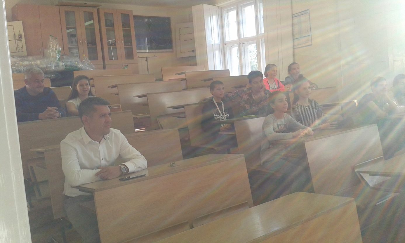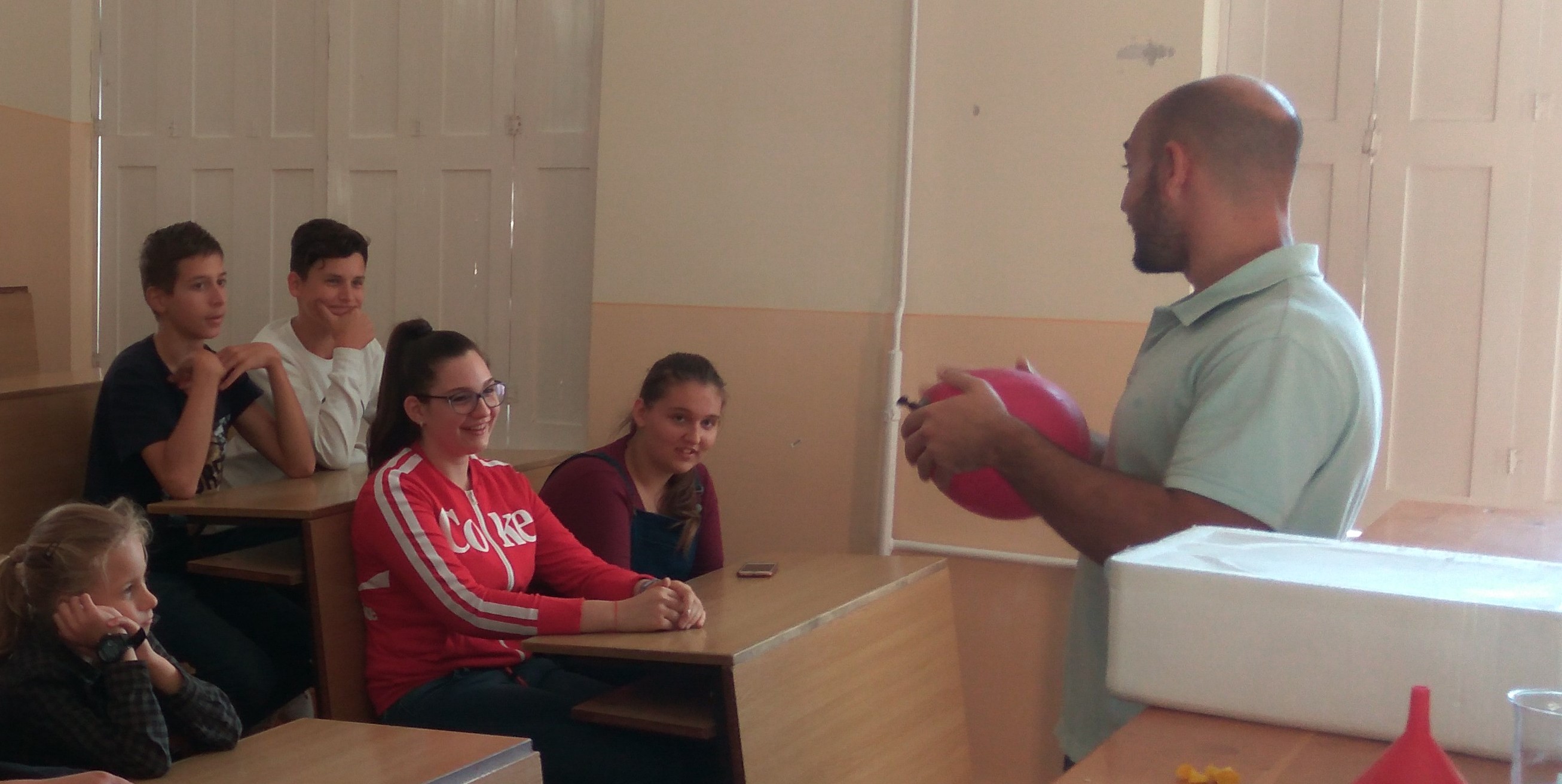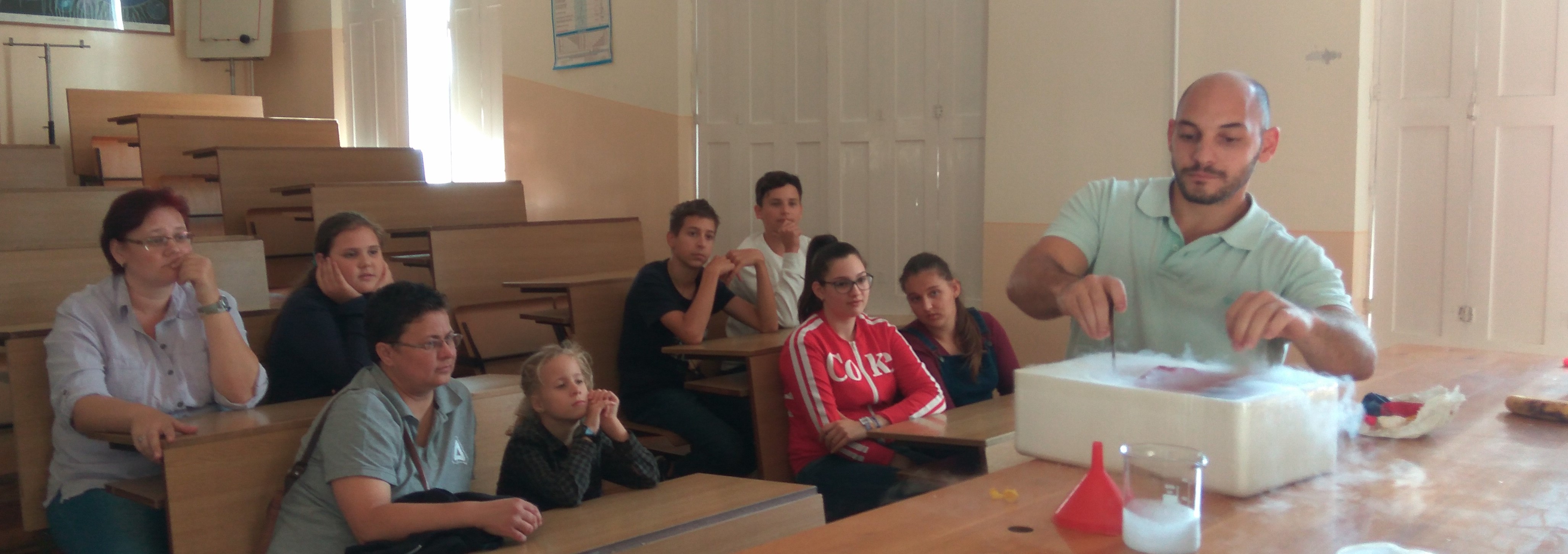 Az aulában bemutatott kísérletek szünetekben is látogathatók voltak. A  programok sikeréért sokat tettek laboránsaink Kovácsné Esztergálos Rita és Palatinus Ákos, valamint reál tagozatos diákjaink is segítették a kísérletezőket.