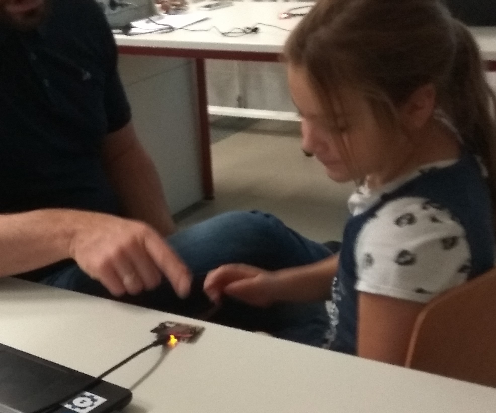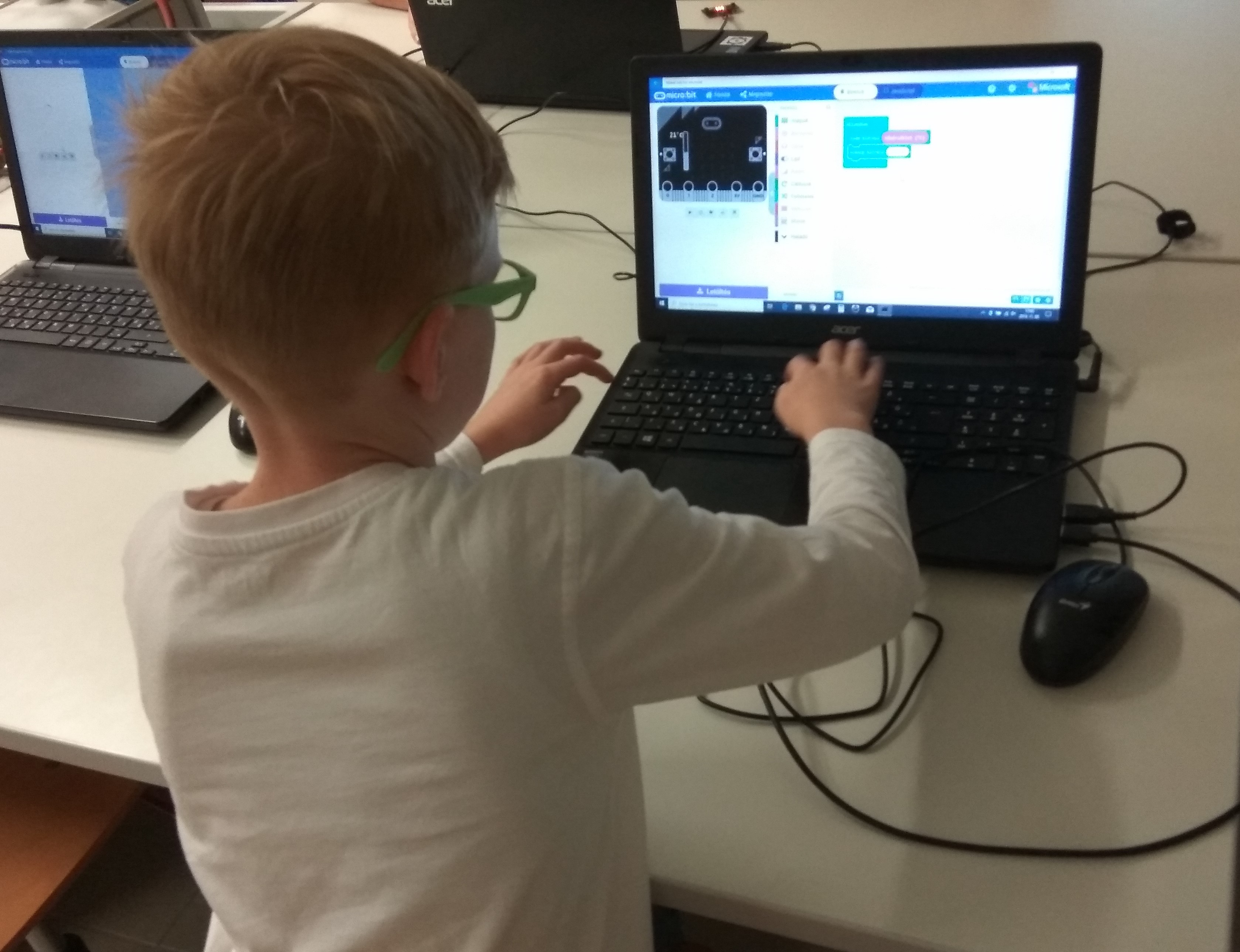 Nagy kihívás előtt álltak a kisdiákok: fel kellett élesztenünk a micro:Bit-et, és ez tényleg azt jelentette, hogy a led-mátrixon egy folyamatosan dobogó szívet működtetett a közösen megtervezett, de mindenki által megvalósított kód. Az ifjú programozók elfáradtak a nagy munkában, és lazításképpen játszani szerettek volna, de ‘sajnos’ nem volt készen egy játék sem, így együttes erővel a közismert Kő-Papír-Olló játékra tanítottuk meg a micro:Bit-et. A sikeres kódolás után nagy meccsek következtek: hol két micro:Bit játszott egymás ellen, hol diák-„gép” mérkőzés zajlott az asztaloknál.