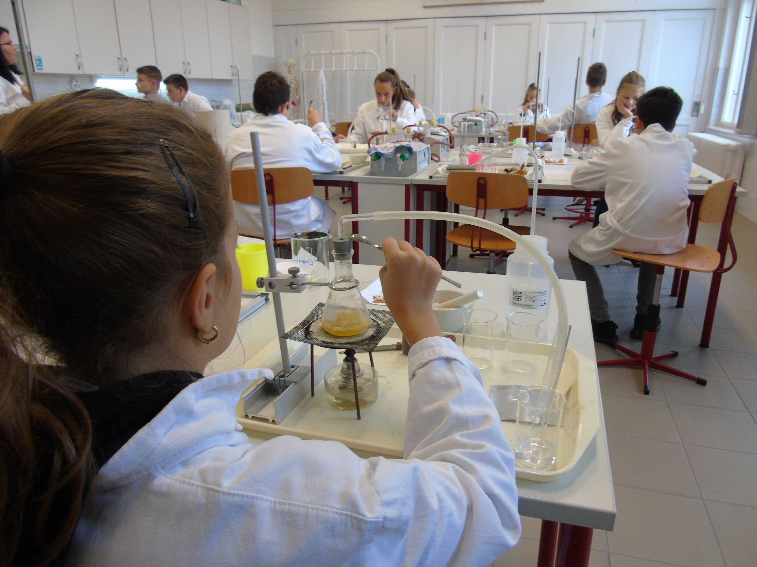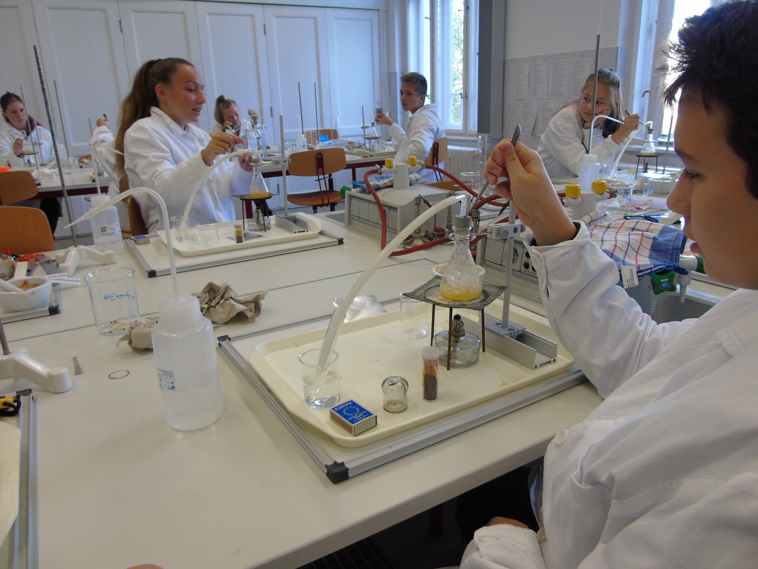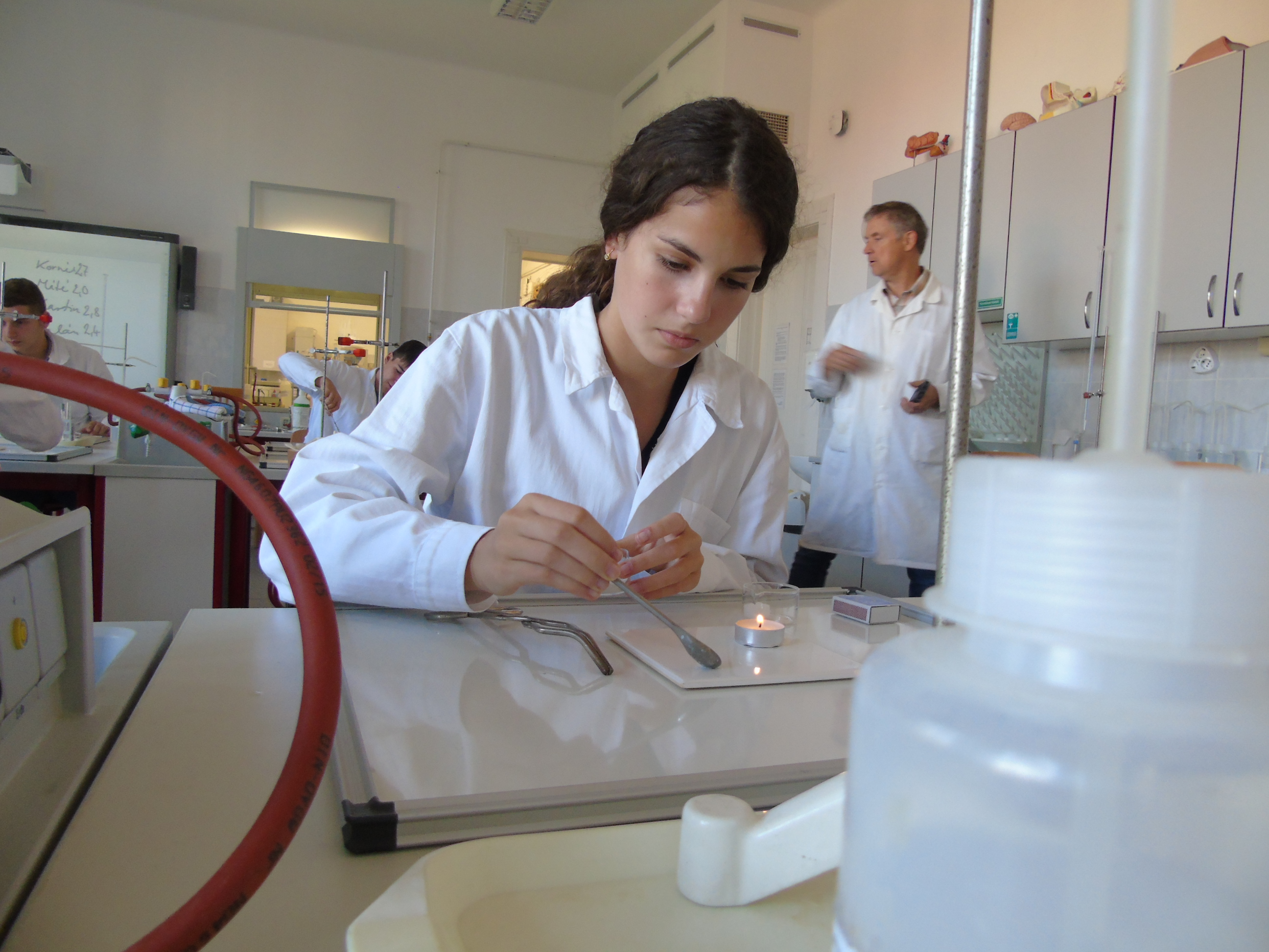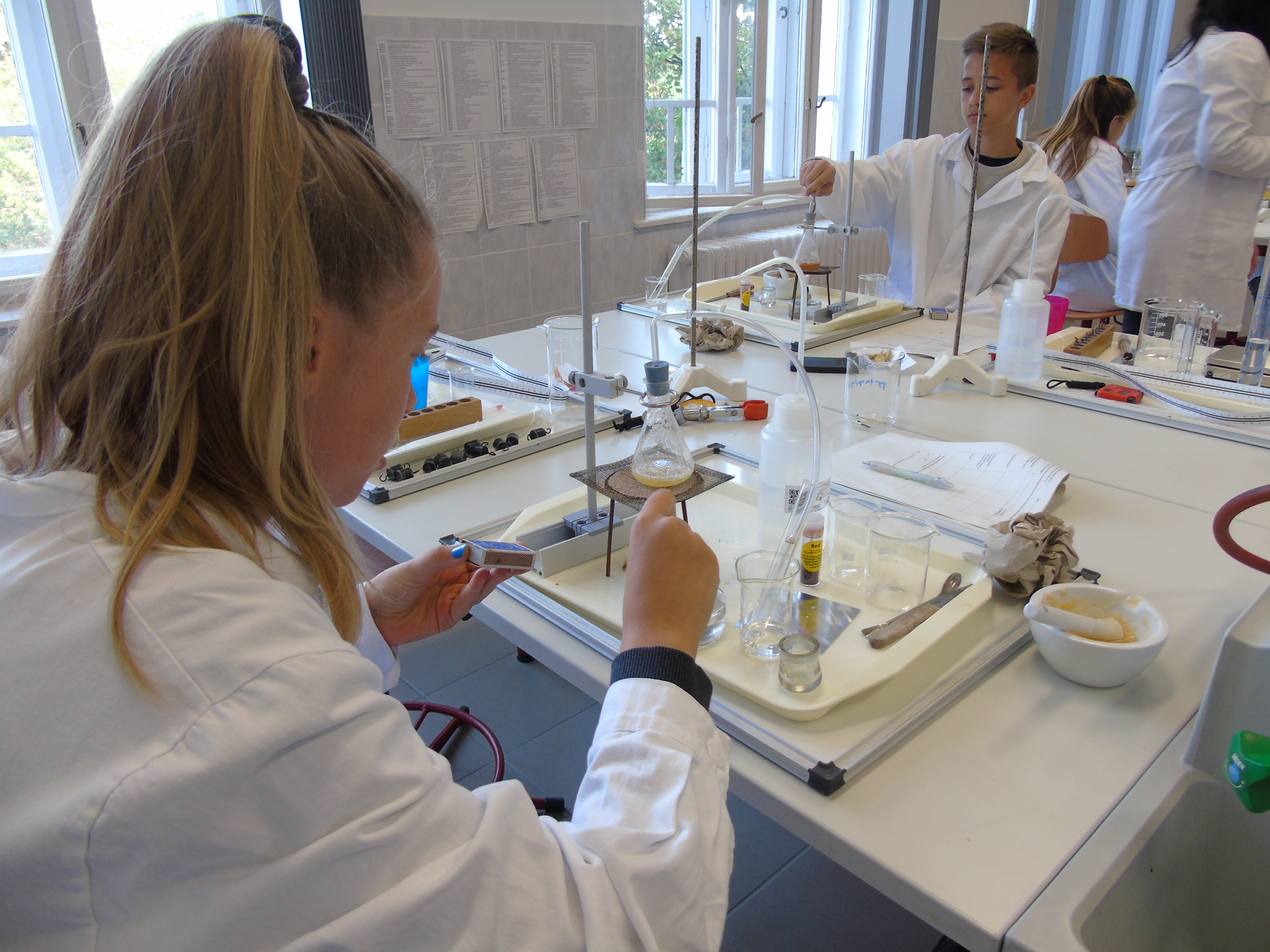A kémiai kísérletezés az eszközök és módszerek megismerésével kezdődött, a tapasztaltabb csoport a szerves vegyületek kimutatásával és éghetőséggel kapcsolatban végzett tanulókísérleteket.