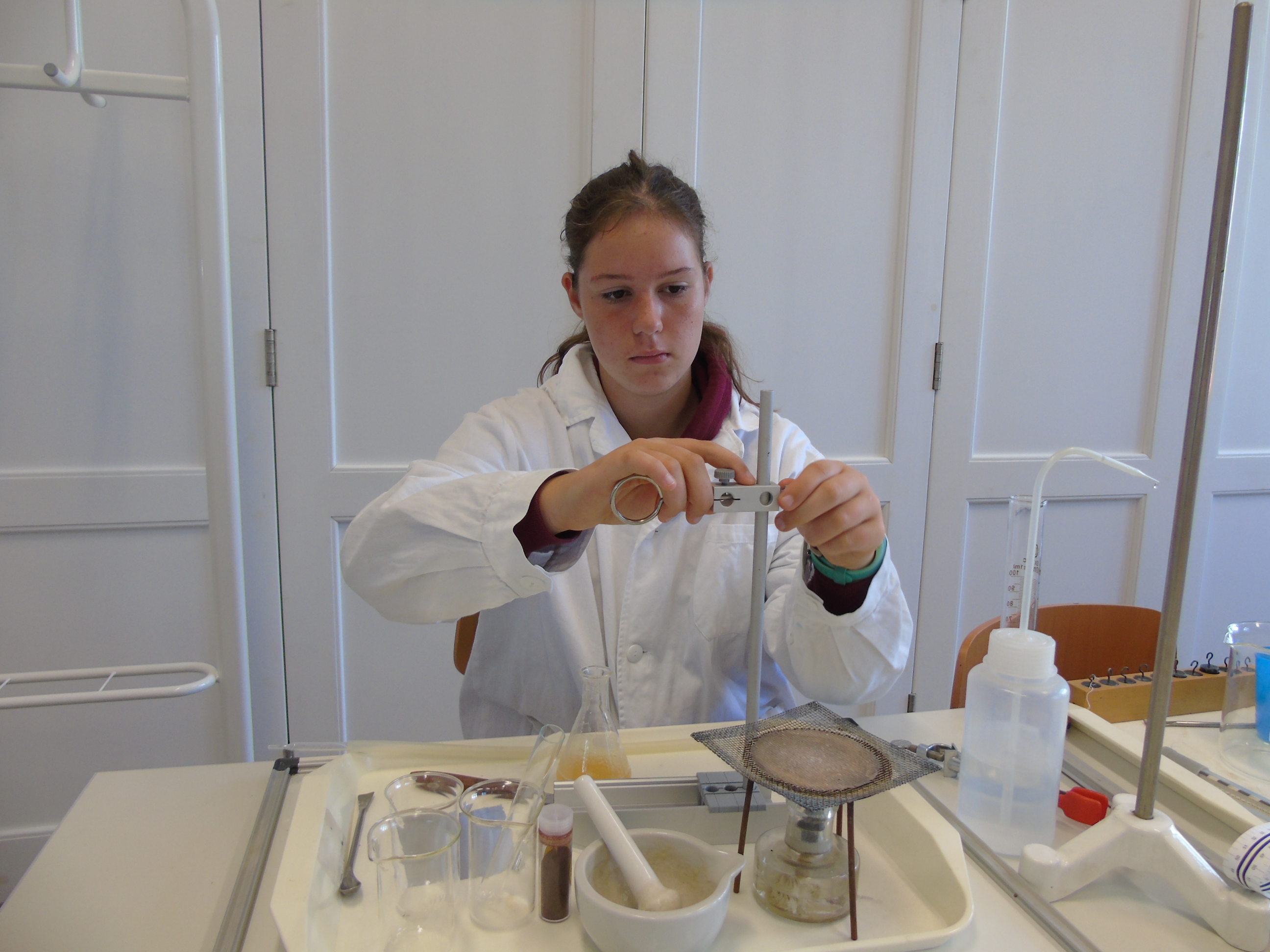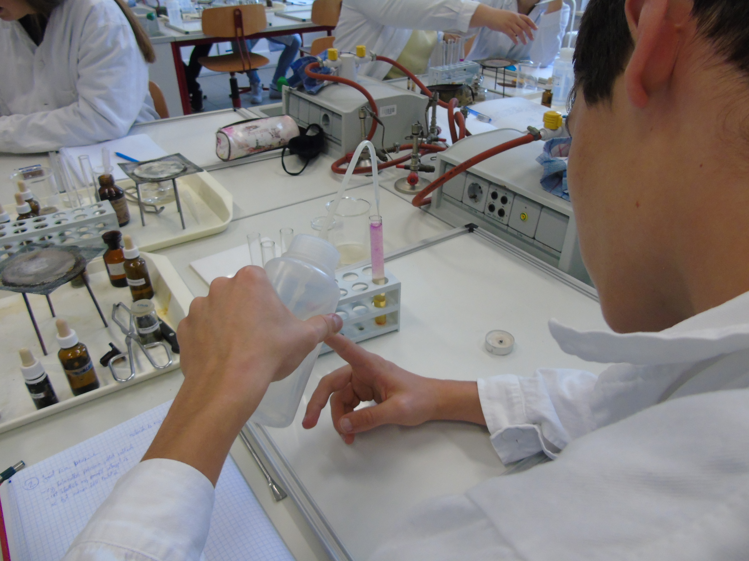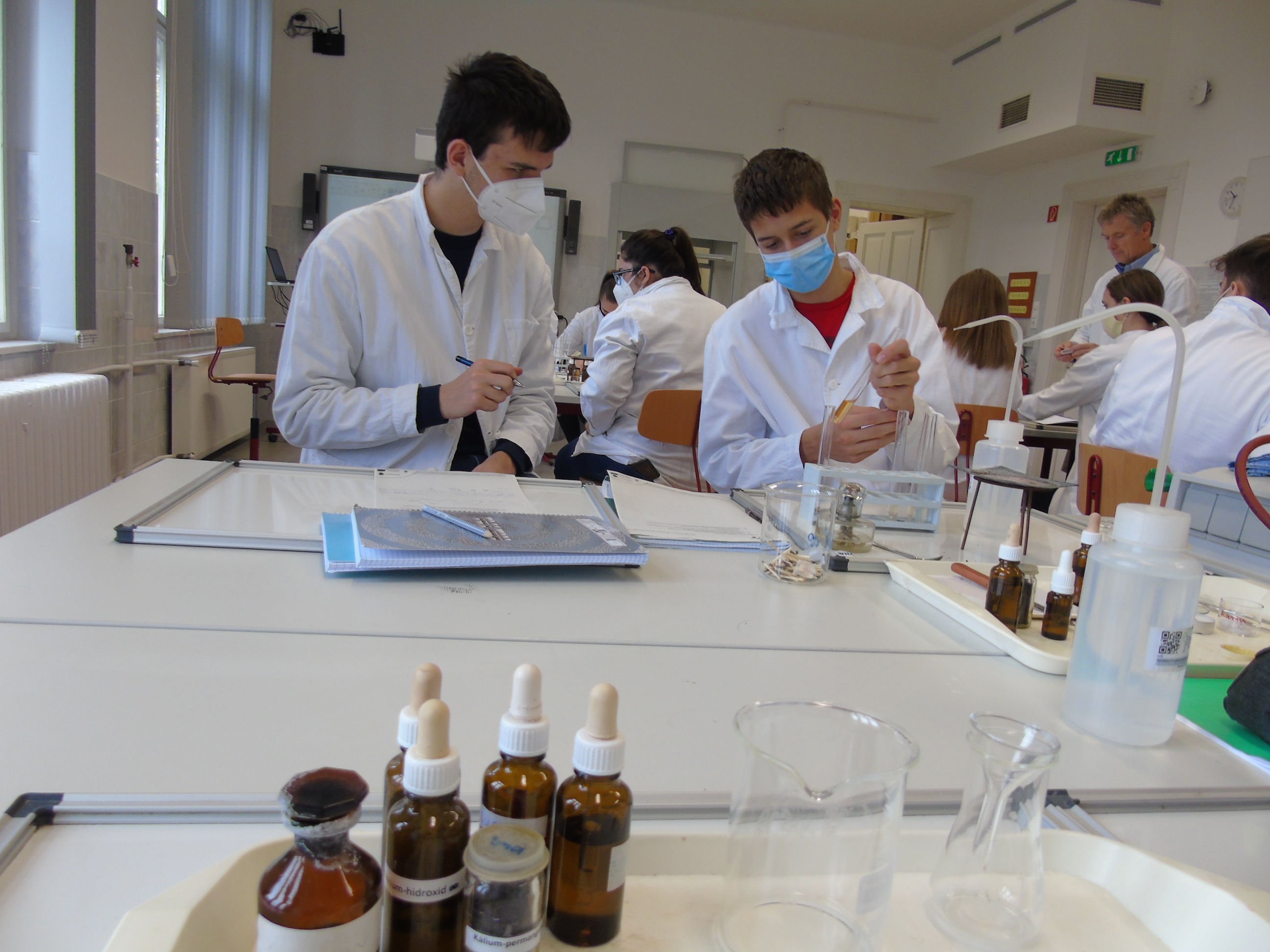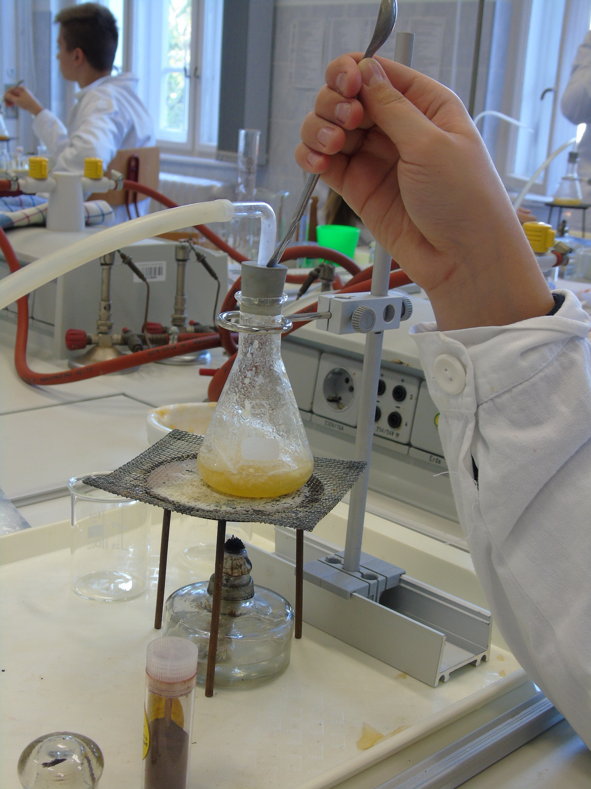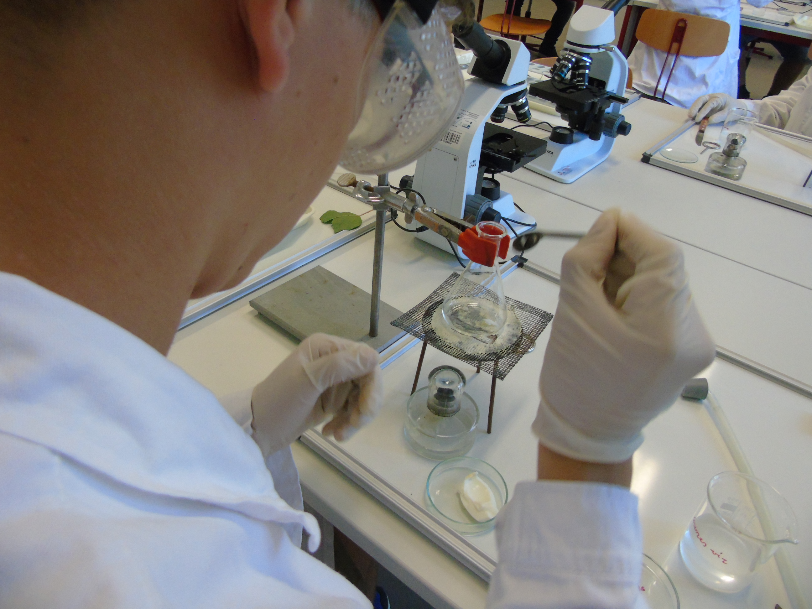 A kémiai kísérletezés az eszközök és módszerek megismerésével kezdődött, a tapasztaltabb csoport a szerves vegyületek kimutatásával és éghetőséggel kapcsolatban végzett tanulókísérleteket.