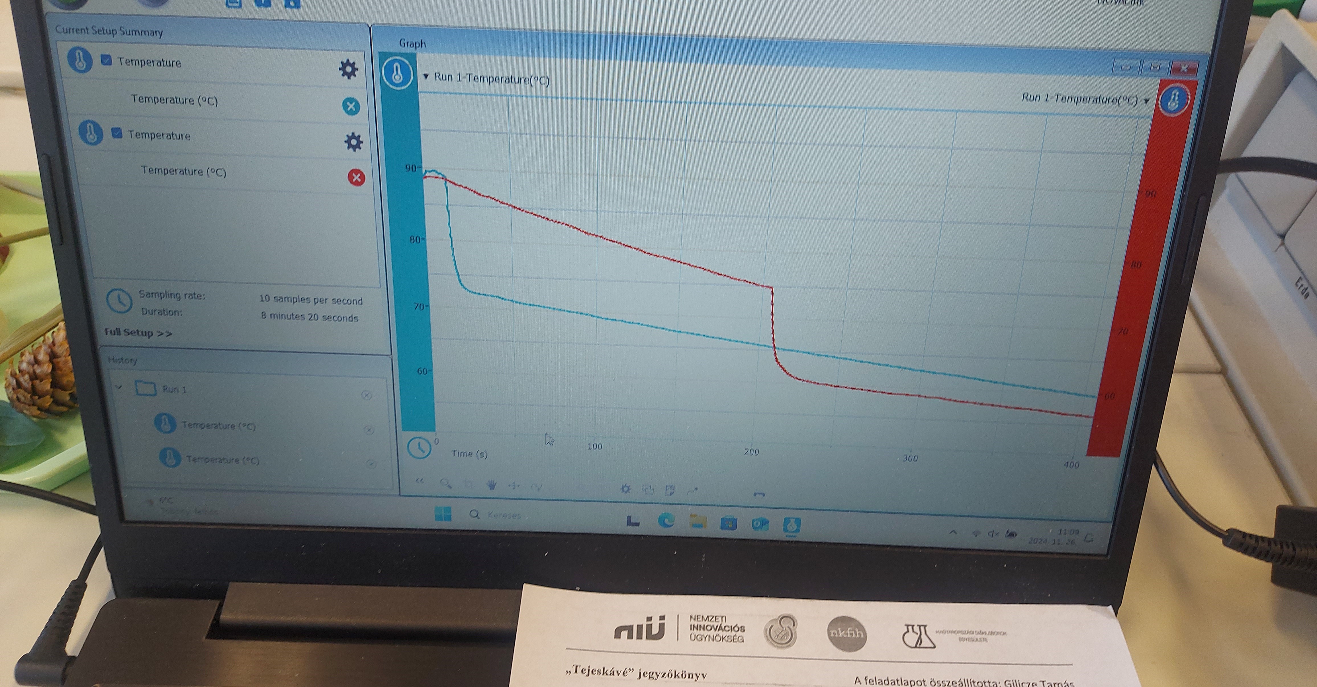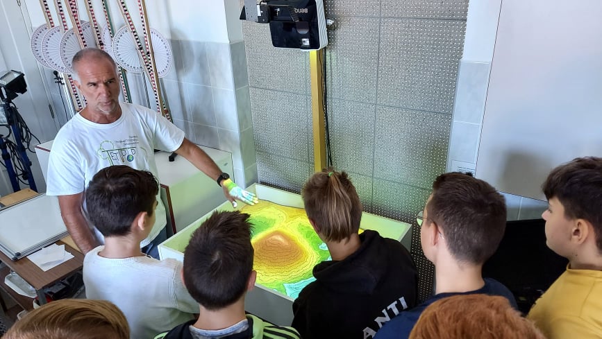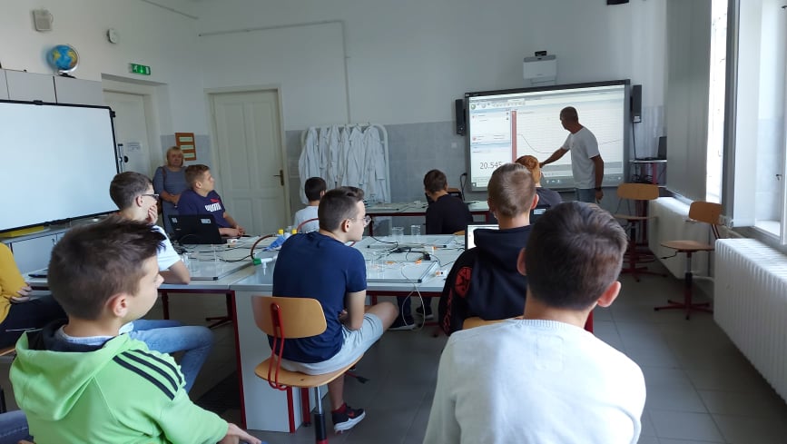 Gilicze Tamás tanár úrral megismerték a számítógépes mérési adatgyűjtés módszerét, majd hőmérő szenzorokkal vizsgálták a termikus kölcsönhatás folyamatát és a párolgás közben bekövetkező hőelvonást. A foglalkozás végén a digitális homokozót próbálták ki a diákok, tapasztalatuk és a magyarázat alapján megértették a működését is.