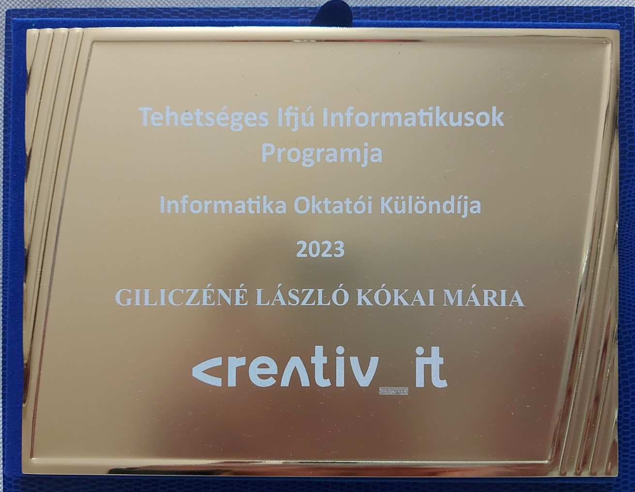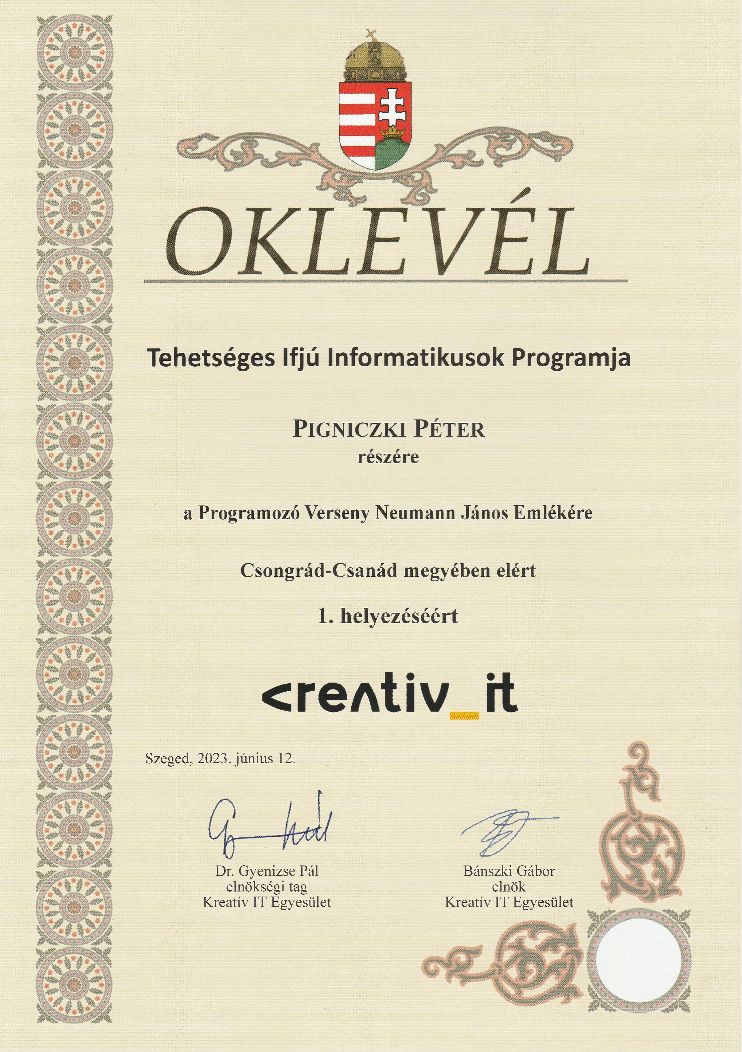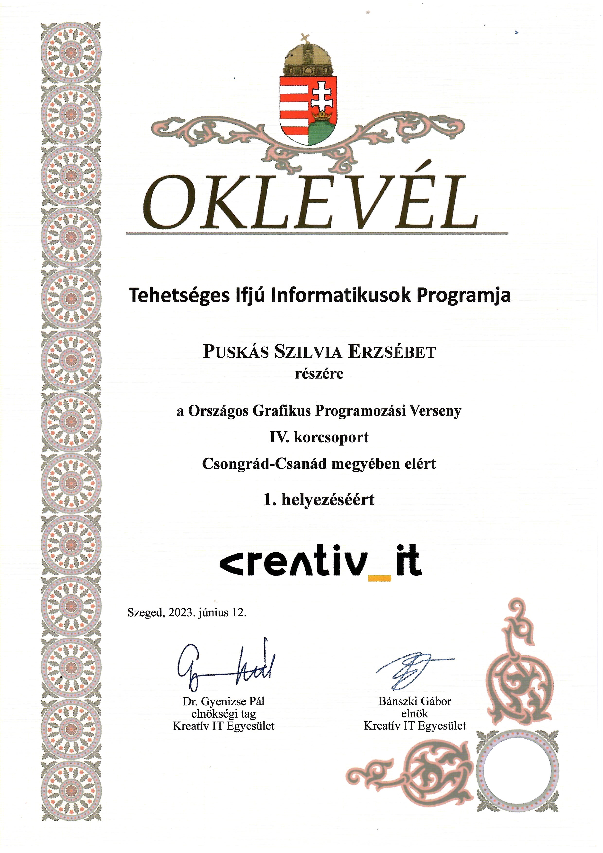 A <creativ_IT (Kreatív Információtechnológiai Egyesület) egy szakmai szövetség a szegedi IT szakma cégei között. Ez a szervezet az elmúlt évben eldöntötte, hogy díjazza a tehetséges megyei gyerekeket, akik országos versenyeken eredményeket érnek el. 2023-ban a versenyek országos helyezése alapján a megyében az első három helyezettet emelték ki.