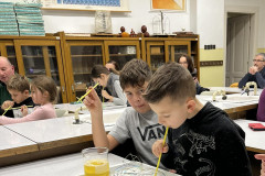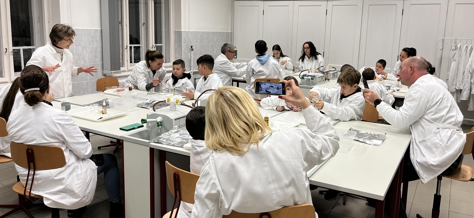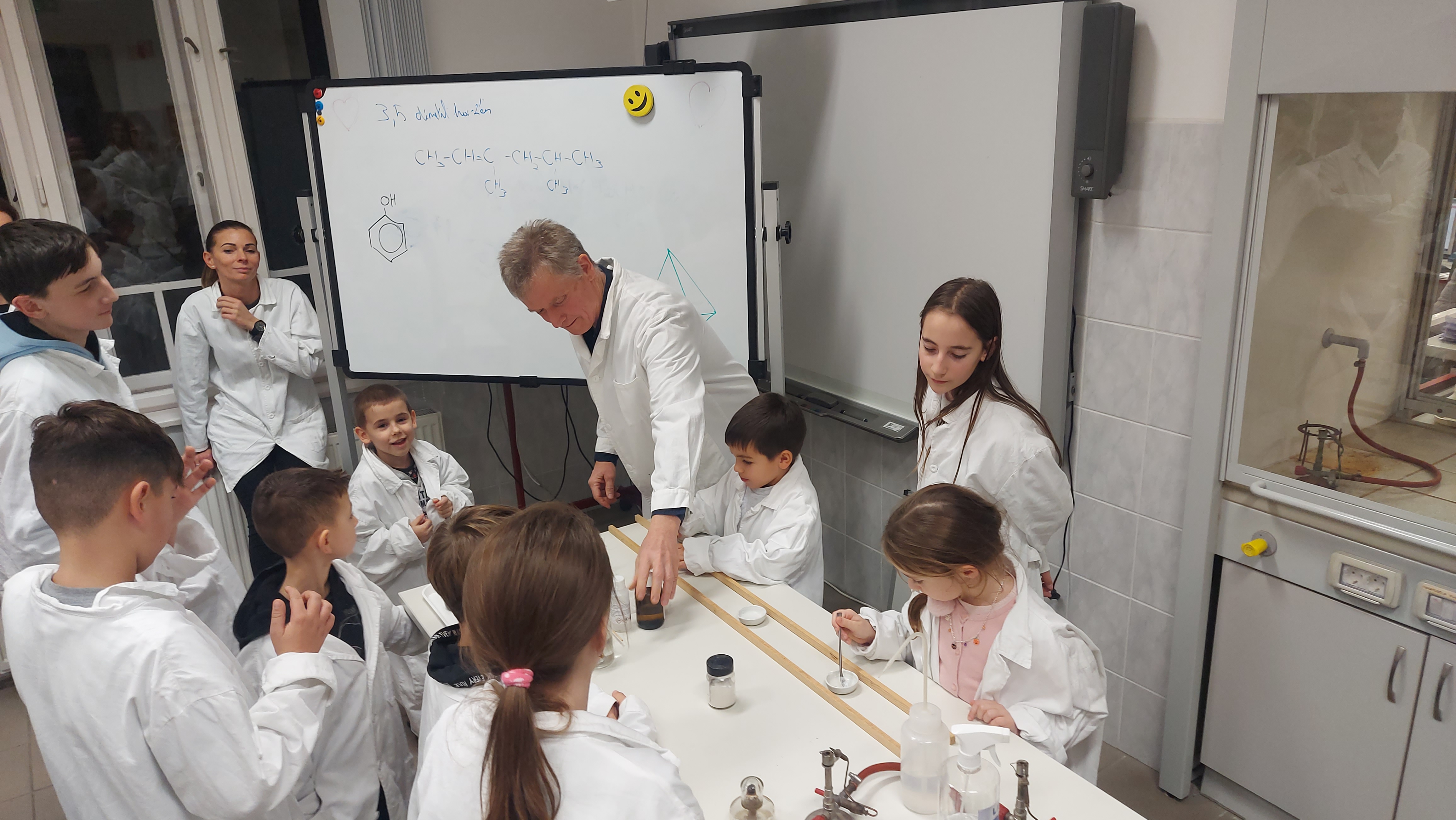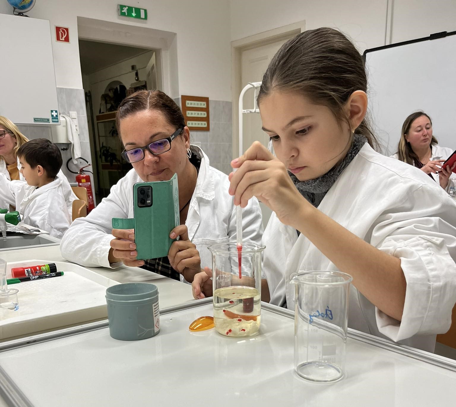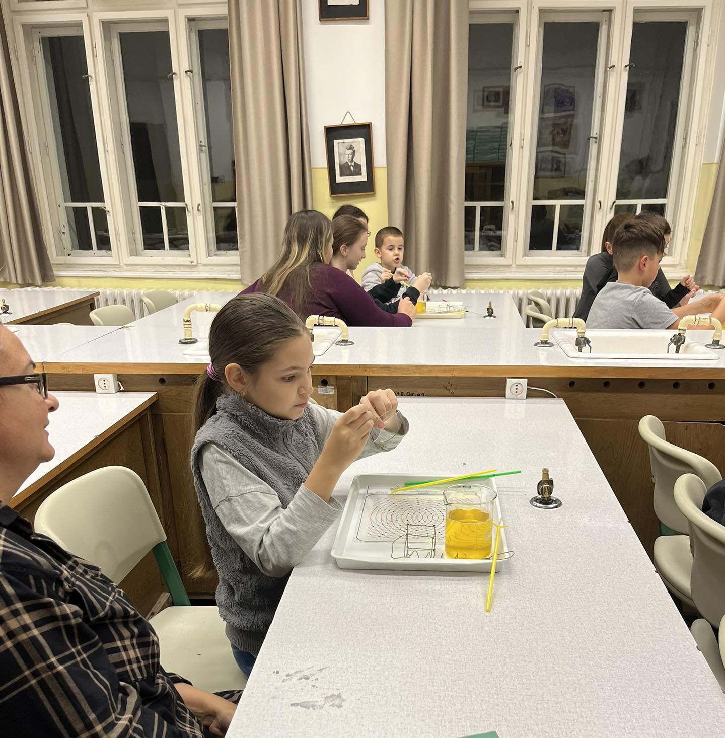 A laboratóriumban Tábori Leventéné tanárnővel tavaszt varázsoltak az őszbe a vízben nyíló színes virágokkal. Részesei lehettek egy vulkánkitörésnek és táncoló cseppeket csodálhattak meg pohárban. A vöröskáposztával megfestett papírlapon színes rajzokat készíhettek, zöldet, vöröset.