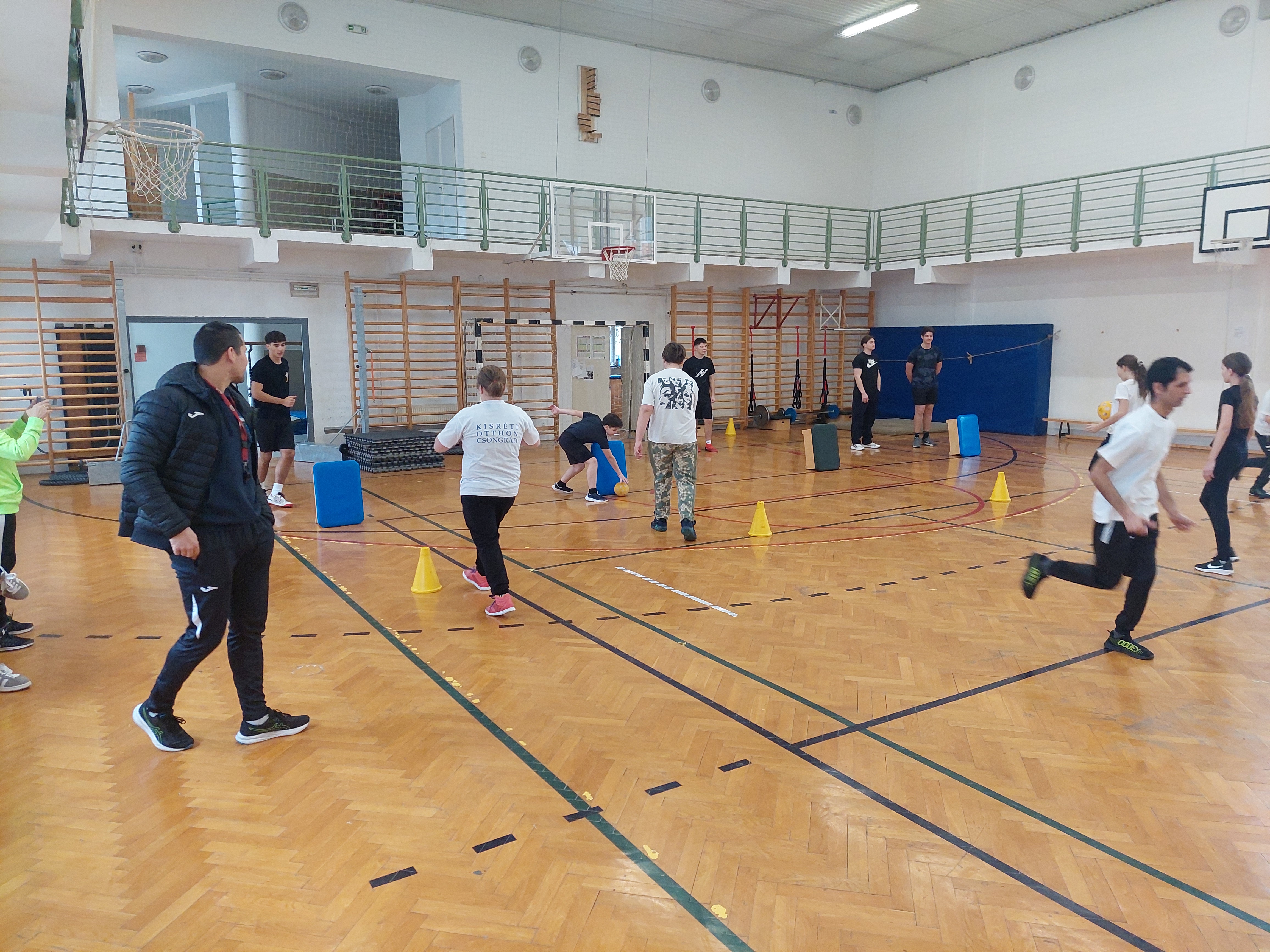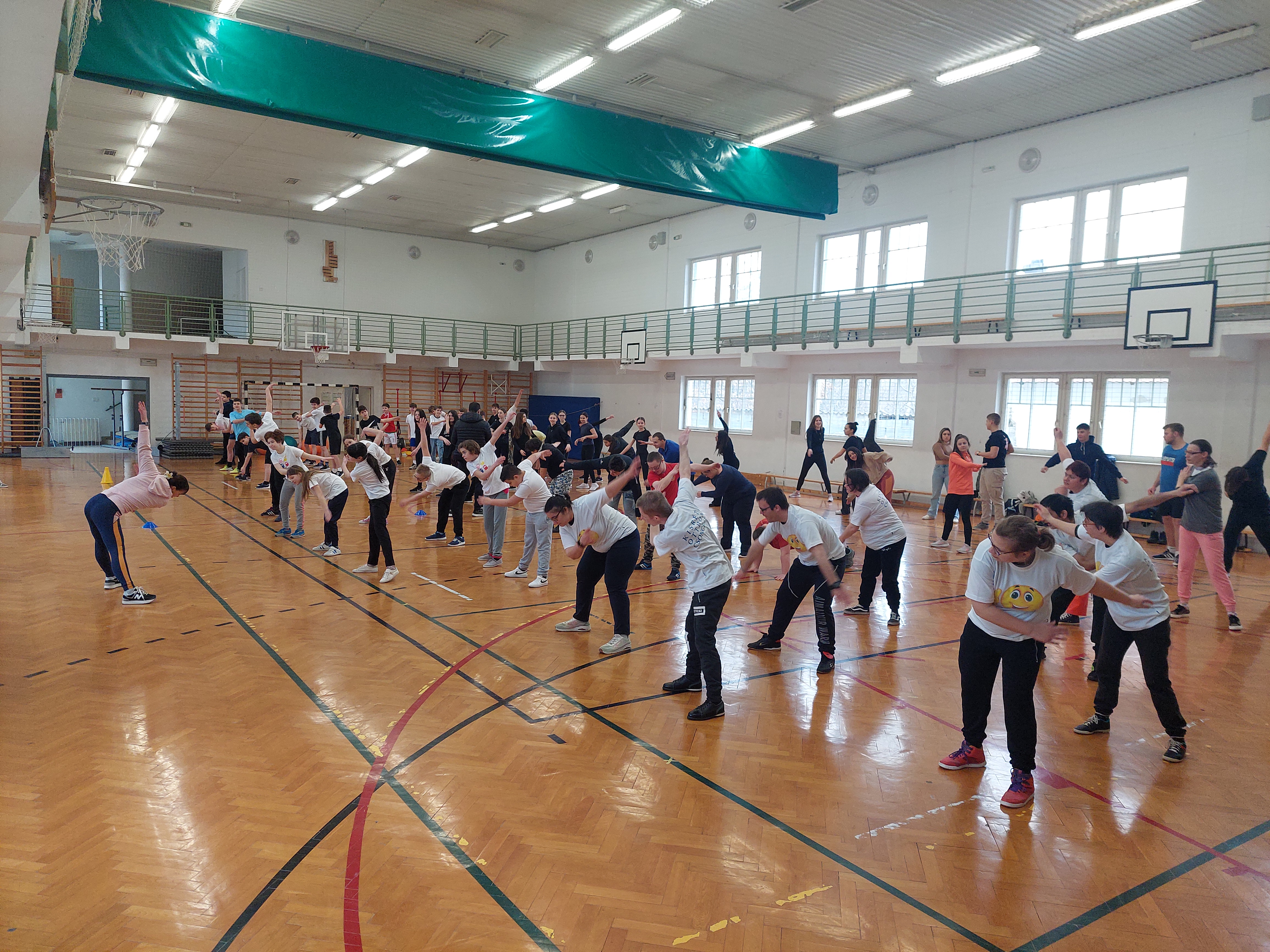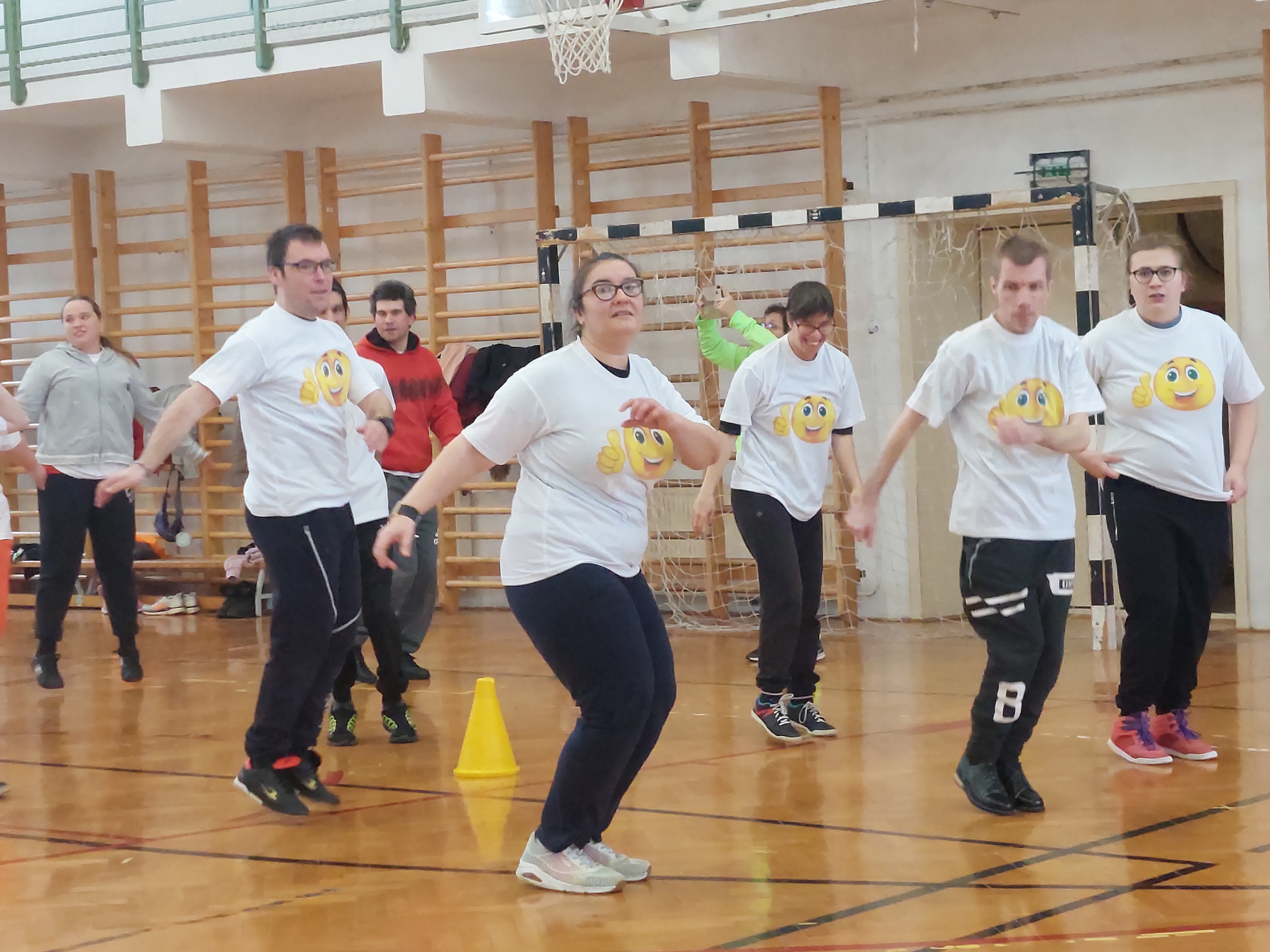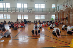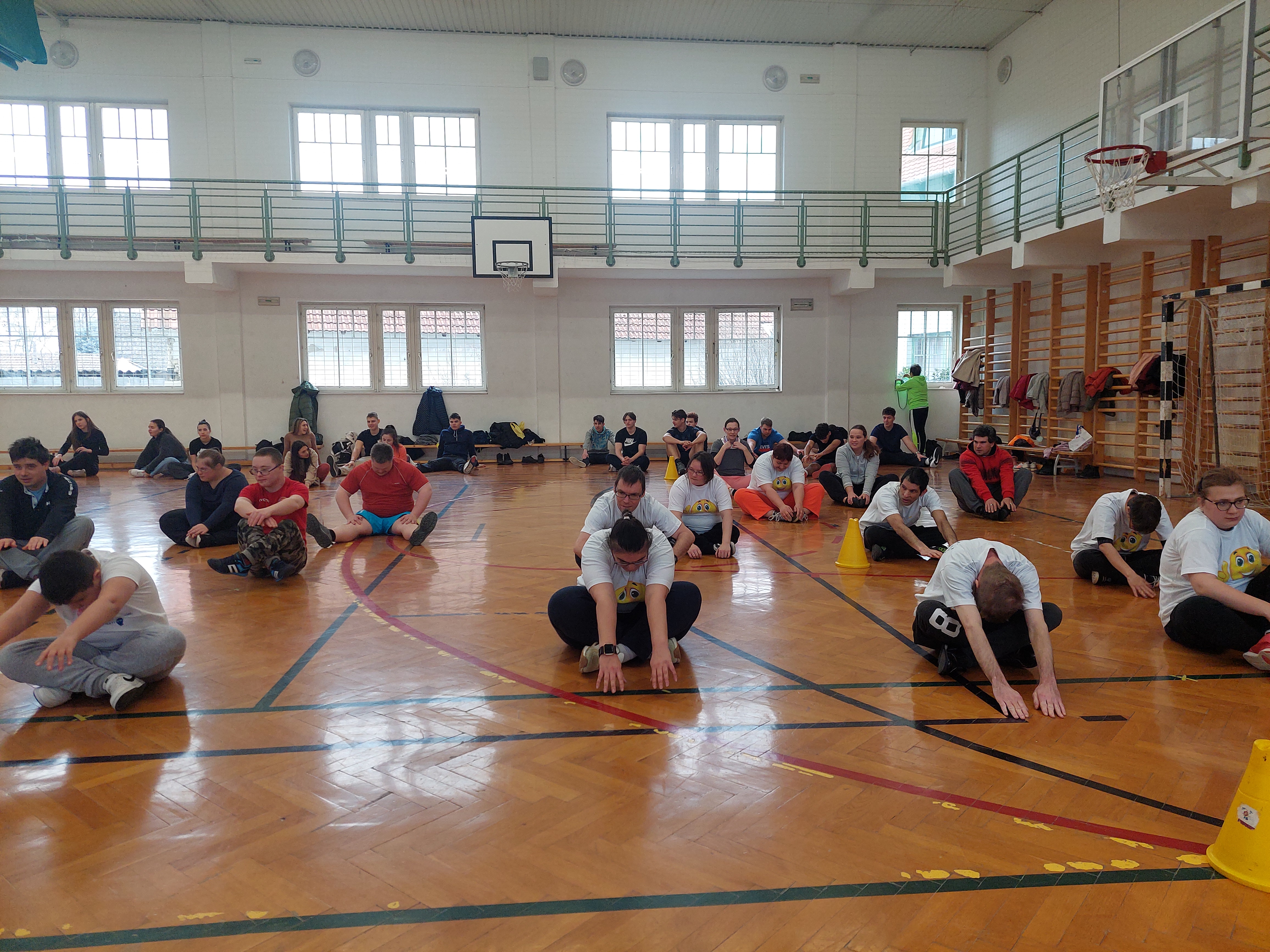 A meghívott külsős vendégeink egyenruhát hoztak. Az átöltözés és egy kis ismerkedés után zenés gimnasztikával kezdtük, bemelegítésképpen. Ezt Kátai Judit gyógytestnevelő tanárnő vezényelte.