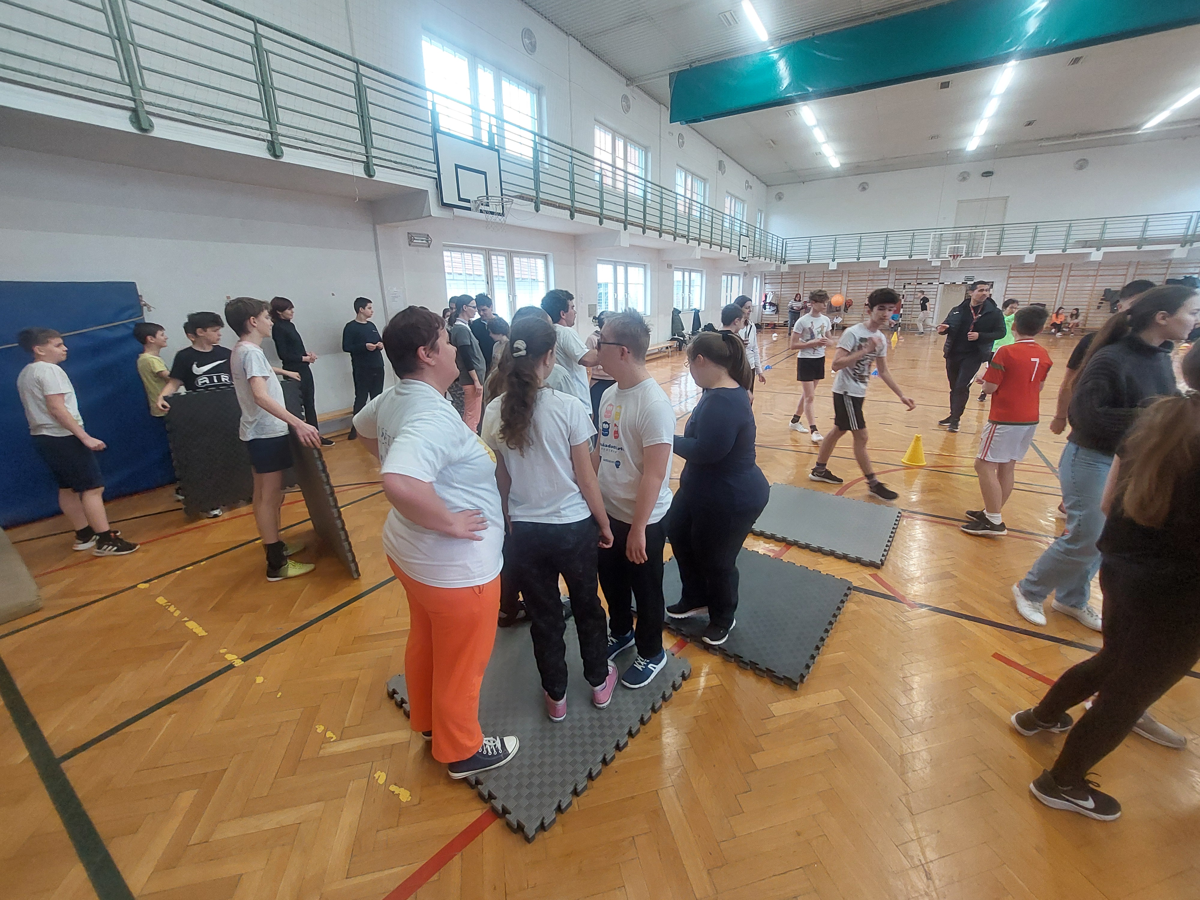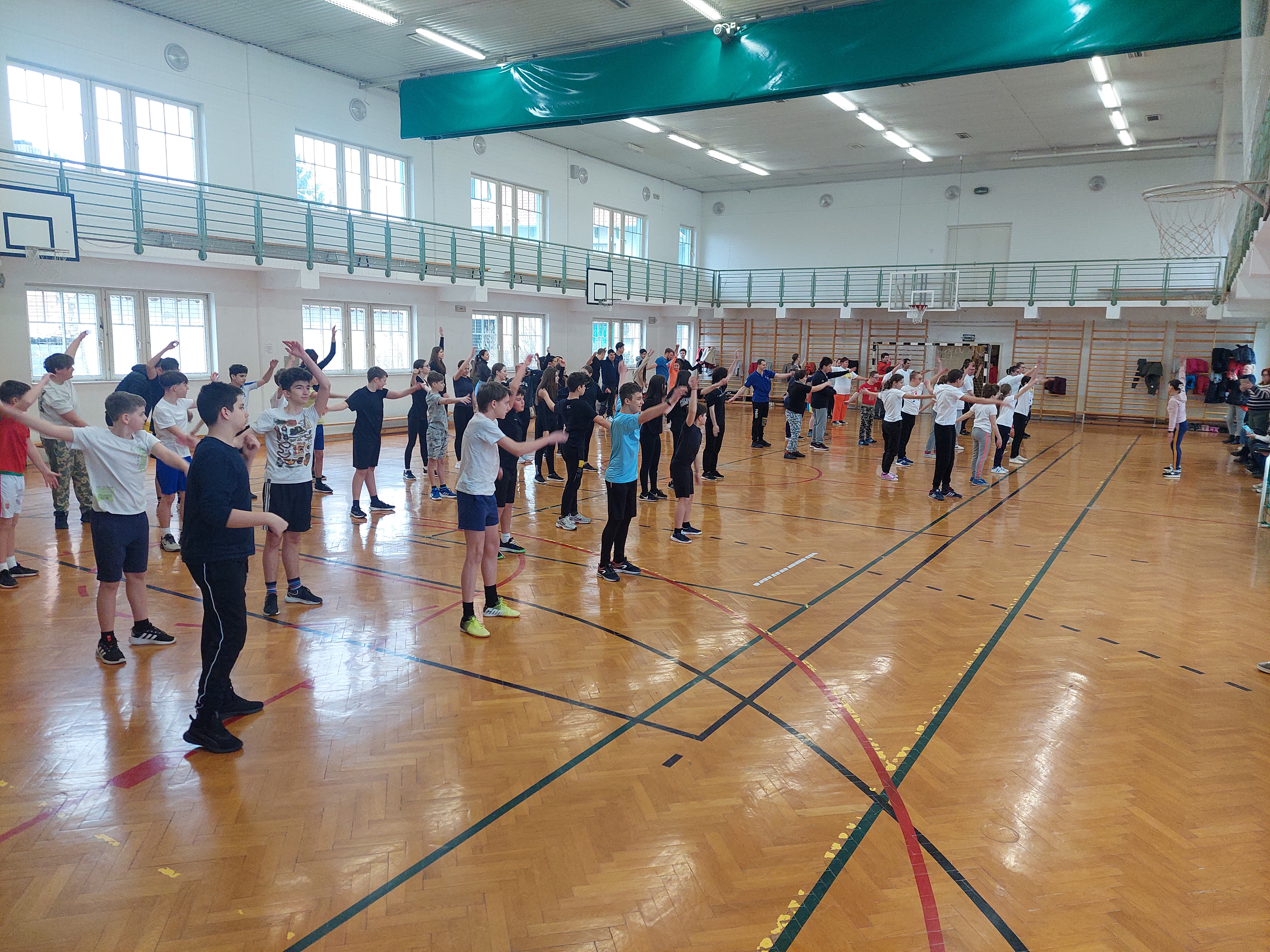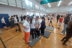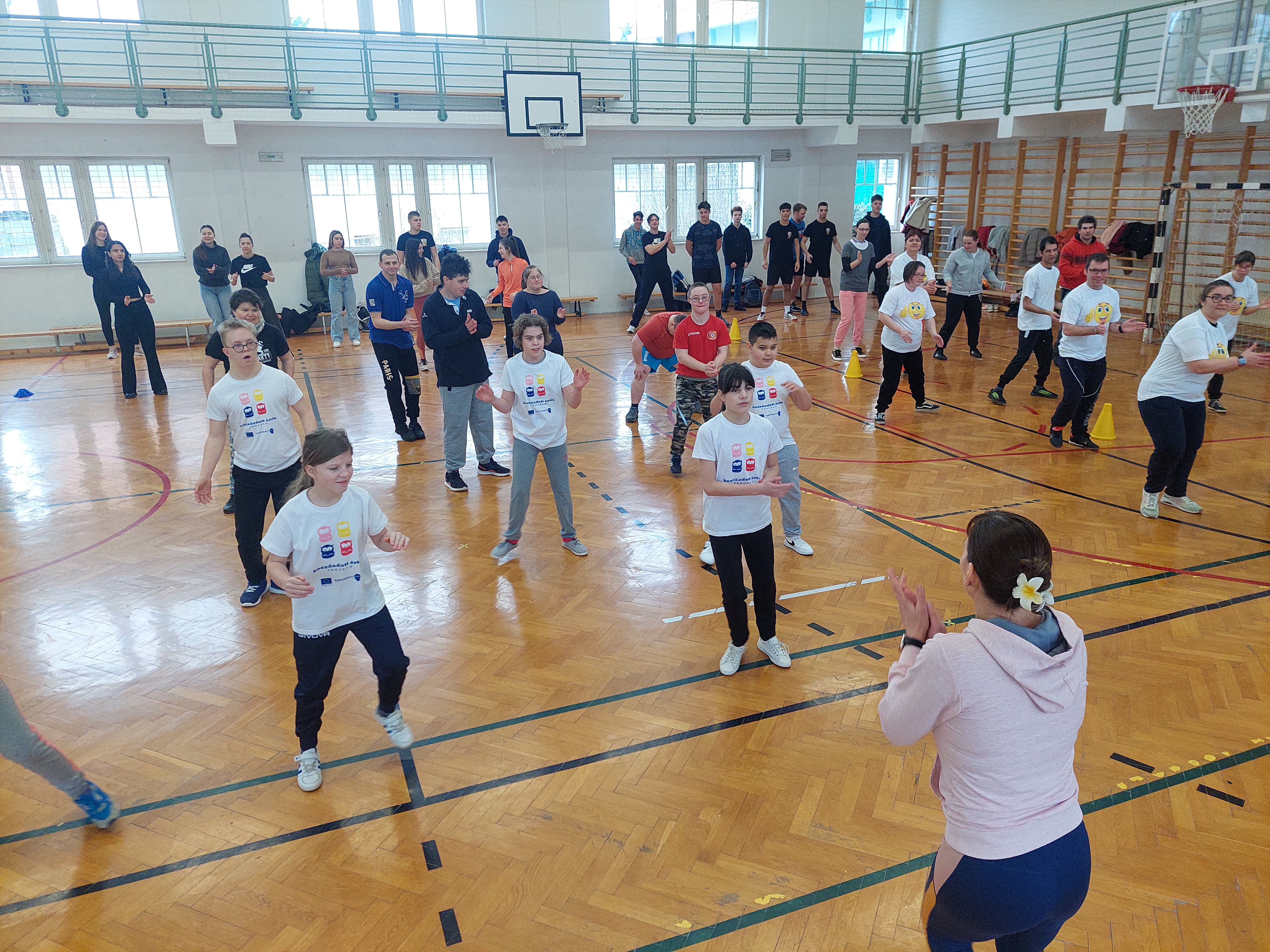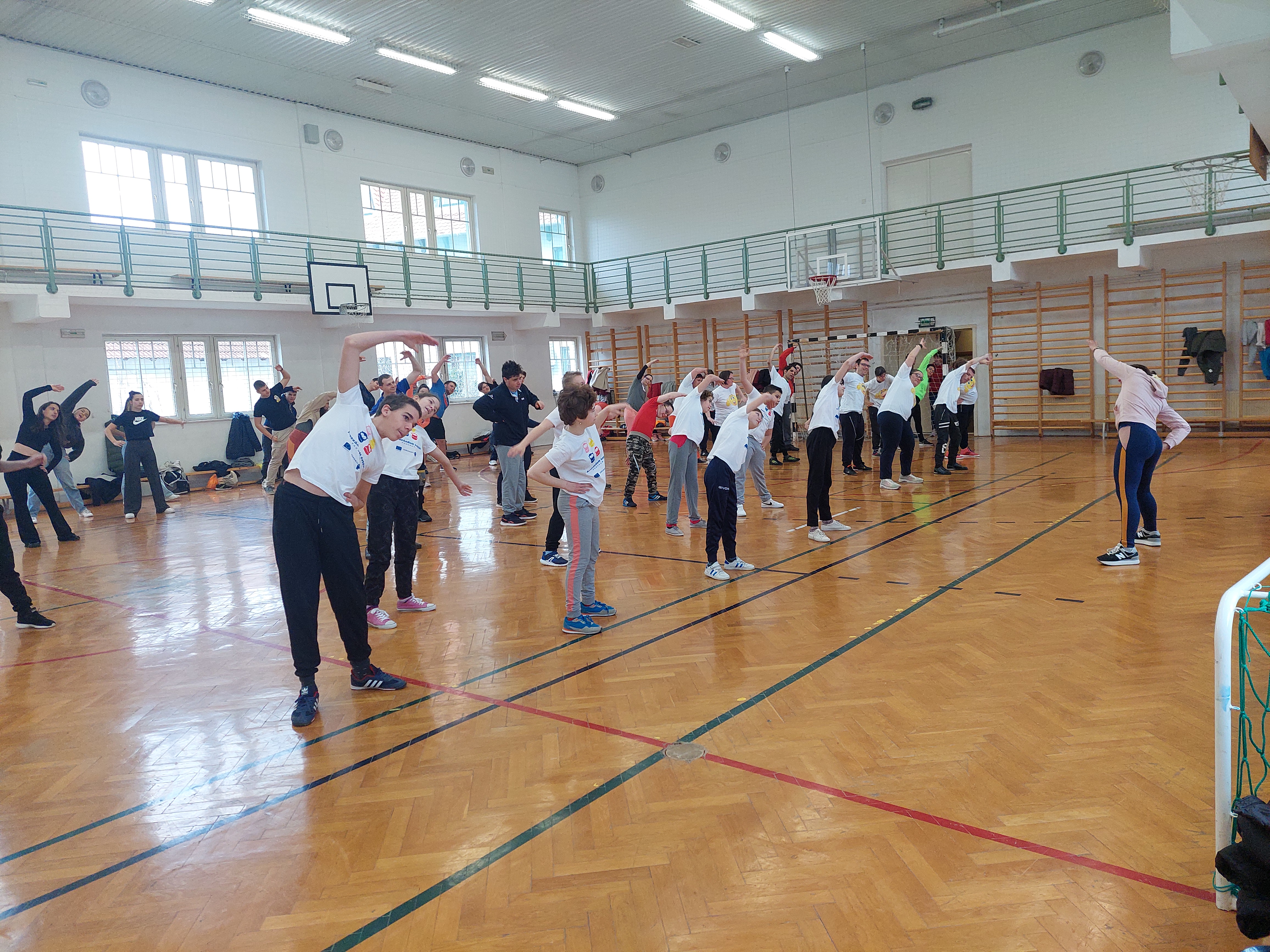 A meghívott külsős vendégeink egyenruhát hoztak. Az átöltözés és egy kis ismerkedés után zenés gimnasztikával kezdtük, bemelegítésképpen. Ezt Kátai Judit gyógytestnevelő tanárnő vezényelte.
