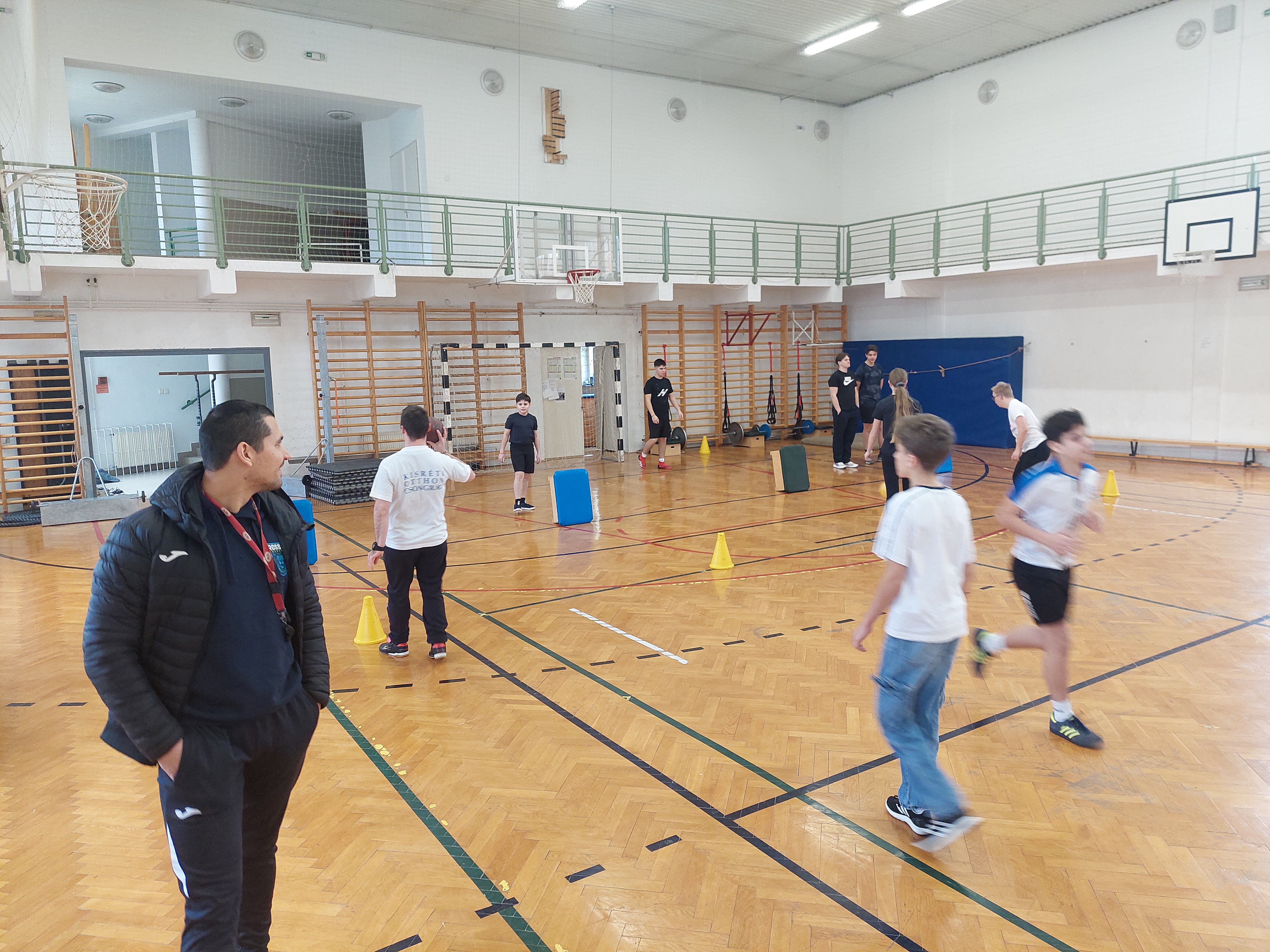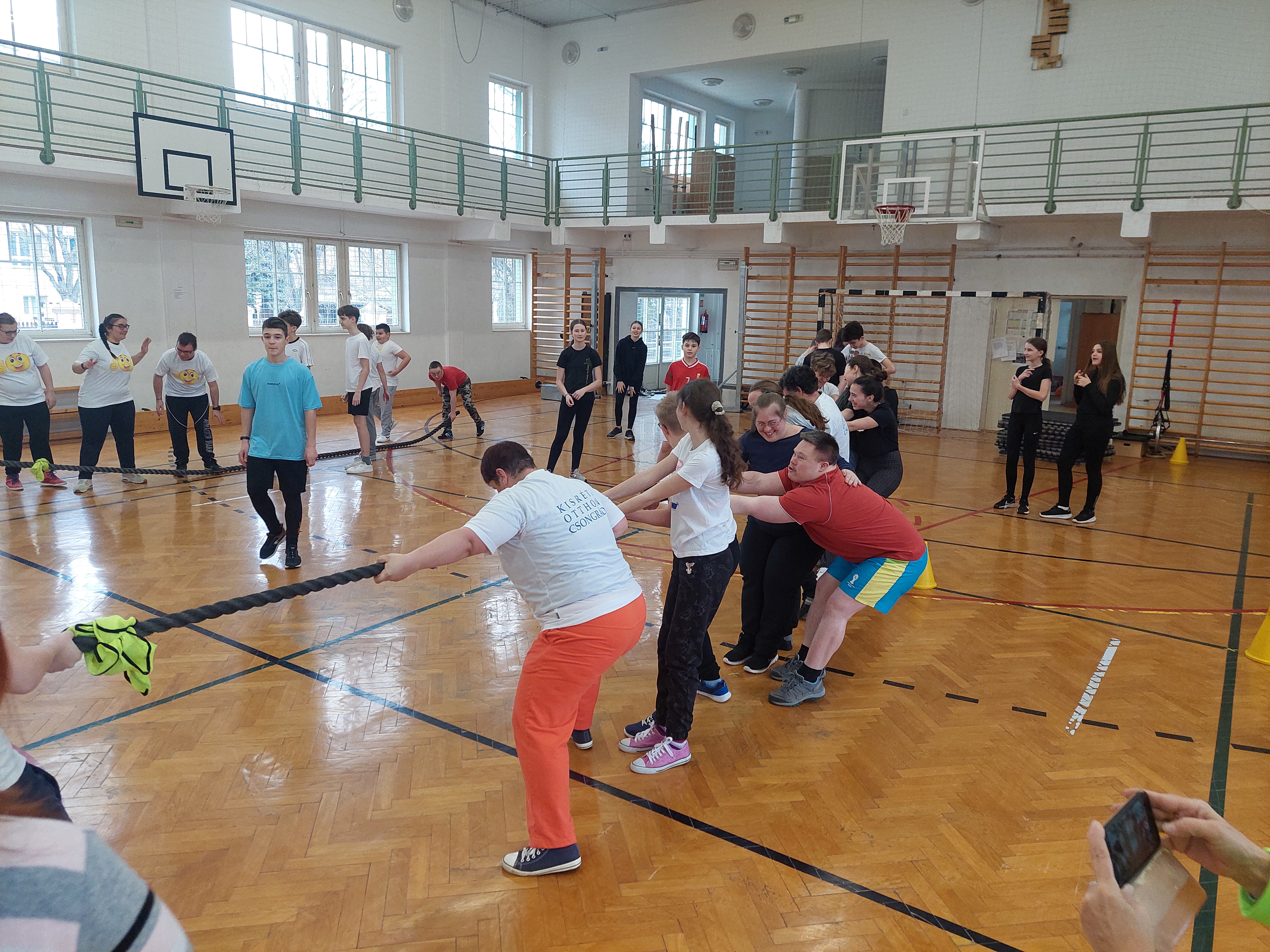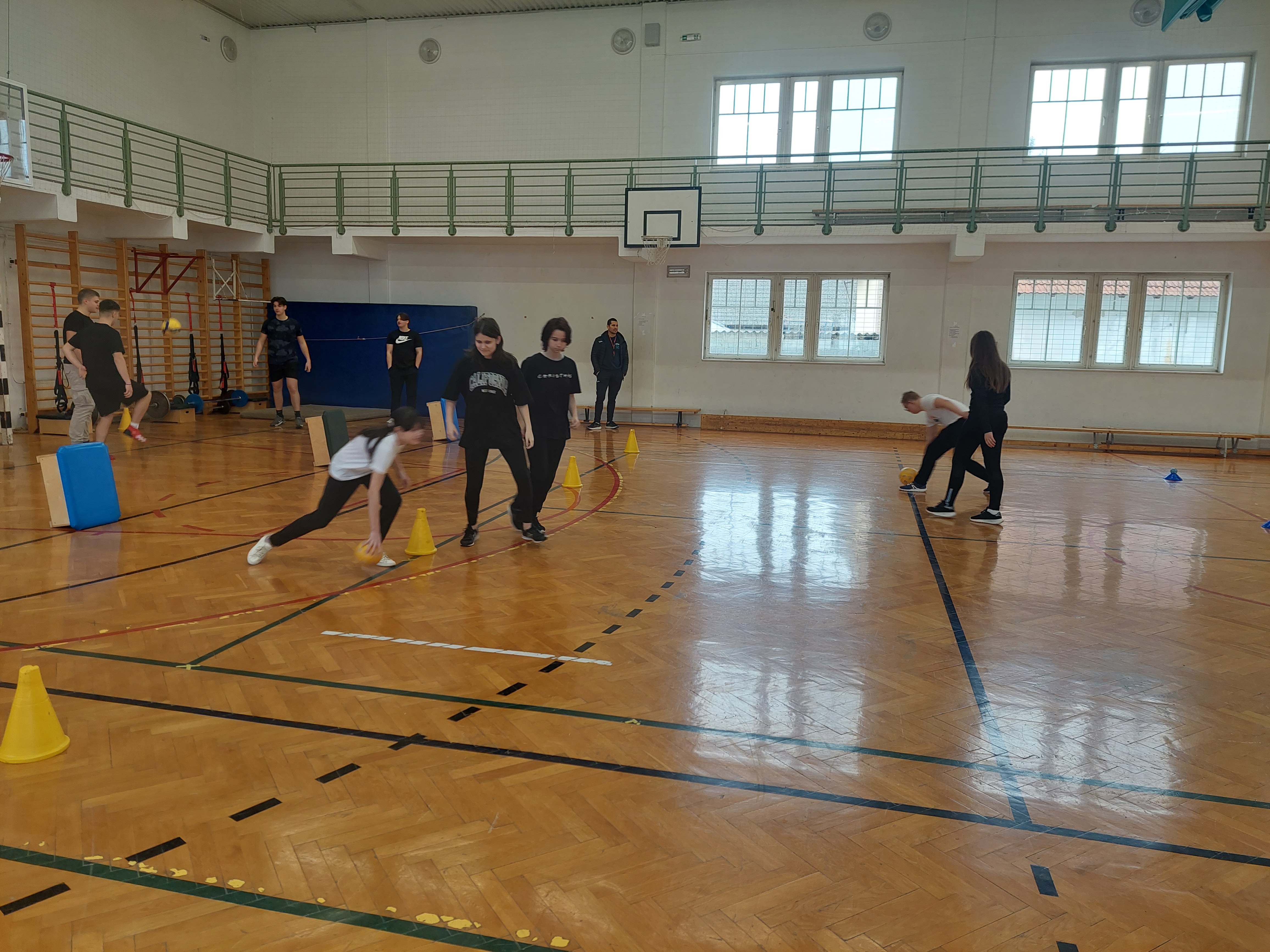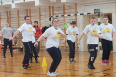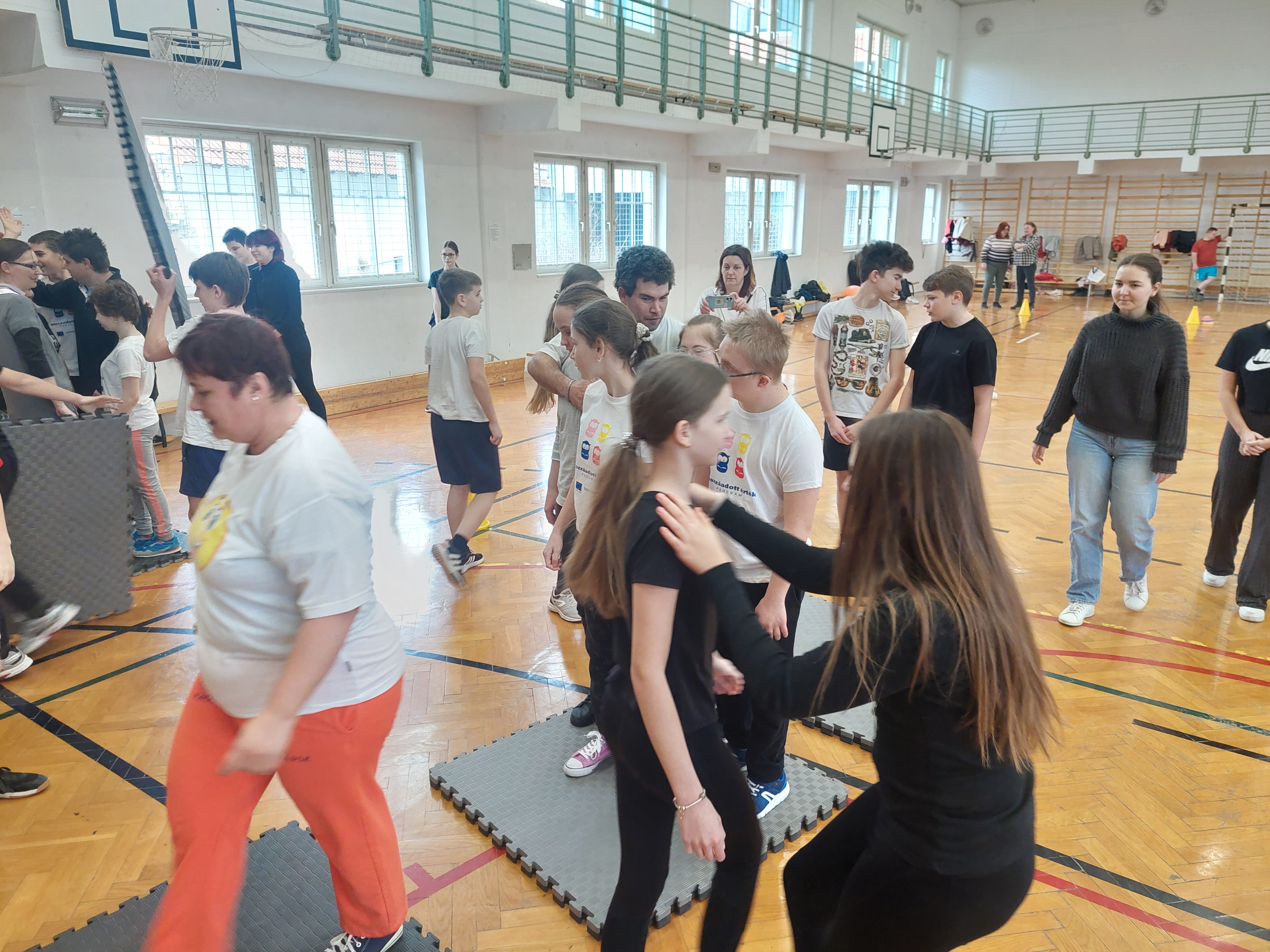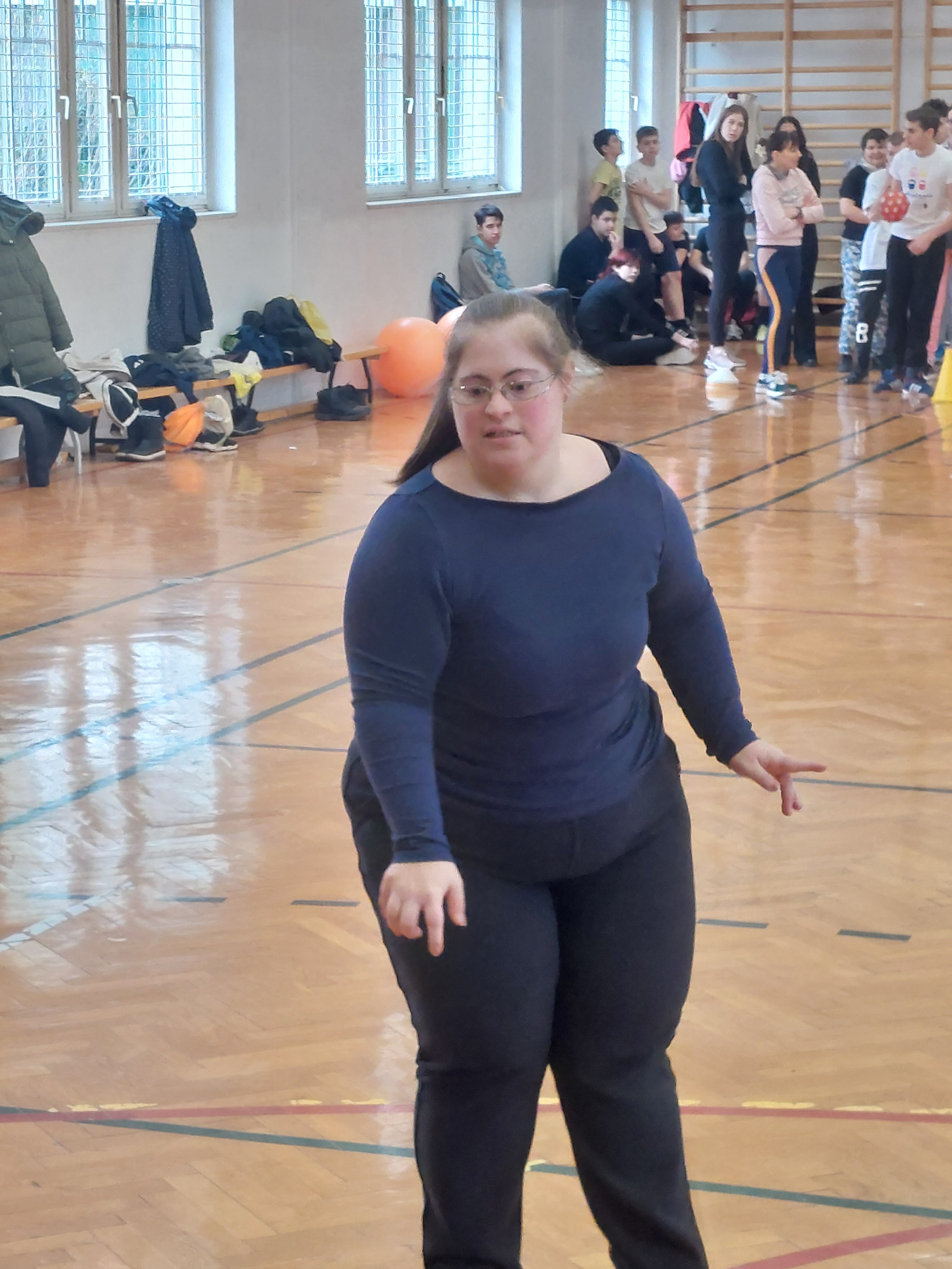 A meghívott külsős vendégeink egyenruhát hoztak. Az átöltözés és egy kis ismerkedés után zenés gimnasztikával kezdtük, bemelegítésképpen. Ezt Kátai Judit gyógytestnevelő tanárnő vezényelte.