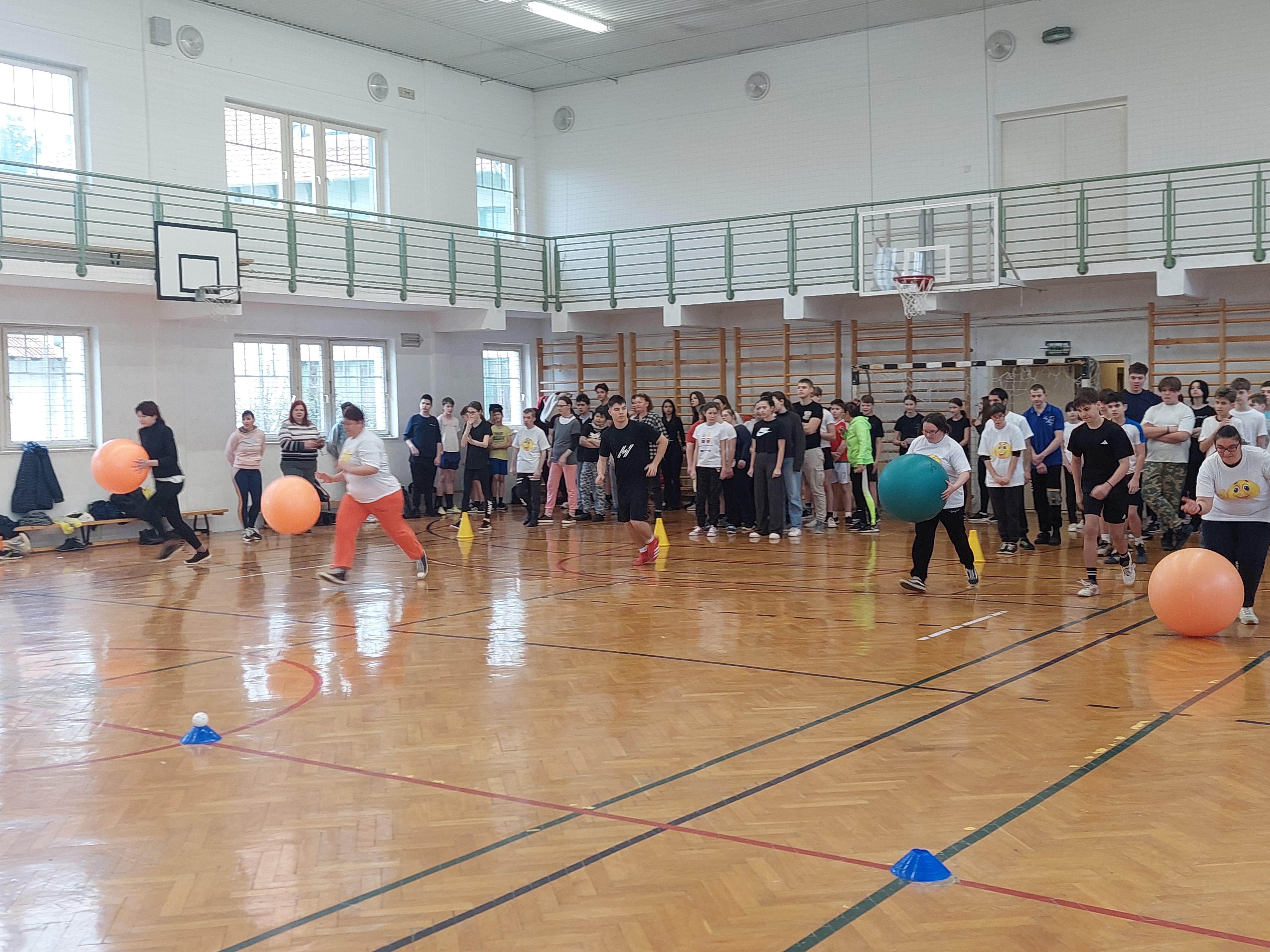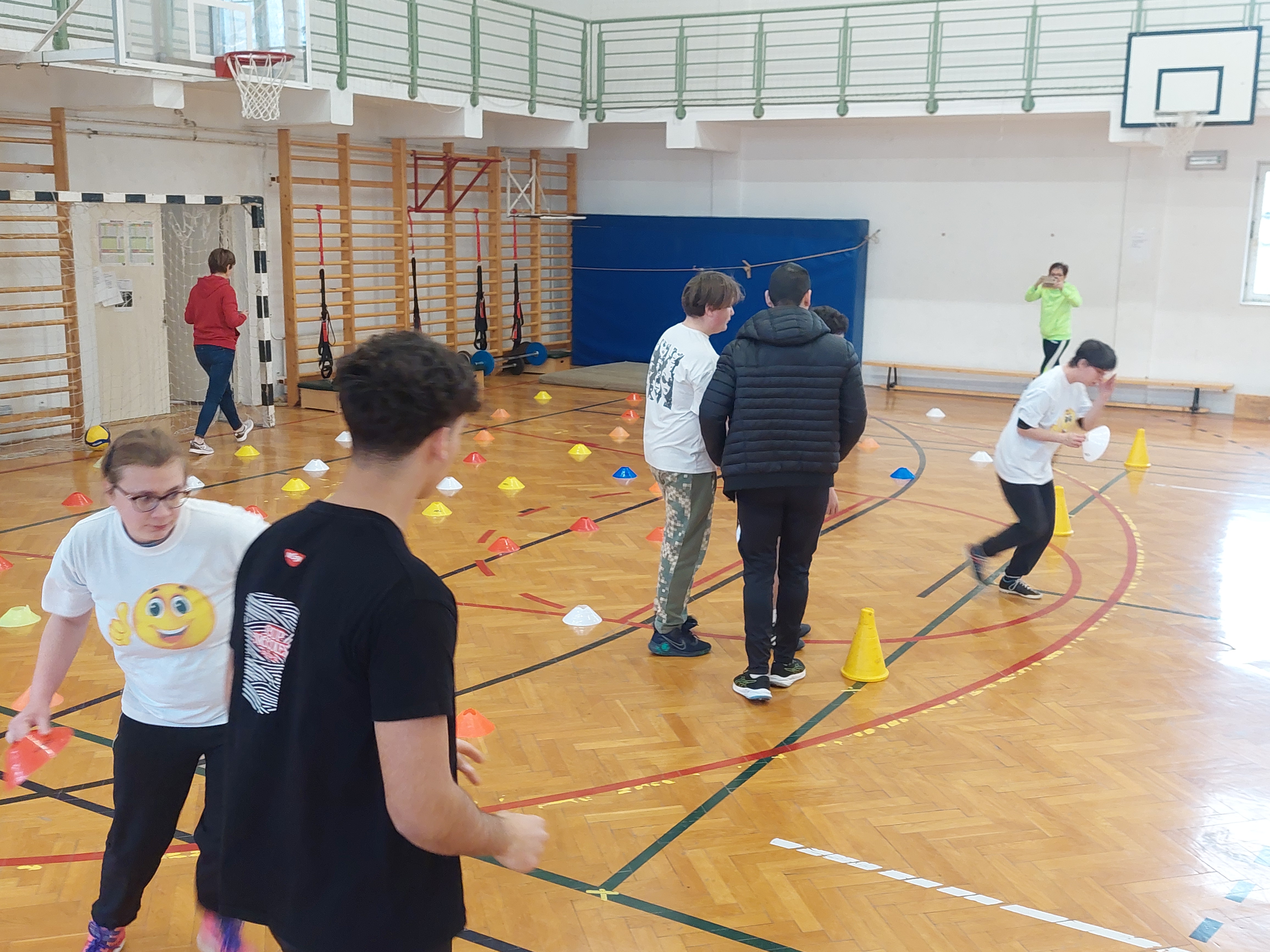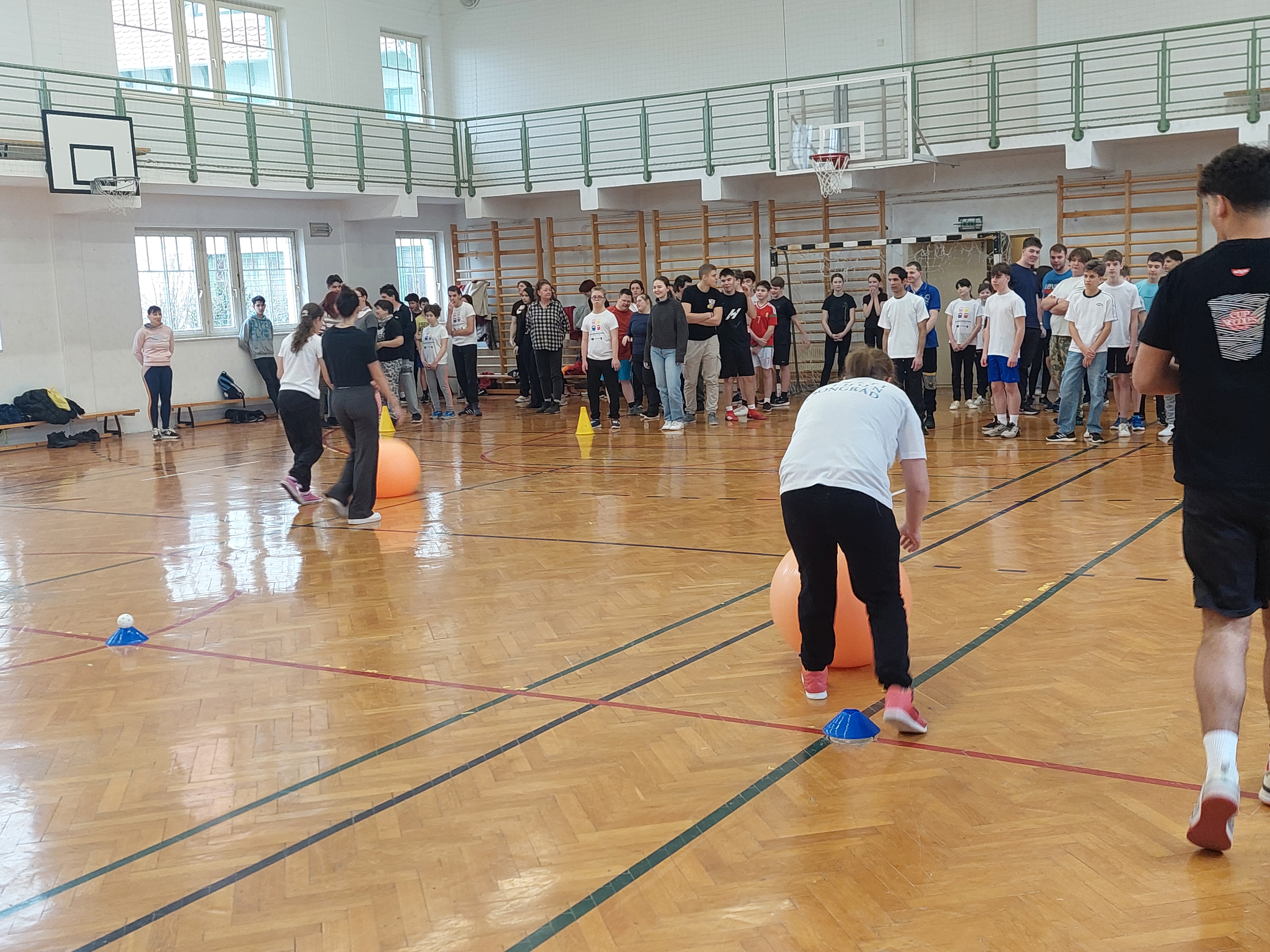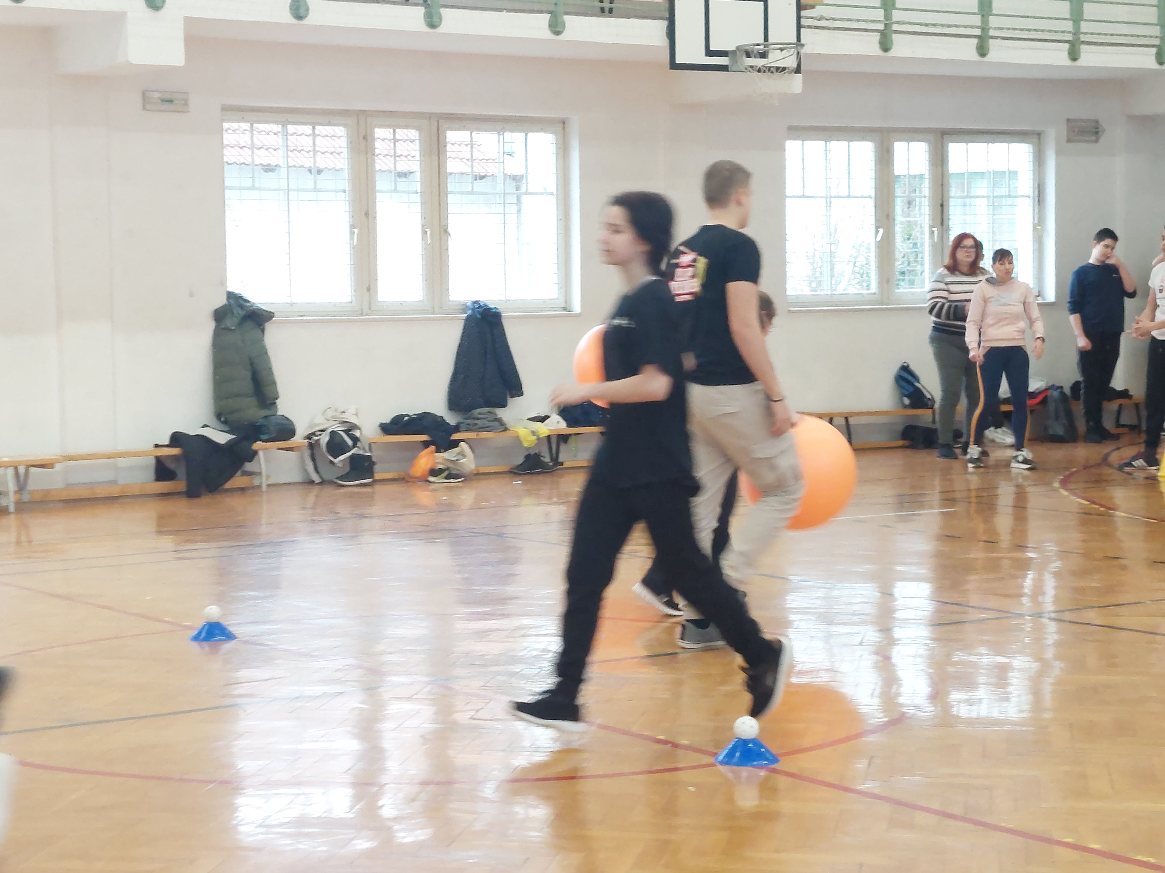 A meghívott külsős vendégeink egyenruhát hoztak. Az átöltözés és egy kis ismerkedés után zenés gimnasztikával kezdtük, bemelegítésképpen. Ezt Kátai Judit gyógytestnevelő tanárnő vezényelte.