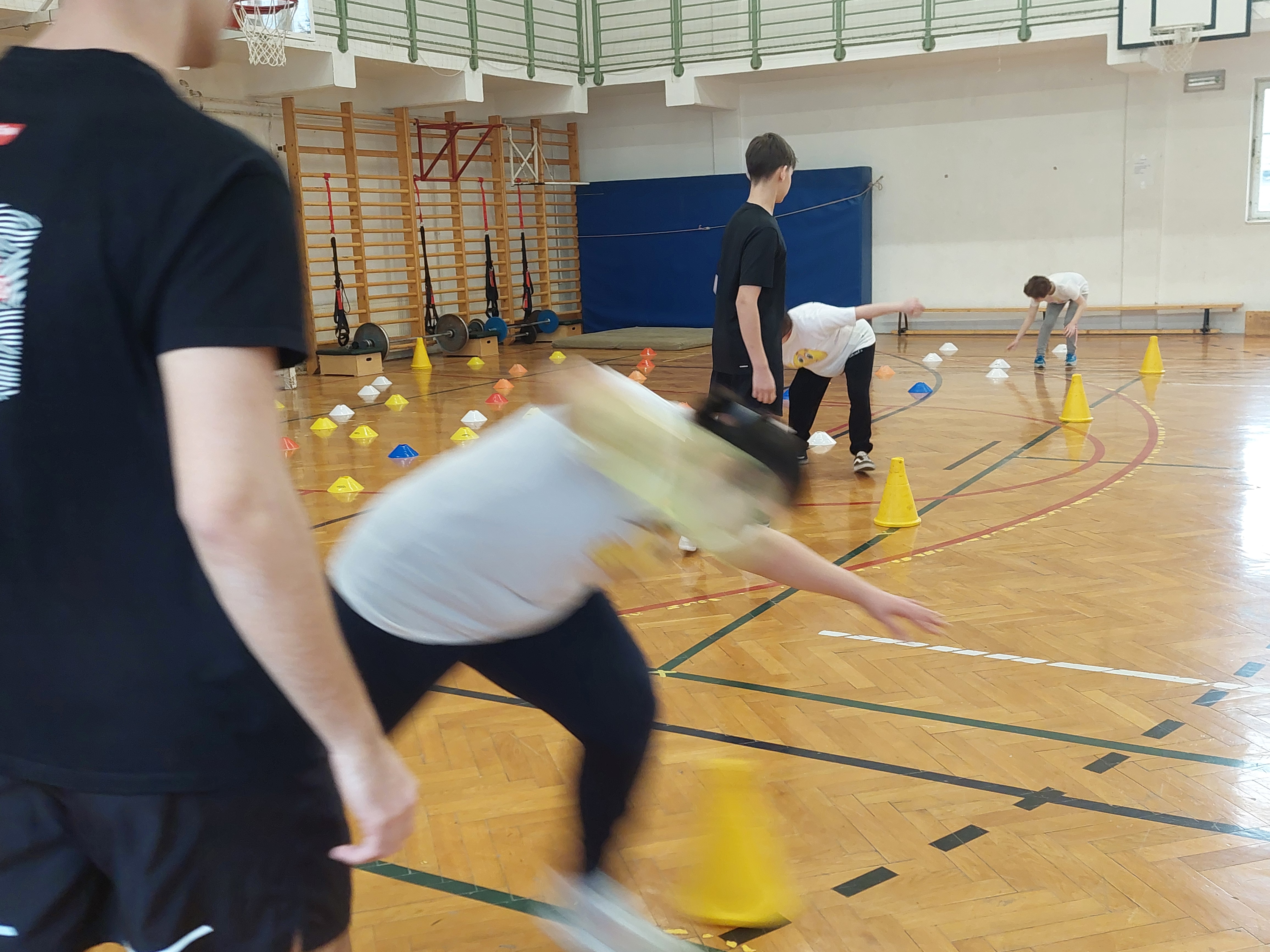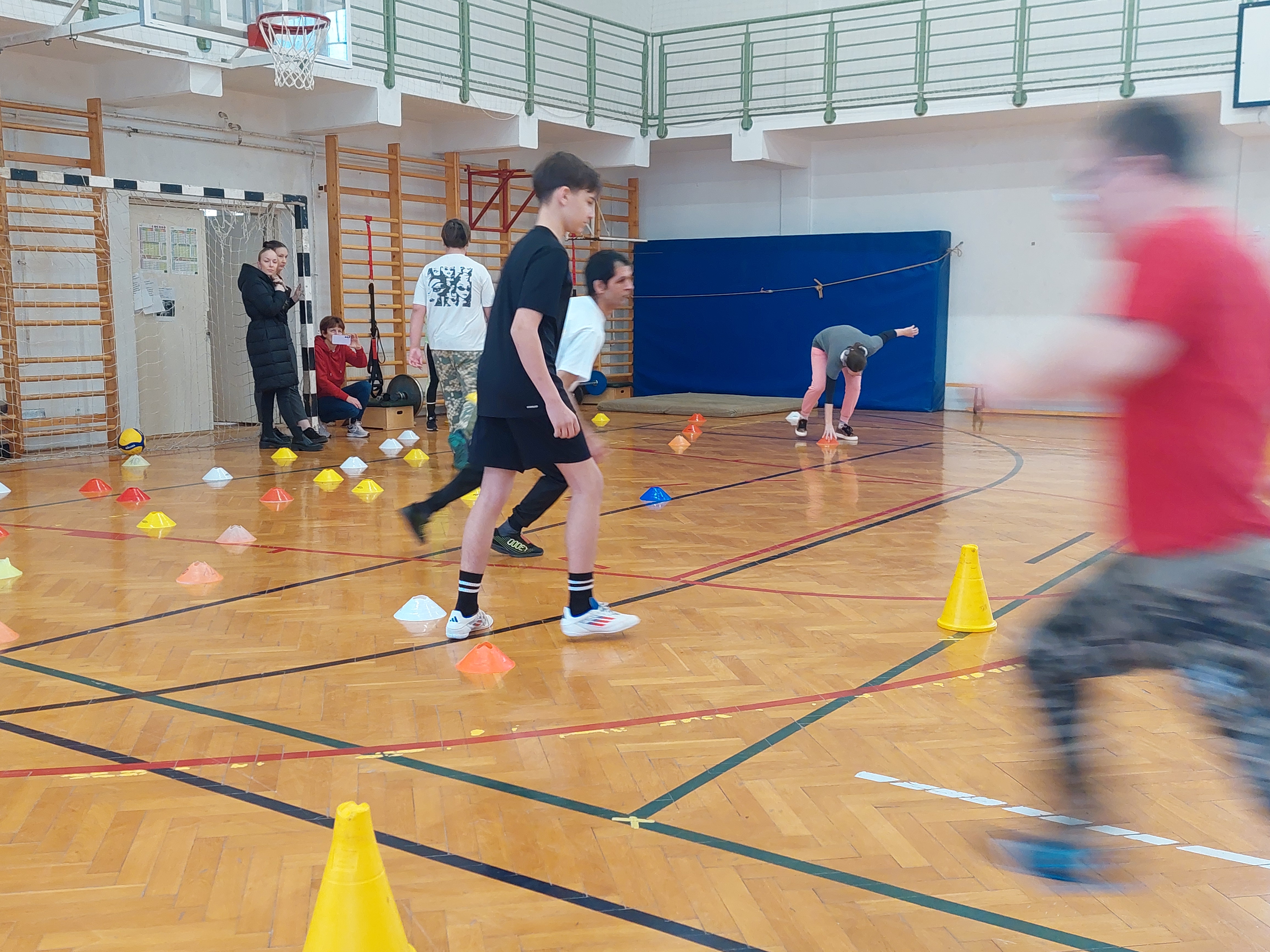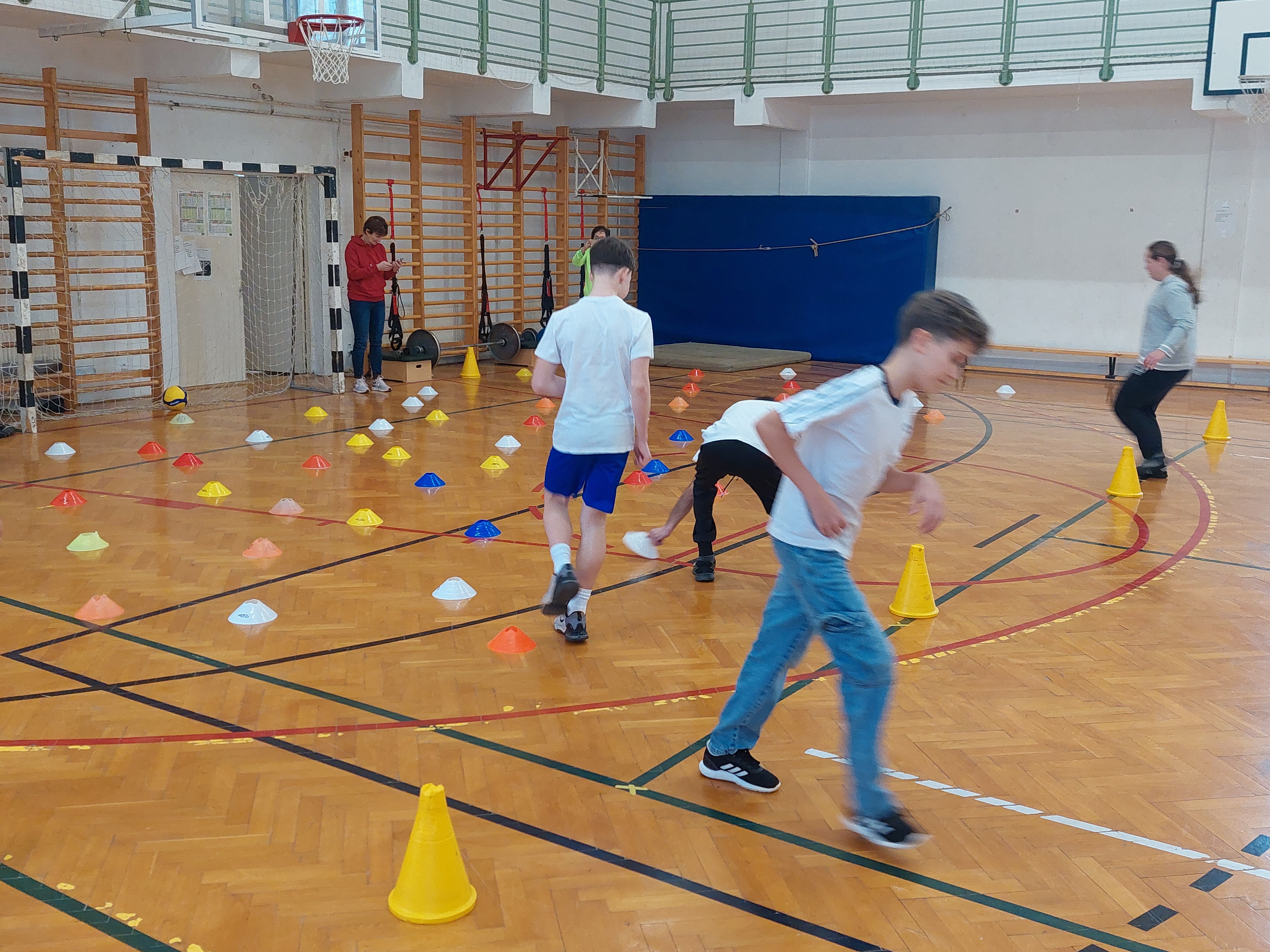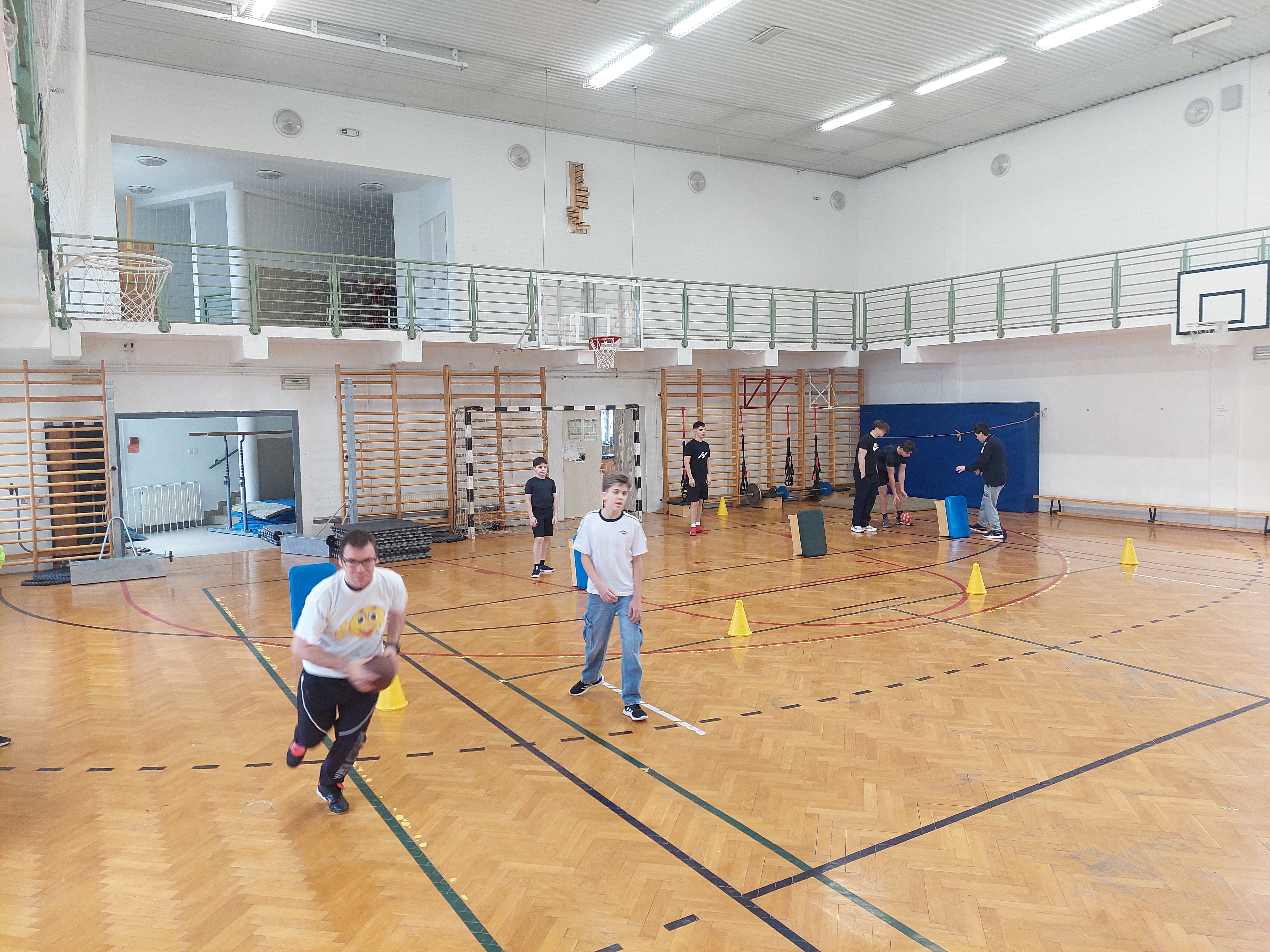 A meghívott külsős vendégeink egyenruhát hoztak. Az átöltözés és egy kis ismerkedés után zenés gimnasztikával kezdtük, bemelegítésképpen. Ezt Kátai Judit gyógytestnevelő tanárnő vezényelte.