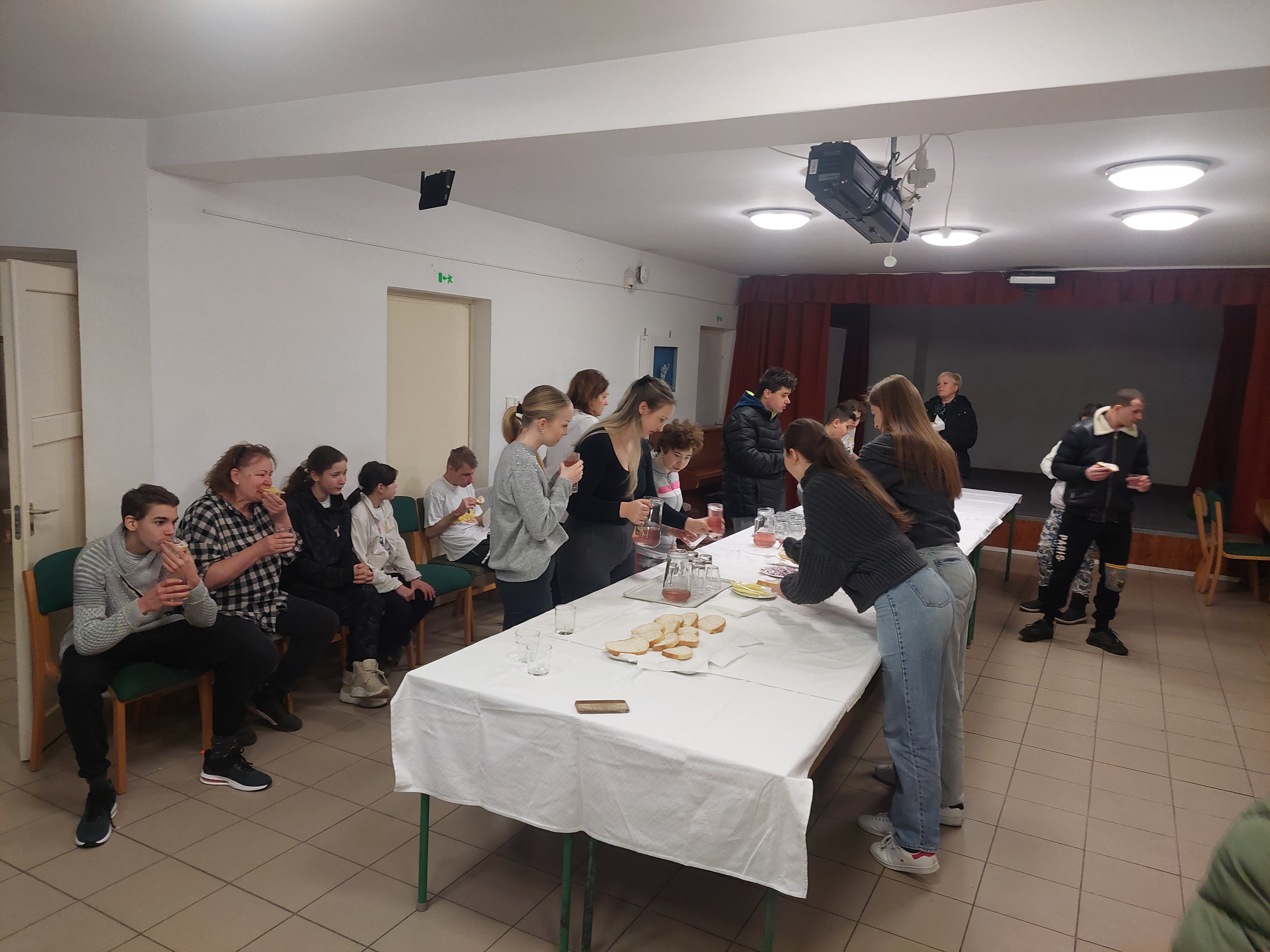 A legvégén egy kis meglepetéssel szolgáltunk a vendégeinknek és a diákjainknak. A Broadway tanteremben készítettünk zsíros kenyeret, mellé lila hagymával és paprikával. Meg persze volt finom tea is. Jólesett nekik és jóízűen elfogyasztották.