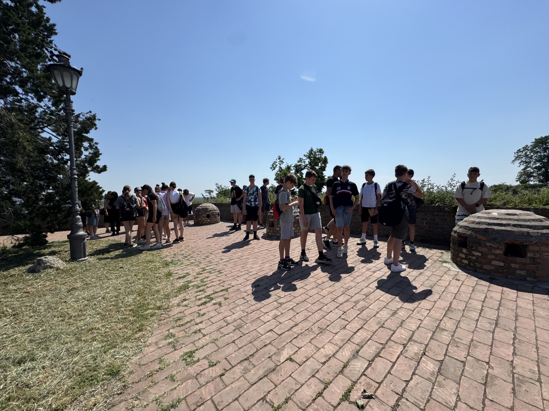 3. nap: 2025. június 5-én, kirándulásunk 3. napján kimozdultunk Óbecséről. Péterváradra utaztunk, ahol az egykori déli végvárrendszer megmaradt erődítményét látogattuk meg. A Duna fölé magasodó gyönyörű vár már messziről látható volt. Megnéztük a különleges óratornyot, a magasból csodálhattuk a várost. Körbejártuk a várat, felidéztük a történelemórán tanultakat a végvárrendszerről, valamint a várépítészetről, hiszen közelről láthattunk olasz bástyát. A legnagyobb élmény talán a vár alatt húzódó alagútrendszer, a kazamaták látogatása volt. Bár ez nem látogatható, de sikerült elérnünk, hogy egy kilométeres szakaszt megnézhettünk szerb idegenvezetővel. Béla bácsi kitűnő fordításának köszönhetően sok érdekes ismerettel gazdagodtunk a végvári katonák nehéz életéről, a föld alatti harci tevékenységről.
