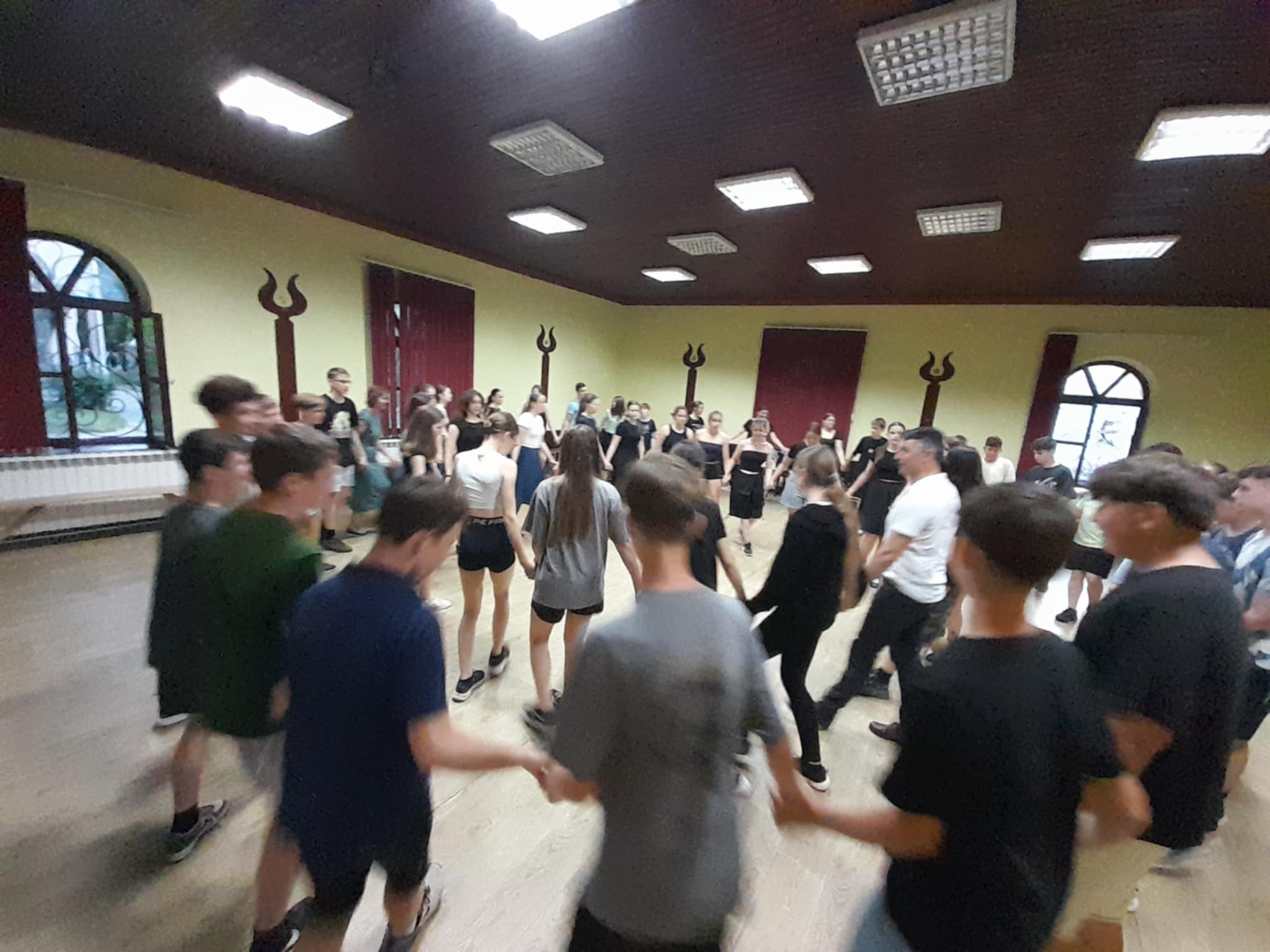 Vacsora után a Petőfi Magyar Kultúrkörbe mentünk, ahol találkoztunk Rókus Zoltán színművésszel, aki a Szabadkai Népszínház rendezője, színésze. Éppen próbát tartott a színpadosainak a kultúrkör drámafoglalkozásán. Röviden bemutatta a színpadot, az alkotás folyamatát. Megnézhettük a bemutató előtt álló előadást (amely azóta már meg is történt), majd közös fotót készítettünk. Átadtuk ajándékainkat a színpadosoknak. Taricska Mira méhecskéket horgolt, illetve könyvekkel kedveskedtünk, valamint a Batsányi János Gimnázium pólóját adtuk át Zolinak a látogatás emlékére.