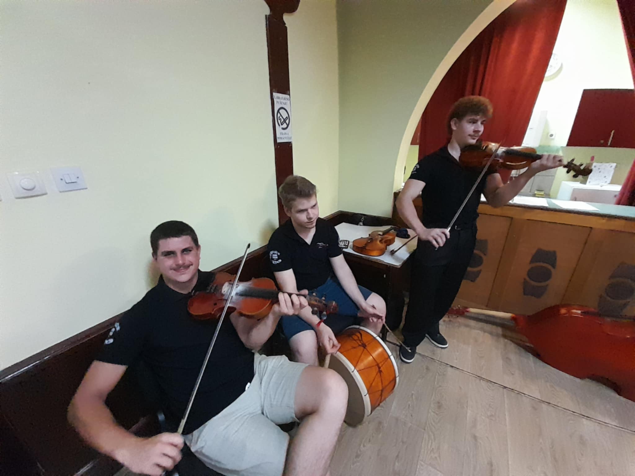 Vacsora után a Petőfi Magyar Kultúrkörbe mentünk, ahol találkoztunk Rókus Zoltán színművésszel, aki a Szabadkai Népszínház rendezője, színésze. Éppen próbát tartott a színpadosainak a kultúrkör drámafoglalkozásán. Röviden bemutatta a színpadot, az alkotás folyamatát. Megnézhettük a bemutató előtt álló előadást (amely azóta már meg is történt), majd közös fotót készítettünk. Átadtuk ajándékainkat a színpadosoknak. Taricska Mira méhecskéket horgolt, illetve könyvekkel kedveskedtünk, valamint a Batsányi János Gimnázium pólóját adtuk át Zolinak a látogatás emlékére.