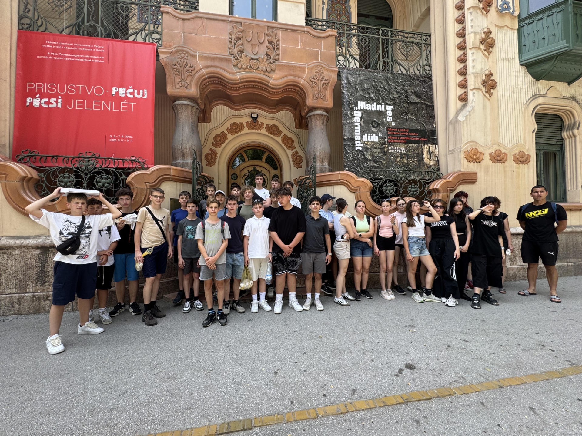 4. nap: Kirándulásunk utolsó napja 2025. június 6-a volt. Reggeli után összecsomagoltunk, és elindultunk az utolsó állomás, Szabadka felé. Ezt a napot izgatottan várták a gyerekek, mert a helyi, regionális kereskedelembe pillanthattunk bele a szabadkai piacon, a híres „Buvljak”-on. Három csoportba osztottuk a gyerekeket a három kísérő nevelő vezetésével. Így tudtunk nekik segíteni a vásárlásban, amibe nagyon gyorsan belejöttek, élvezték a hatalmas piacot. Délben elfogyasztottuk az úticsomagunkat, majd sétára indultunk Szabadka központi részében. Beszélgettünk Kosztolányi Dezsőről, felidéztük Szabadkához kötődő élményeit.