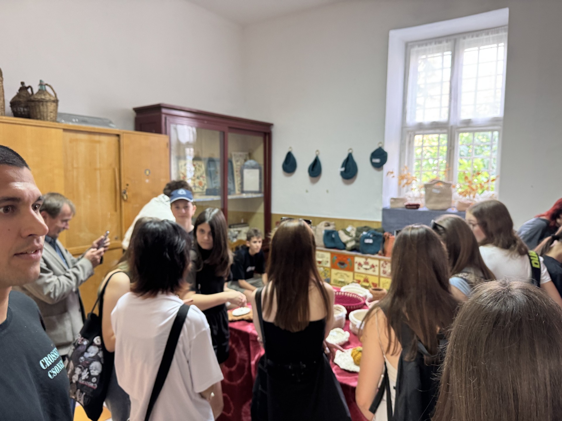 A gyors határátlépésnek köszönhetően időben érkeztünk Zentára, ahová az első nap programjait szerveztük. A városi sportcsarnoknál parkoltunk, majd gyalog indultunk a városba. Először Sólya Bálint kézművesmester műhelyében jártunk.  A gyerekek két csoportba kerültek, s az egyik fele a fazekasmester és munkatársai által gondozott múzeumi részben nézték meg a helyi kézművescsoportok által készített tárgyakat. Kipróbálhatták hogyan készítették régen elő az anyagot a hímzéshez. A csoport másik fele Sólya Bálint és kolléganője segítségével, iránymutatásával az agyagozással ismerkedett. Készítettünk egy szívet szépen feldíszítve, amit majd kiégetnek számunkra, és később a gyerekek megkapják ezt a saját maguk által készített terméket. Nagyon lelkesen zajlott a műhelyben a munka, mindenki igyekezett a legszebbet alkotni.