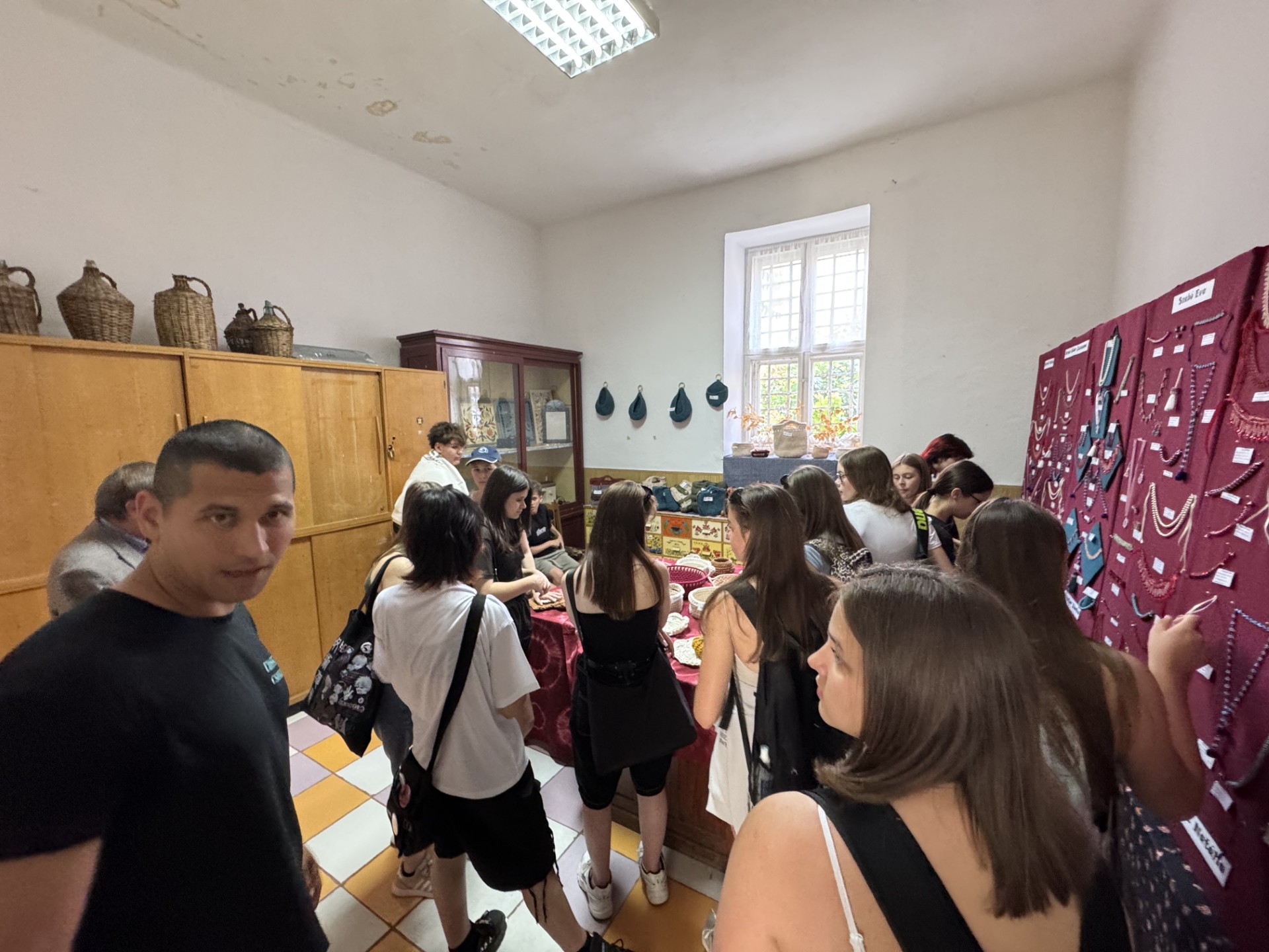 A gyors határátlépésnek köszönhetően időben érkeztünk Zentára, ahová az első nap programjait szerveztük. A városi sportcsarnoknál parkoltunk, majd gyalog indultunk a városba. Először Sólya Bálint kézművesmester műhelyében jártunk.  A gyerekek két csoportba kerültek, s az egyik fele a fazekasmester és munkatársai által gondozott múzeumi részben nézték meg a helyi kézművescsoportok által készített tárgyakat. Kipróbálhatták hogyan készítették régen elő az anyagot a hímzéshez. A csoport másik fele Sólya Bálint és kolléganője segítségével, iránymutatásával az agyagozással ismerkedett. Készítettünk egy szívet szépen feldíszítve, amit majd kiégetnek számunkra, és később a gyerekek megkapják ezt a saját maguk által készített terméket. Nagyon lelkesen zajlott a műhelyben a munka, mindenki igyekezett a legszebbet alkotni.