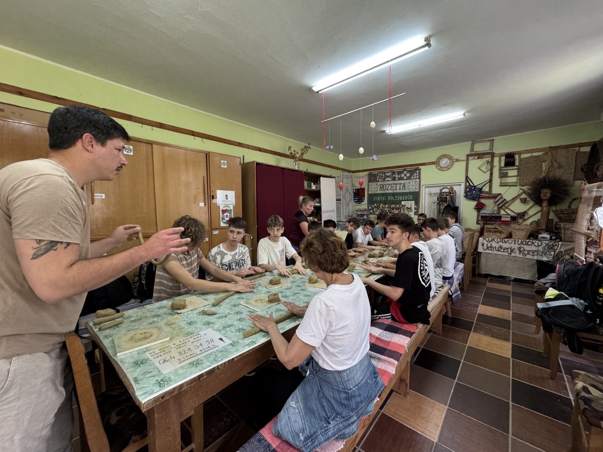 A gyors határátlépésnek köszönhetően időben érkeztünk Zentára, ahová az első nap programjait szerveztük. A városi sportcsarnoknál parkoltunk, majd gyalog indultunk a városba. Először Sólya Bálint kézművesmester műhelyében jártunk.  A gyerekek két csoportba kerültek, s az egyik fele a fazekasmester és munkatársai által gondozott múzeumi részben nézték meg a helyi kézművescsoportok által készített tárgyakat. Kipróbálhatták hogyan készítették régen elő az anyagot a hímzéshez. A csoport másik fele Sólya Bálint és kolléganője segítségével, iránymutatásával az agyagozással ismerkedett. Készítettünk egy szívet szépen feldíszítve, amit majd kiégetnek számunkra, és később a gyerekek megkapják ezt a saját maguk által készített terméket. Nagyon lelkesen zajlott a műhelyben a munka, mindenki igyekezett a legszebbet alkotni.