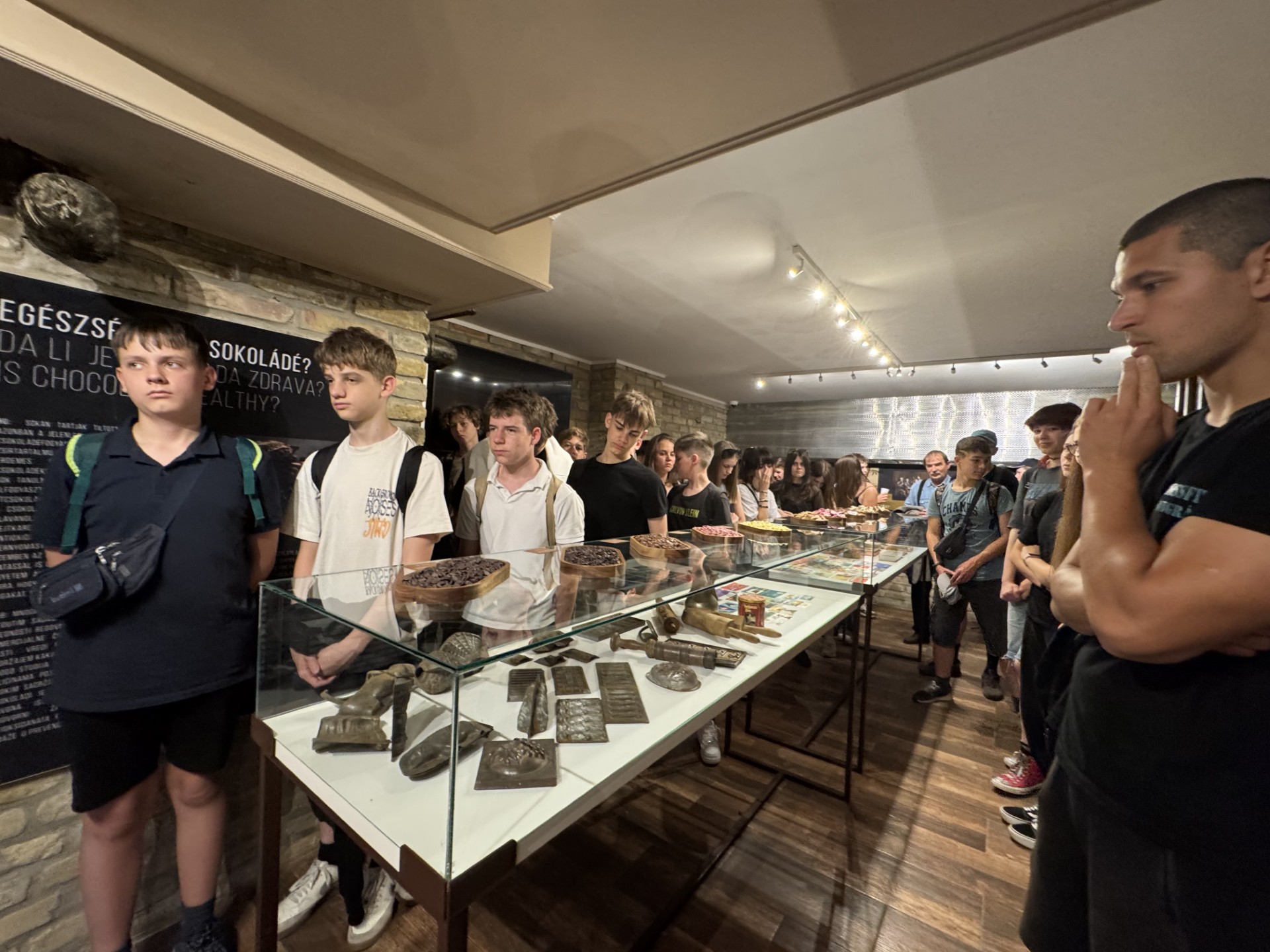 Az érdekes foglalkozás után sétánkat Zenta központja felé folytattuk. A gyönyörű főtér mindenkinek tetszett. A Réel Csokoládémanufaktúra múzeumában megkóstolhattuk a legfinomabb csokoládékat. Mindenki talált valami kedvére való finomságot. A kóstoló nemcsak a legkülönlegesebb csokoládékat jelentette (100%-os étcsokoládé), de a manufaktúra híres, különleges terméke is asztalon volt, a sóskaramellás csokoládé. A múzeum érdekessége, hogy a tulajdonosmester elkészítette csokoládéból a zentai Városháza makettjét. Filmvetítés tette még érdekesebbé az idegenvezetést a csokoládéfogyasztás történelméről, jelenéről.