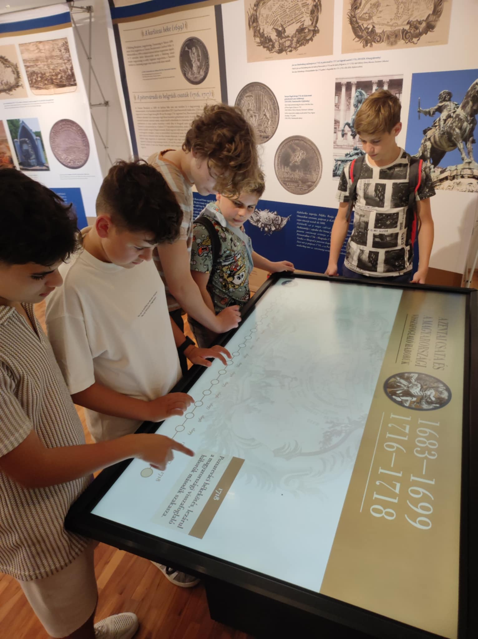 Ezután a Városházát tekintettük meg. Meséltek nekünk Zenta város történetéről, a zentai csatáról. A vezetőnk segítségével felkapaszkodott a társaság a kilátóba, ahol a zentai csata emlékére berendezett kiállítás várt bennünket. A fiúk különösen nagy érdeklődést mutattak a fegyverek iránt.