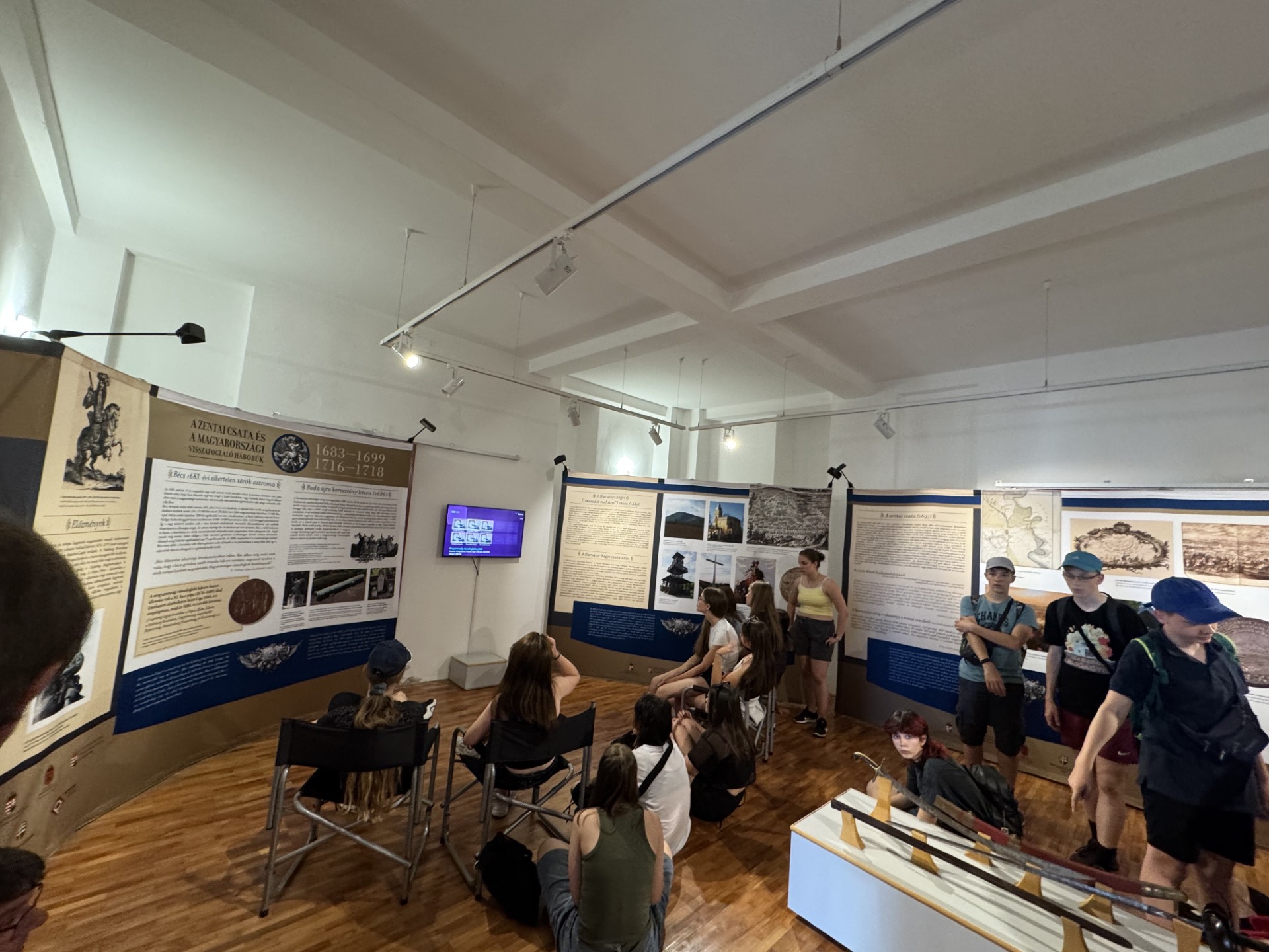 Ezután a Városházát tekintettük meg. Meséltek nekünk Zenta város történetéről, a zentai csatáról. A vezetőnk segítségével felkapaszkodott a társaság a kilátóba, ahol a zentai csata emlékére berendezett kiállítás várt bennünket. A fiúk különösen nagy érdeklődést mutattak a fegyverek iránt.