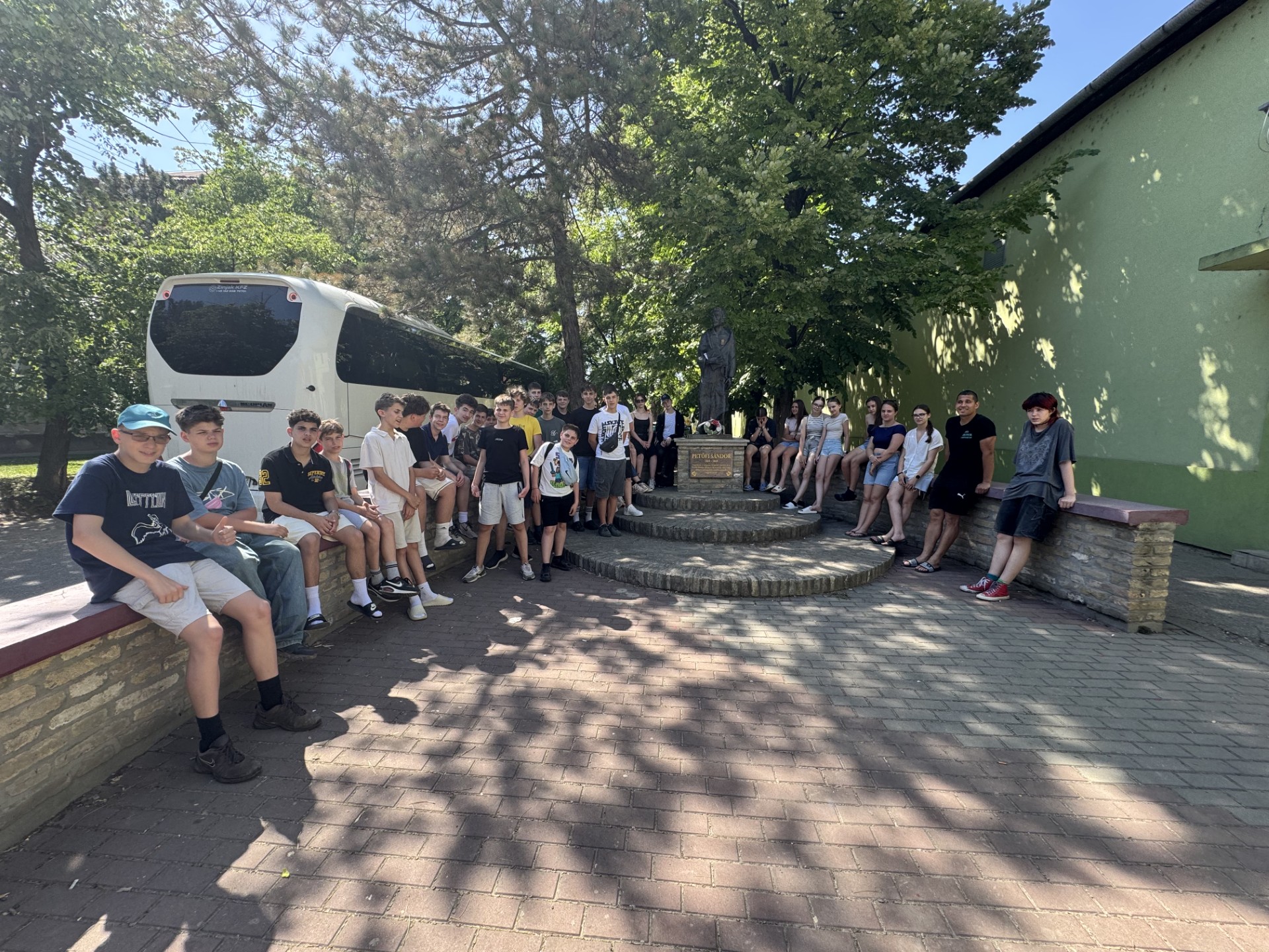 4. nap: Kirándulásunk utolsó napja 2025. június 6-a volt. Reggeli után összecsomagoltunk, és elindultunk az utolsó állomás, Szabadka felé. Ezt a napot izgatottan várták a gyerekek, mert a helyi, regionális kereskedelembe pillanthattunk bele a szabadkai piacon, a híres „Buvljak”-on. Három csoportba osztottuk a gyerekeket a három kísérő nevelő vezetésével. Így tudtunk nekik segíteni a vásárlásban, amibe nagyon gyorsan belejöttek, élvezték a hatalmas piacot. Délben elfogyasztottuk az úticsomagunkat, majd sétára indultunk Szabadka központi részében. Beszélgettünk Kosztolányi Dezsőről, felidéztük Szabadkához kötődő élményeit.