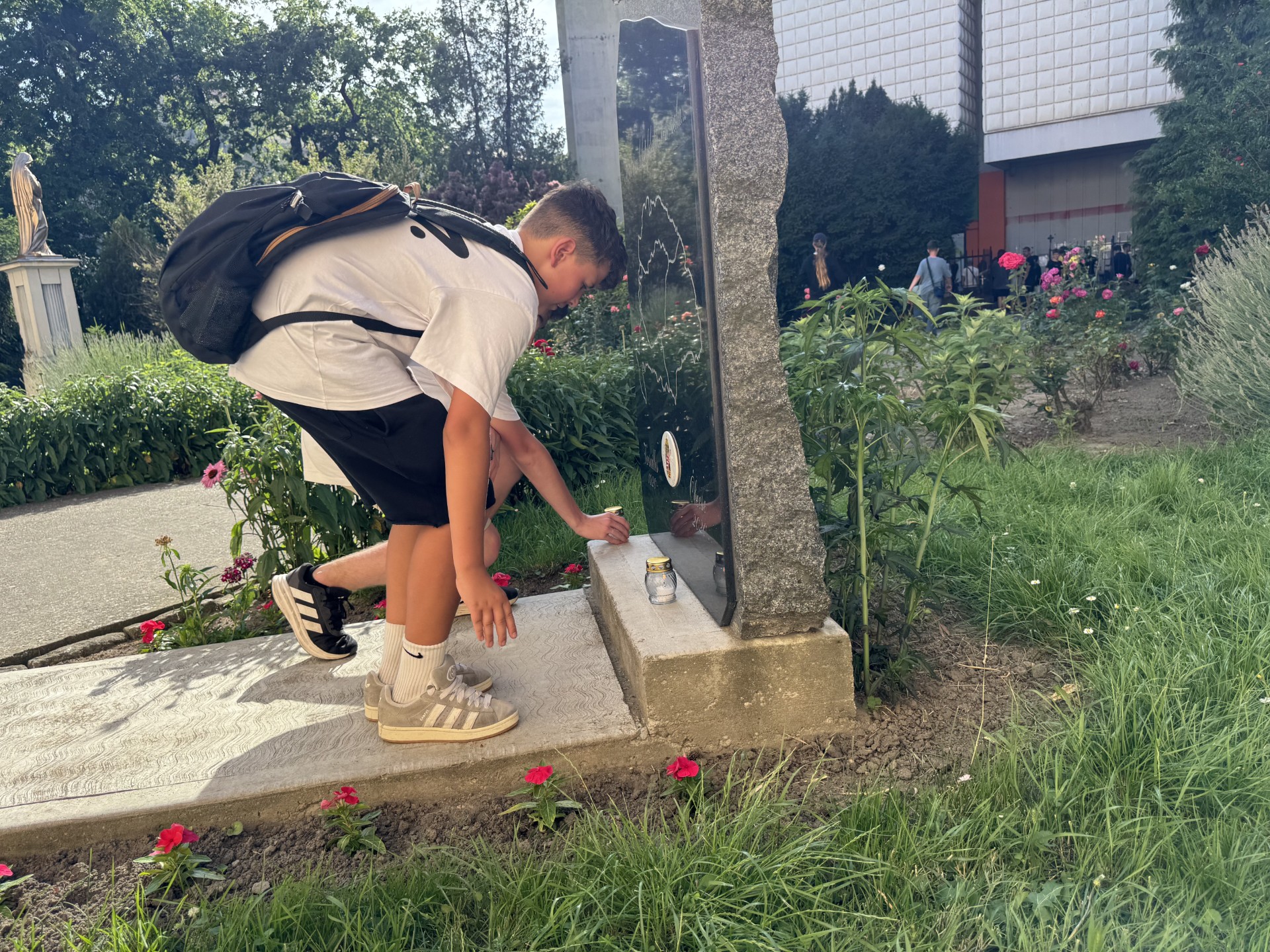 Június 4. a Nemzeti Összetartozás Napja, amikor a kegyetlen 1920-as békediktátumra emlékezünk. Visszatérve a városba a főtérre indultunk, ahol a templom kertjében áll a Trianonra emlékeztető jelképes sír. Rövid műsorral készültünk. Ujszászi János verset mondott (Móra Ferenc: Pásztorköszöntő a kiskőrösi jászolnál). Majd az emlékezés mécseseit helyeztük el. Mi voltunk, akik még időben is szinte igazodtunk a közel fél ötös egykori aláírási időhöz. A városi megemlékezés itt 8-án volt. Főhajtással tisztelegtünk elődeink előtt.