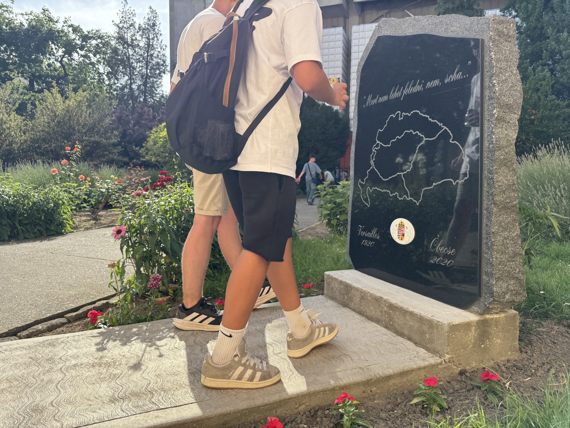 Június 4. a Nemzeti Összetartozás Napja, amikor a kegyetlen 1920-as békediktátumra emlékezünk. Visszatérve a városba a főtérre indultunk, ahol a templom kertjében áll a Trianonra emlékeztető jelképes sír. Rövid műsorral készültünk. Ujszászi János verset mondott (Móra Ferenc: Pásztorköszöntő a kiskőrösi jászolnál). Majd az emlékezés mécseseit helyeztük el. Mi voltunk, akik még időben is szinte igazodtunk a közel fél ötös egykori aláírási időhöz. A városi megemlékezés itt 8-án volt. Főhajtással tisztelegtünk elődeink előtt.