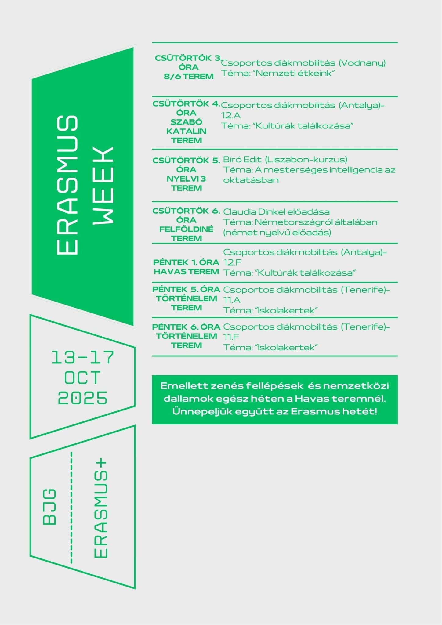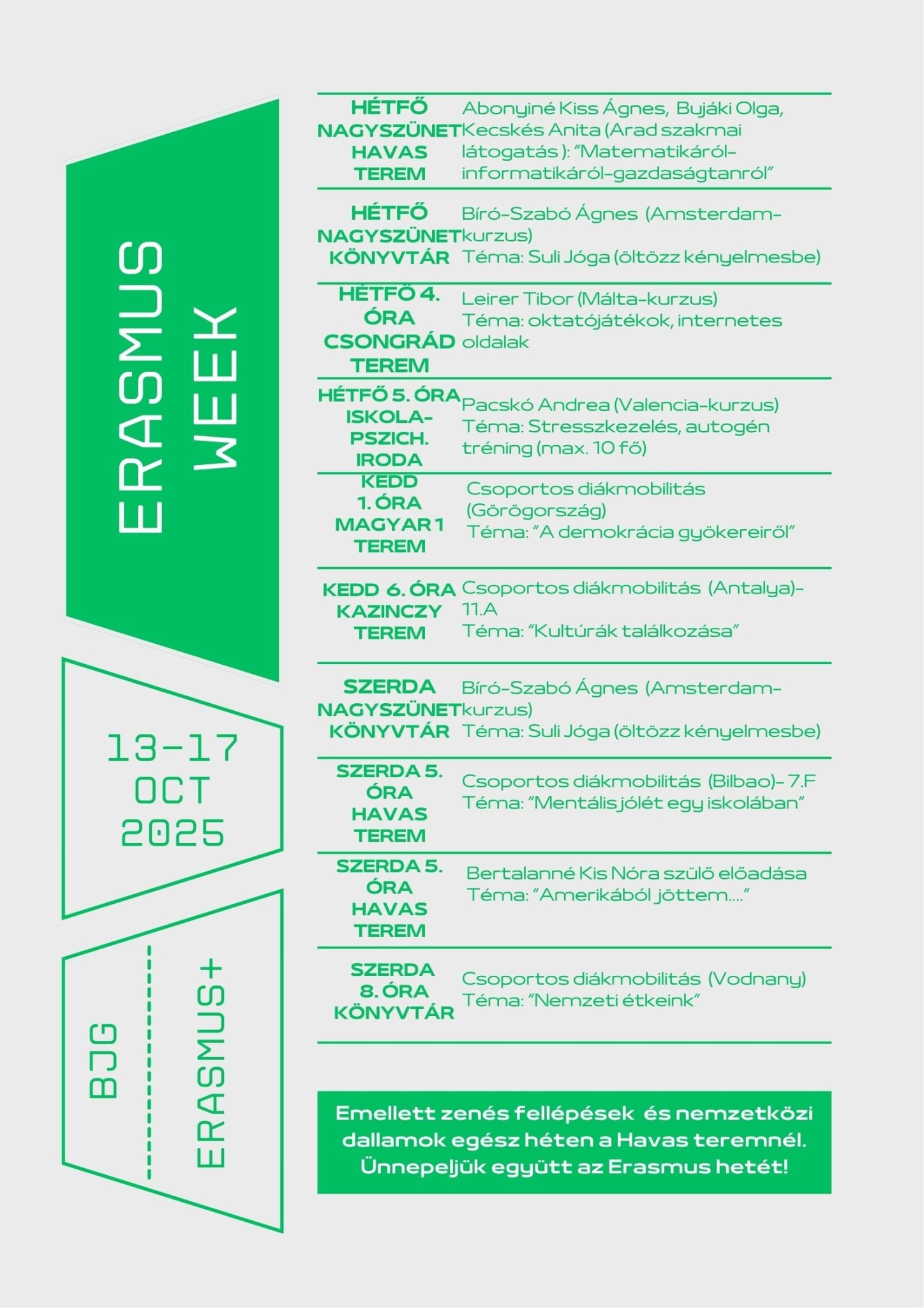 Iskolánk ebben a tanévben is megrendezte hagyományos Erasmus-hetét, amelynek célja az európai együttműködés, a nemzetközi projektek és a diákok mobilitási lehetőségeinek bemutatása volt. A hét során rendkívül sokszínű és tartalmas programokon vehettek részt tanulóink: kurzusokról, szakmai látogatásokról és külföldi tanulmányutakról hallgathattak előadásokat, illetve meghívott vendégelőadókat is üdvözölhettünk.