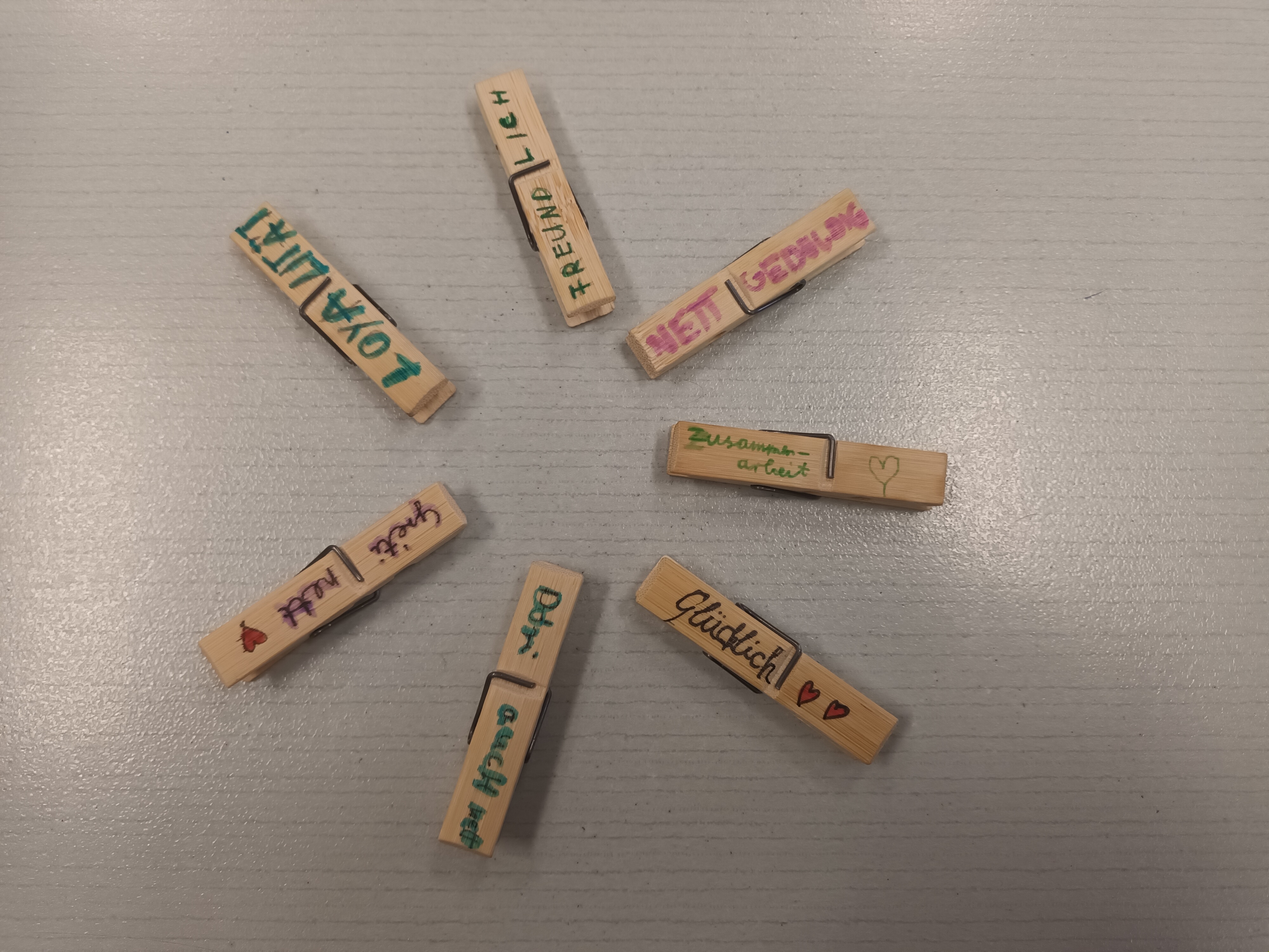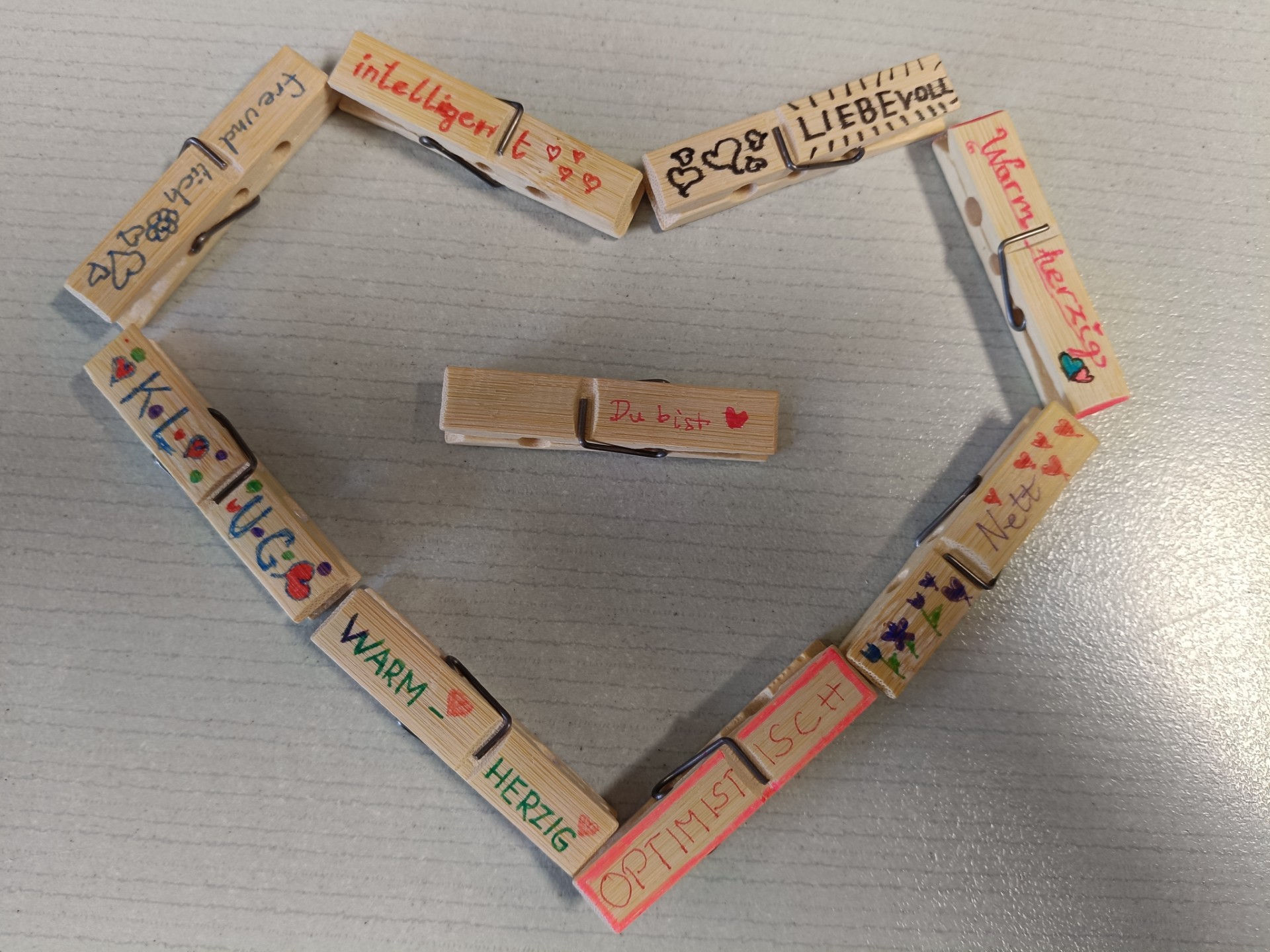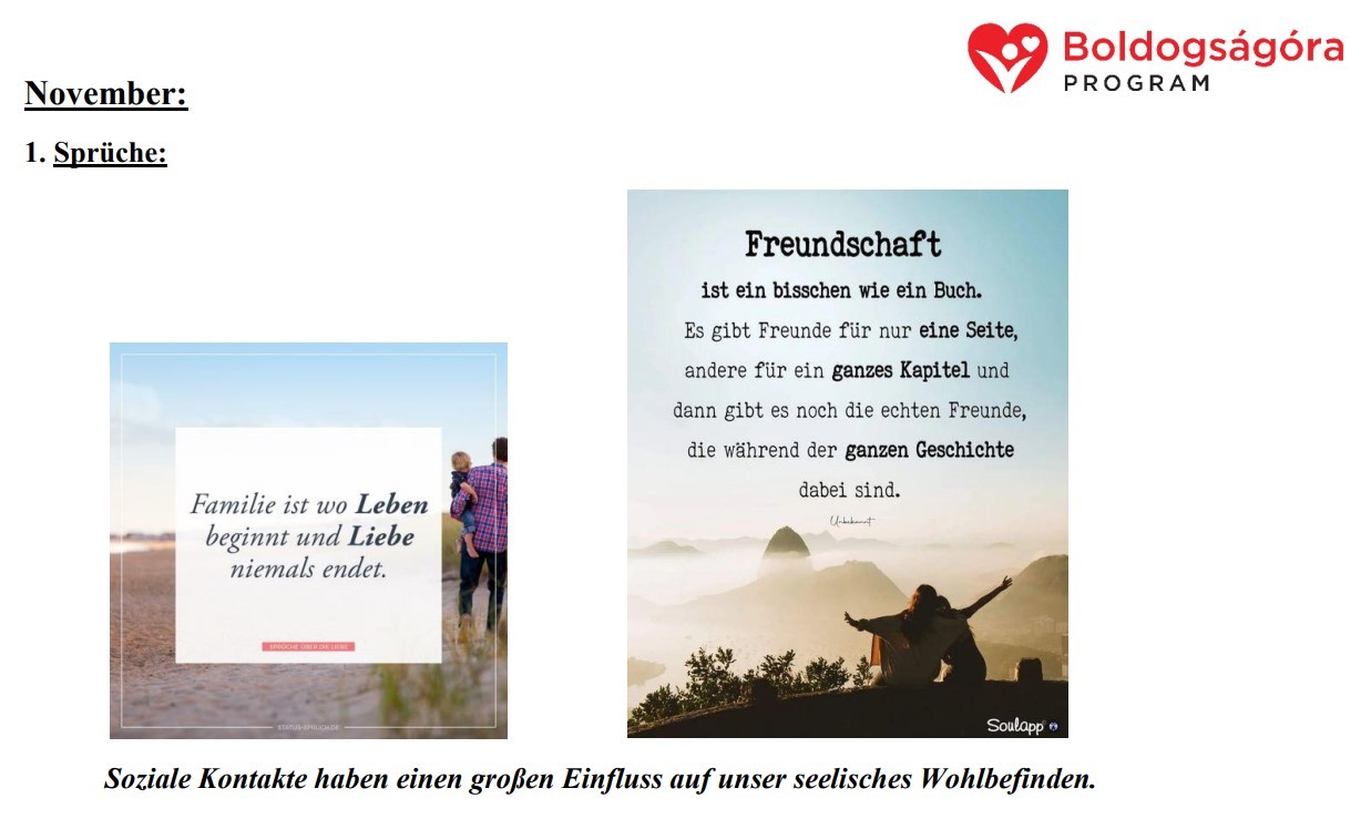 Kovácsné Baranyi Margit tanárnő – 11.f német óra: A novemberi boldogságóránk témája a „Társas kapcsolatok ápolása” volt. Az órát most is egy szórejtvénnyel kezdtük, hiszen a tanulóknak ki kellett találniuk három kivetített kép segítségével a hónap témáját németül („Soziale Kontakte”). Egy kis segítséggel sikerült is megfejteniük a rejtvényt. Kiosztottam az órához készített feladatlapot, majd elolvastunk, és lefordítottunk két idézetet a család és a barátság fontosságáról. Megállapítottuk, hogy mindkettő nagyban hozzájárul ahhoz, hogy lelkileg is jól érezzük magunkat. Az órát egy játékkal folytattuk, hogy a csoport tagjai jobban megismerjék egymást. A csoporton belül olyan személyt kellett keresniük, aki például szeret német zenét hallgatni, fél a pókoktól, hangszeren játszik, vagy szívesen süt süteményt. Ahhoz, hogy a megfelelő információhoz jussanak, kommunikálniuk kellett egymással. Ügyesen megoldották a feladatot, és sok mindent kiderítettek egymásról. Az órát egy kreatív feladattal zártuk. Mindenki választott a feladatlapról egy pozitív belső tulajdonságot, amit németül ráírt egy csipeszre (pl.: Du bist warmherzig/kreativ/liebevoll…). Azt kértem tőlük, hogy az elkészült csipeszekből alkossanak egy formát. Végül közös megegyezéssel egy szívformát alakítottak ki. A csipeszt óra végén hazavitték, és megbeszéltük, hogy egy olyan számukra kedves személynek ajándékozzák, akire illik a csipeszre felírt tulajdonság.