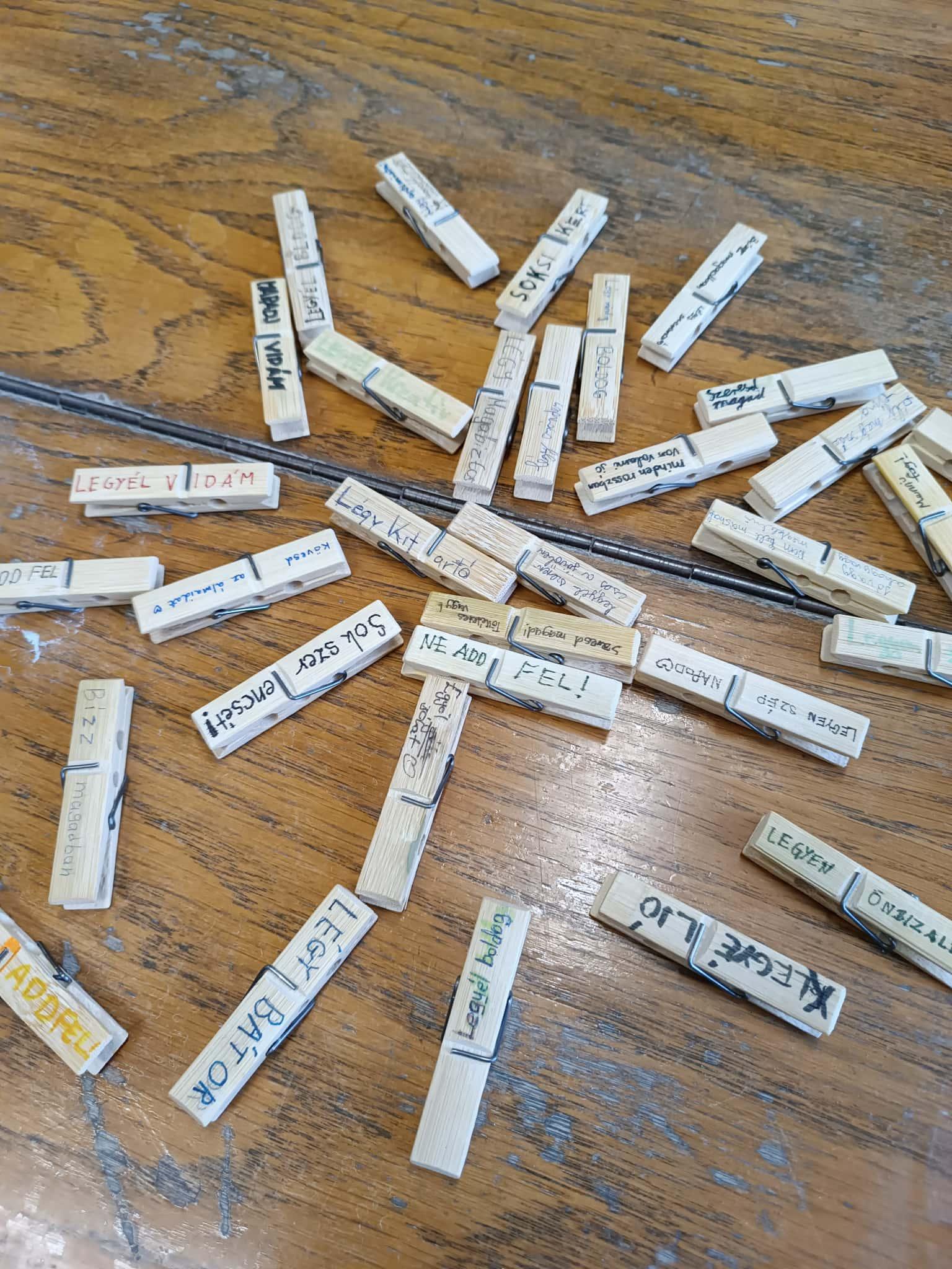Rideg-Fekete Márta angol óra – 11.a osztály: A november hónap folyamán többféle feladattal is igyekeztünk a csoportdinamikát fejleszteni, a társas kapcsolatainkat erősíteni. A csipeszes feladatot mi is megcsináltuk a csoporttal (ezt a feladatot minden csoport megkapta előzetes feladatként, hogy iskolai szinten is legyen közös kihívás, a közösség érzését erősítve ezzel), amely feladat során kedves üzeneteket kellett rajzolni/írni pár szóban valakinek, akinek utána angolul is el kellett mondani, hogy miért is ő kapta ezt a kis meglepetést. Egy különleges feladatot is adtam a csoportnak, mégpedig azt, hogy a folyosóról válasszanak ki egy batsányis diákok által festett széket (Almási Mariann kolléganő szakmai koordinálásával ezeket már korábban elkészítették diákjaink), amelyre leülve kellett angolul felidézniük és elmesélniük egymásnak egy korábbi kellemes élményüket, amelyben valaki segített nekik és jó érzésekkel emlékeznek vissza erre a történetre. Ezekkel a feladatokkal is gyakoroltuk az aktív idegen nyelv használatát, ugyanakkor kicsit érdekesebb órát is tarthattam diákjaimnak. Elmondásuk szerint, érdekesebb volt így a tanóra. Meglepetésként én is kaptam a laptop táskámra egy csipeszt német gondolattal (melegszívű) Kovácsné tanárnőtől, ami igazán különleges meglepetés volt a számomra. 🙂