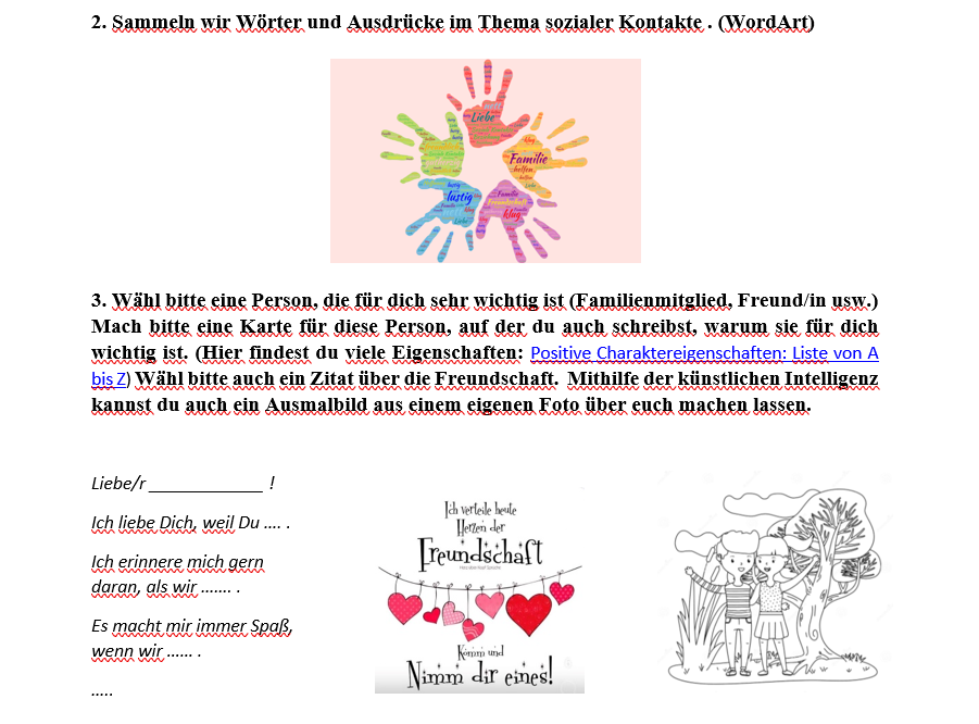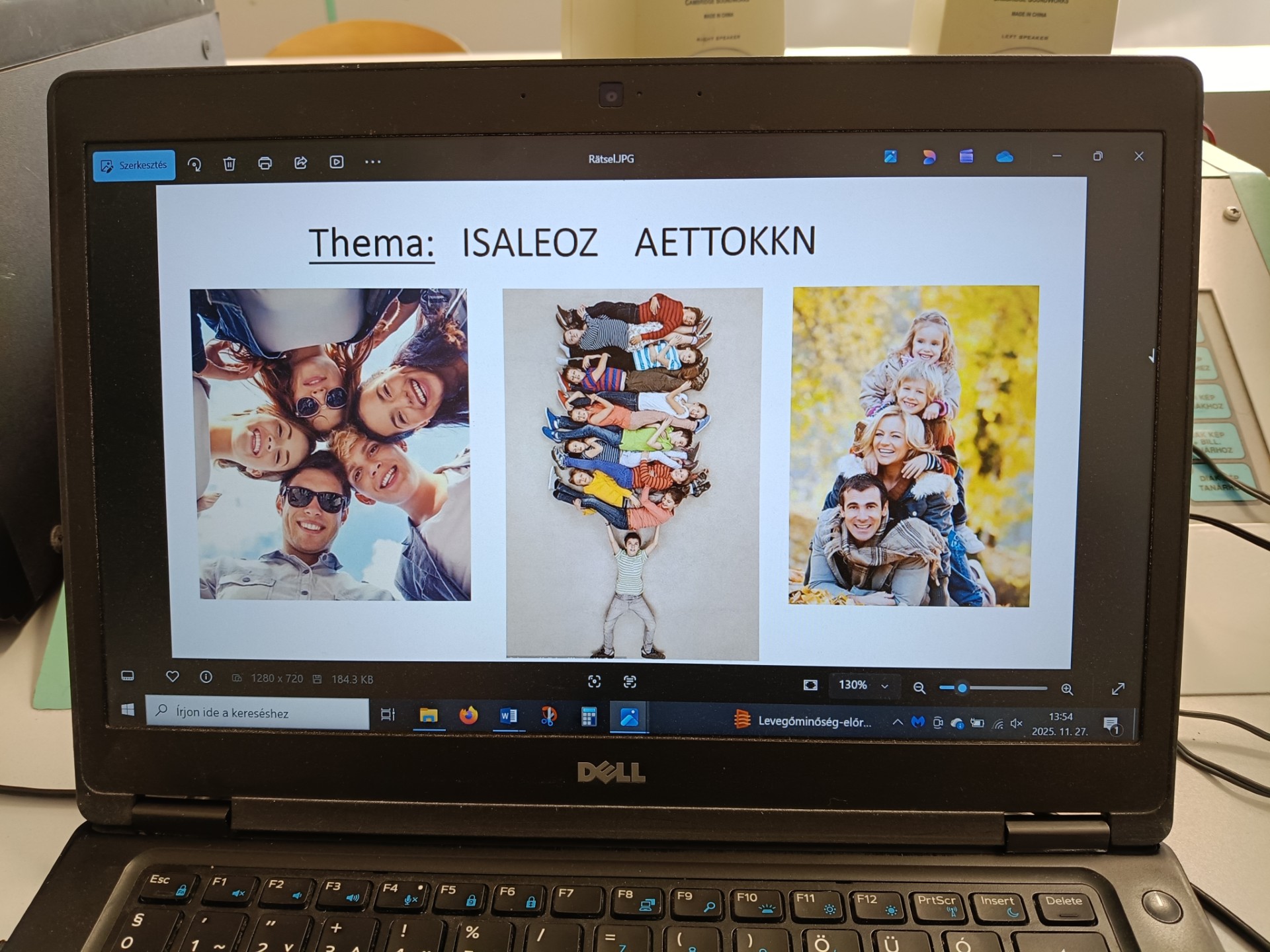 Biró Edit – német óra 12.f osztály: November a „Társas kapcsolatok ápolásának” hónapja, ezért ezt a témát dolgoztuk fel a diákjaimmal. Az óra elején megbeszéltük, miért fontosak az életünkben a társas kapcsolatok. Szóba kerültek a társas kapcsolataink életünkre gyakorolt pozitív hatásai, a barátság, a szerelem és a család. Ezután elkészítettük a már szokásos szófelhőnket a WordArt program segítségével. Zárófeladatként mindenki készített egy digitális üdvözlőkártyát annak a személynek, aki a legfontosabb számára. Előzetes feladatként azt kértem, hozzanak egy olyan fotót, amin ők láthatók a megajándékozandó személlyel együtt, majd ezt a képet a mesterséges intelligencia segítségével átalakítottuk kifesthető képpé, de a diákok választhattak bármilyen más, nekik tetsző témát is, így születtek pl. Disney-stílusú képek is. Ezután terveztek egy üdvözlőkártyát, amire németül írtak néhány mondatot arról, hogy mit szeretnek legjobban a megajándékozandó személyben, milyen közös emlékeik vannak és hozzászerkesztették a mesterséges intelligenciával készült képet is. Néhány pozitív jelzőt, rövid üzenetet egy csipeszre is ráírtunk, ezeket is átadhatják a nekik kedves személynek. És egy jó hír: néhány nappal a novemberi boldogságóra előtt tudtuk meg, hogy mi lettünk október hónap csoportja!!!