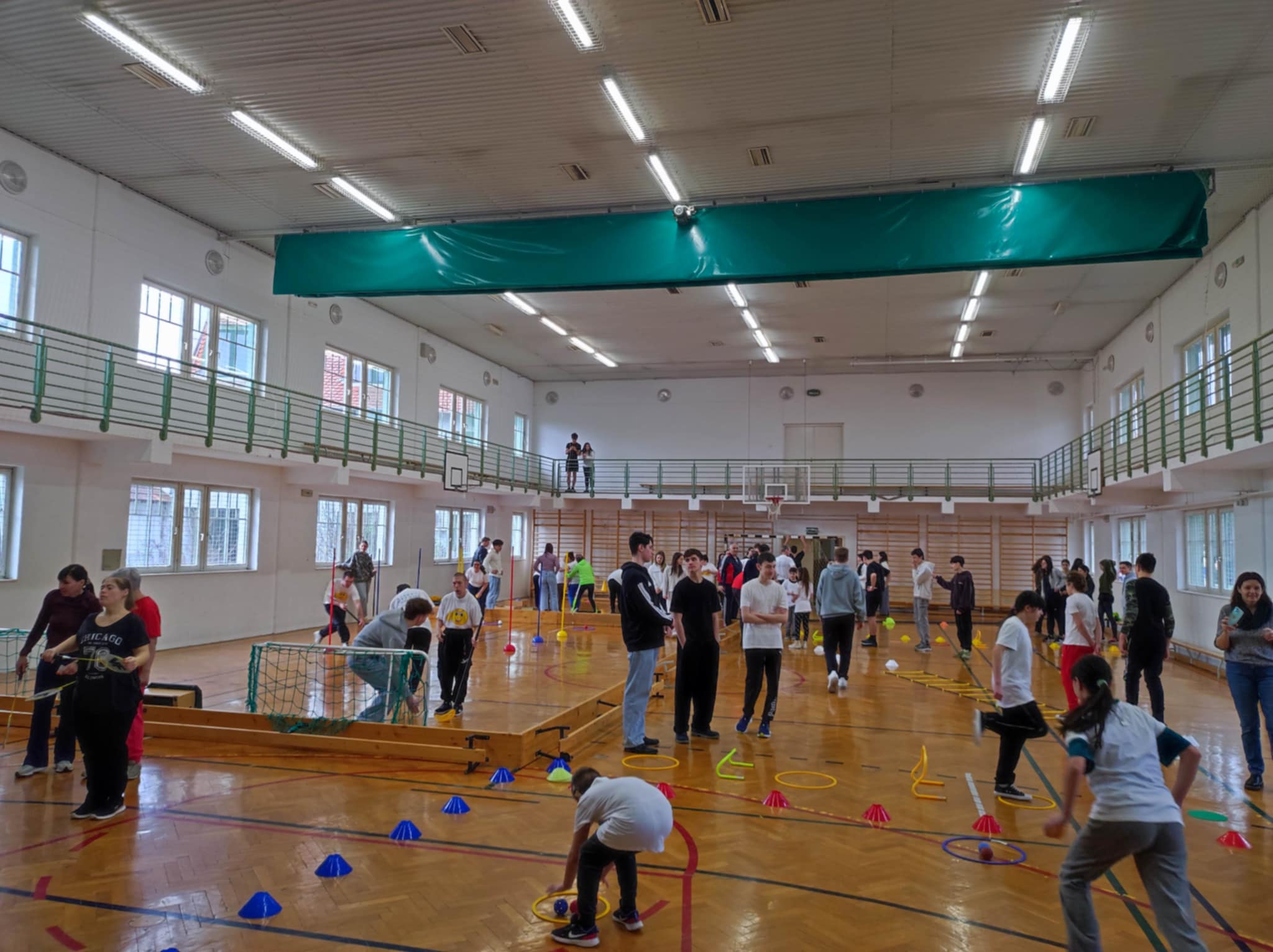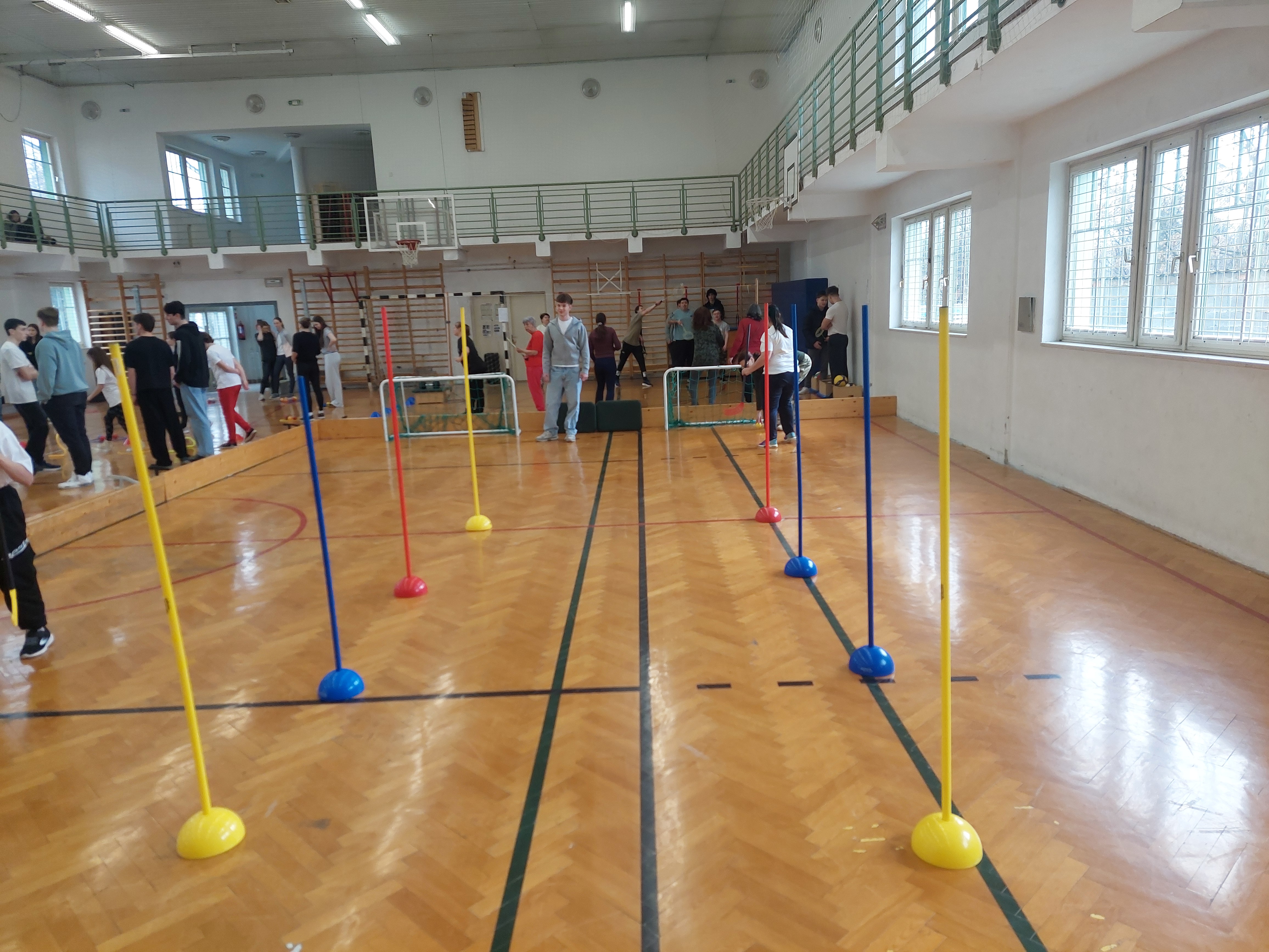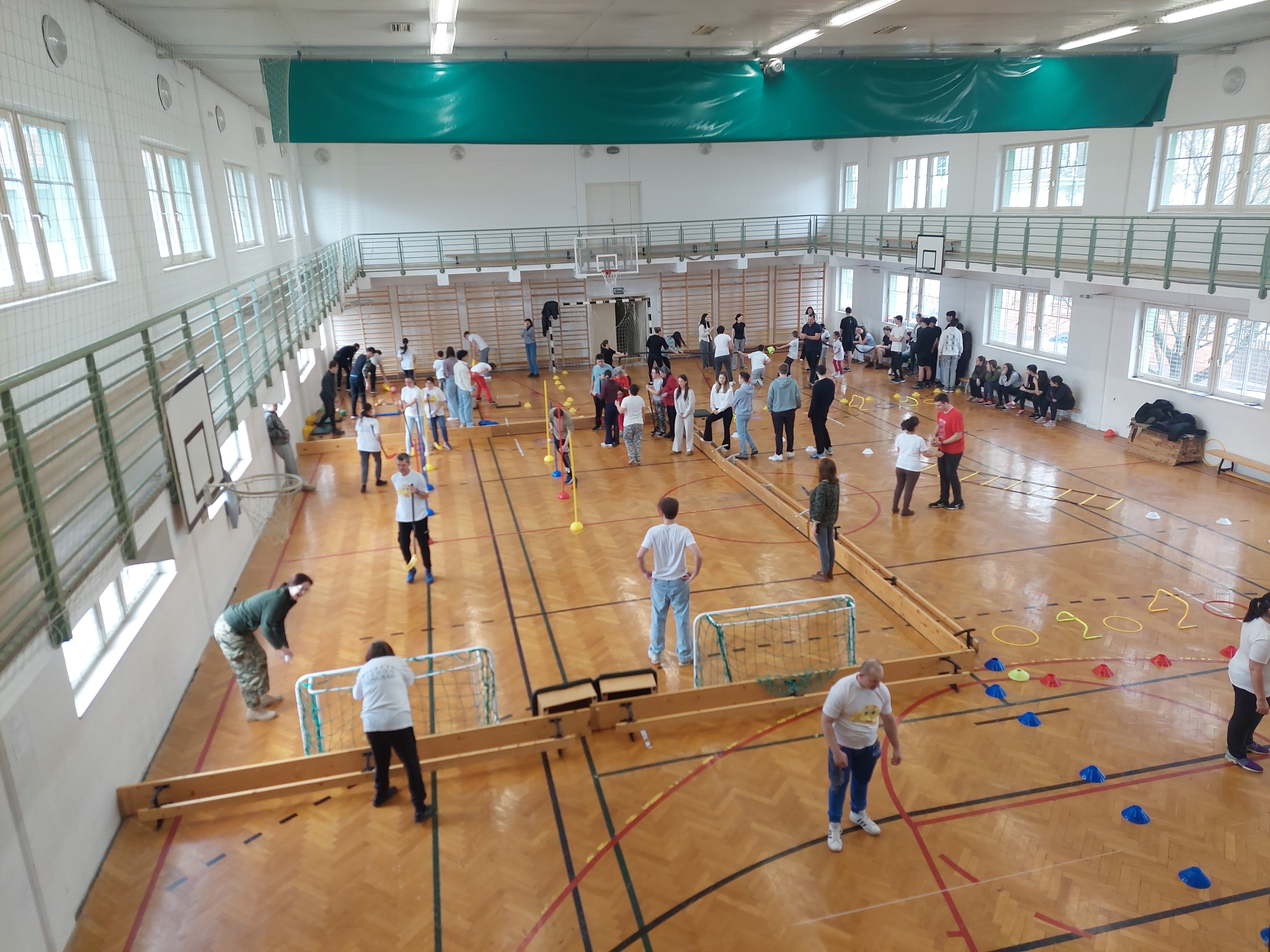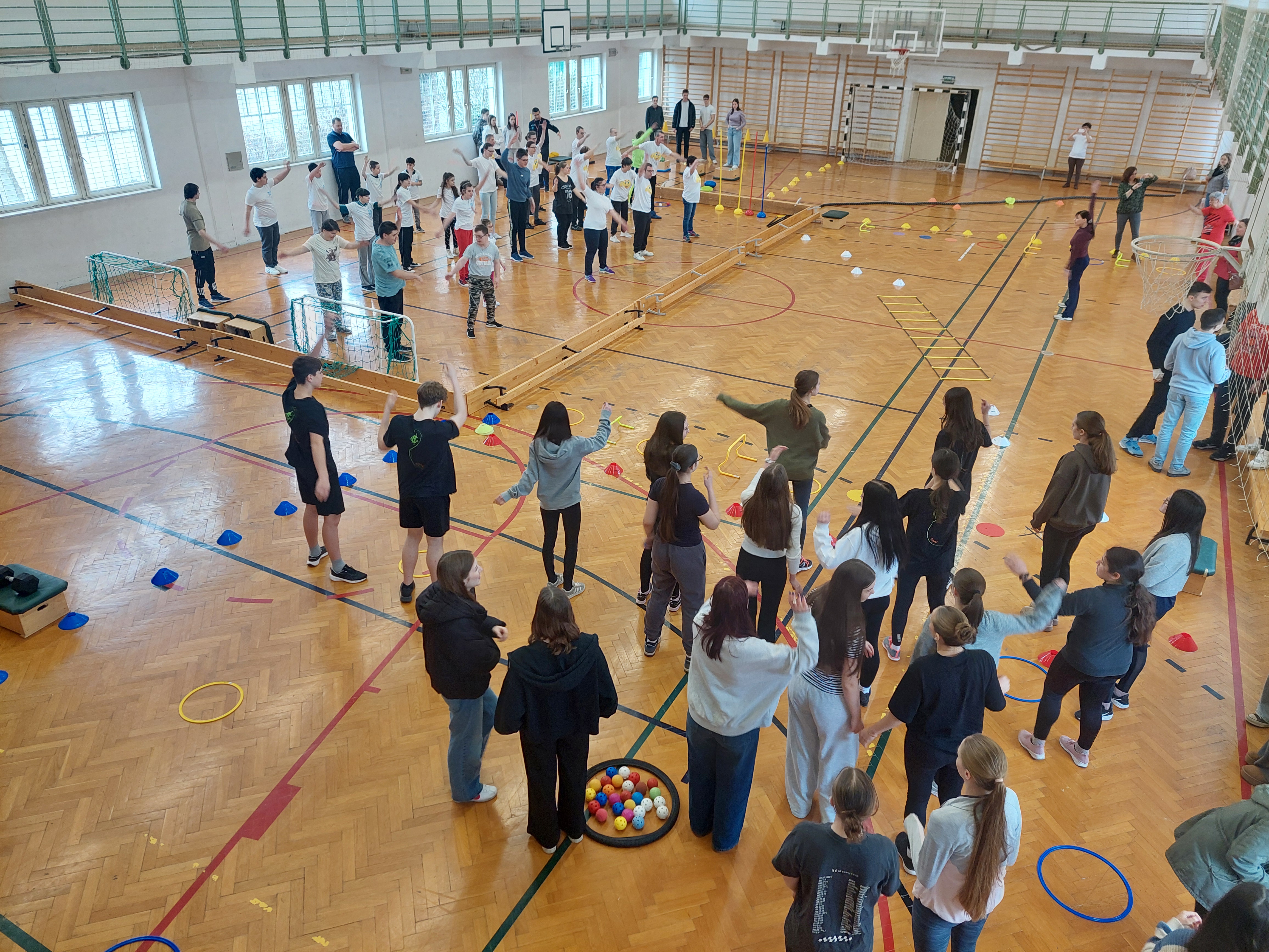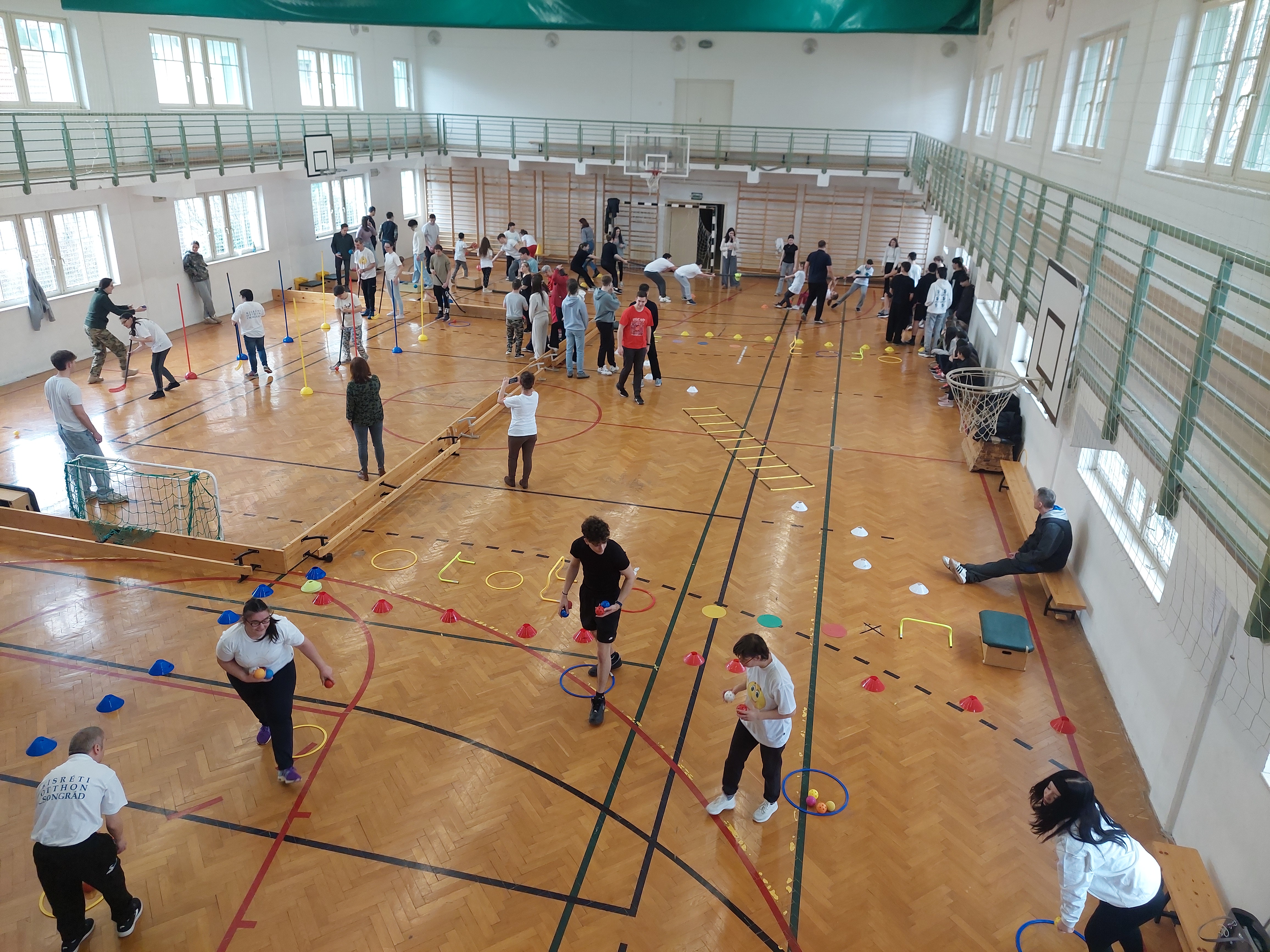 Ezután sportfesztivál következett. A tornatermünket bójákkal hat részre osztottuk. Hat állomás volt, ahol mindenütt más-más volt a feladat. Mindenütt volt egy-egy diákunk, akik állomásvezetőként elmagyarázták, bemutatták a feladatokat. A vendégeket a mi diákjainkkal vegyesen beosztottuk az állomásokra és hangulatkeltő zene mellett kezdték el a feladataikat. Amikor elhalkult a zene, akkor következett az állomások közötti csere.