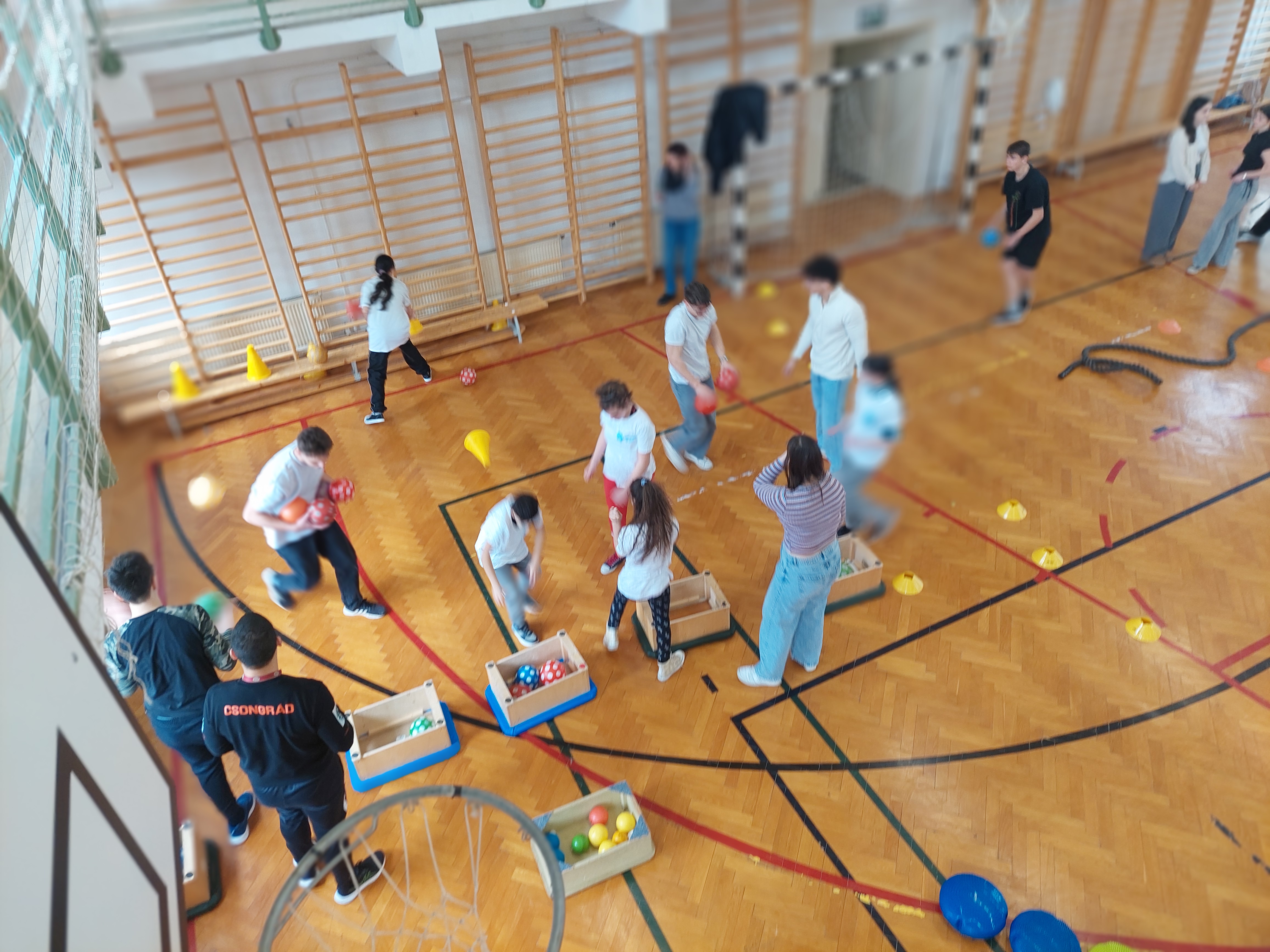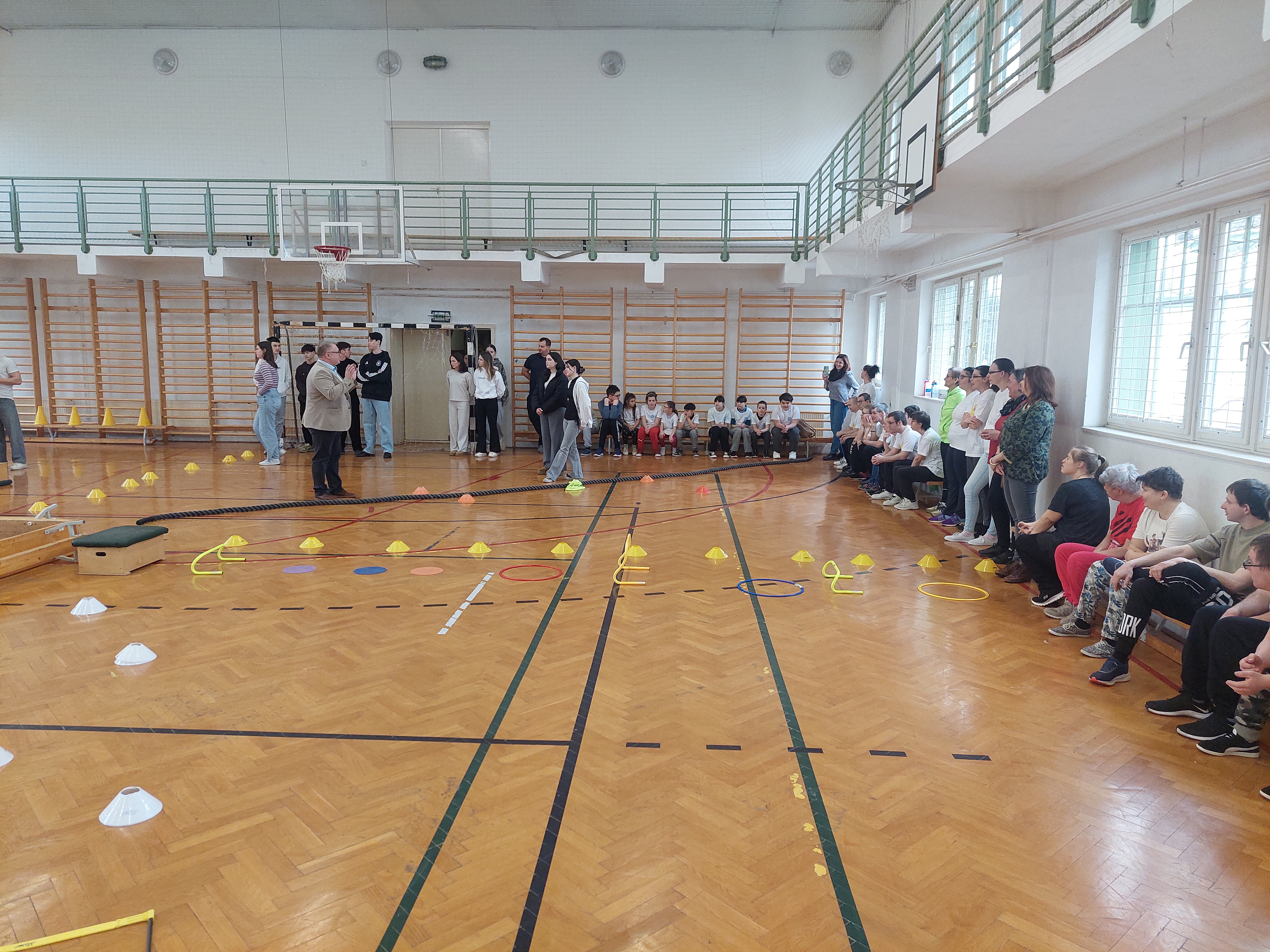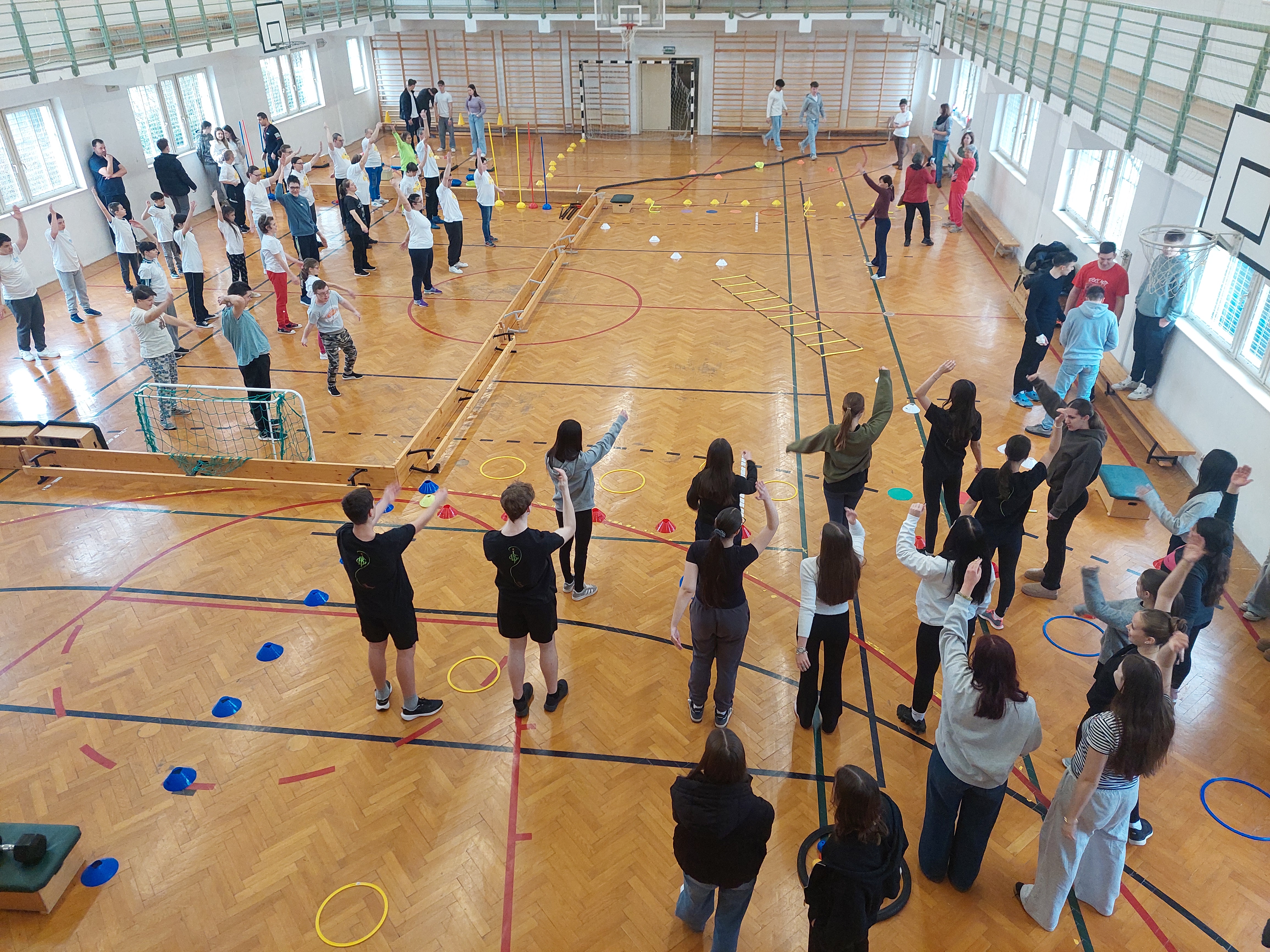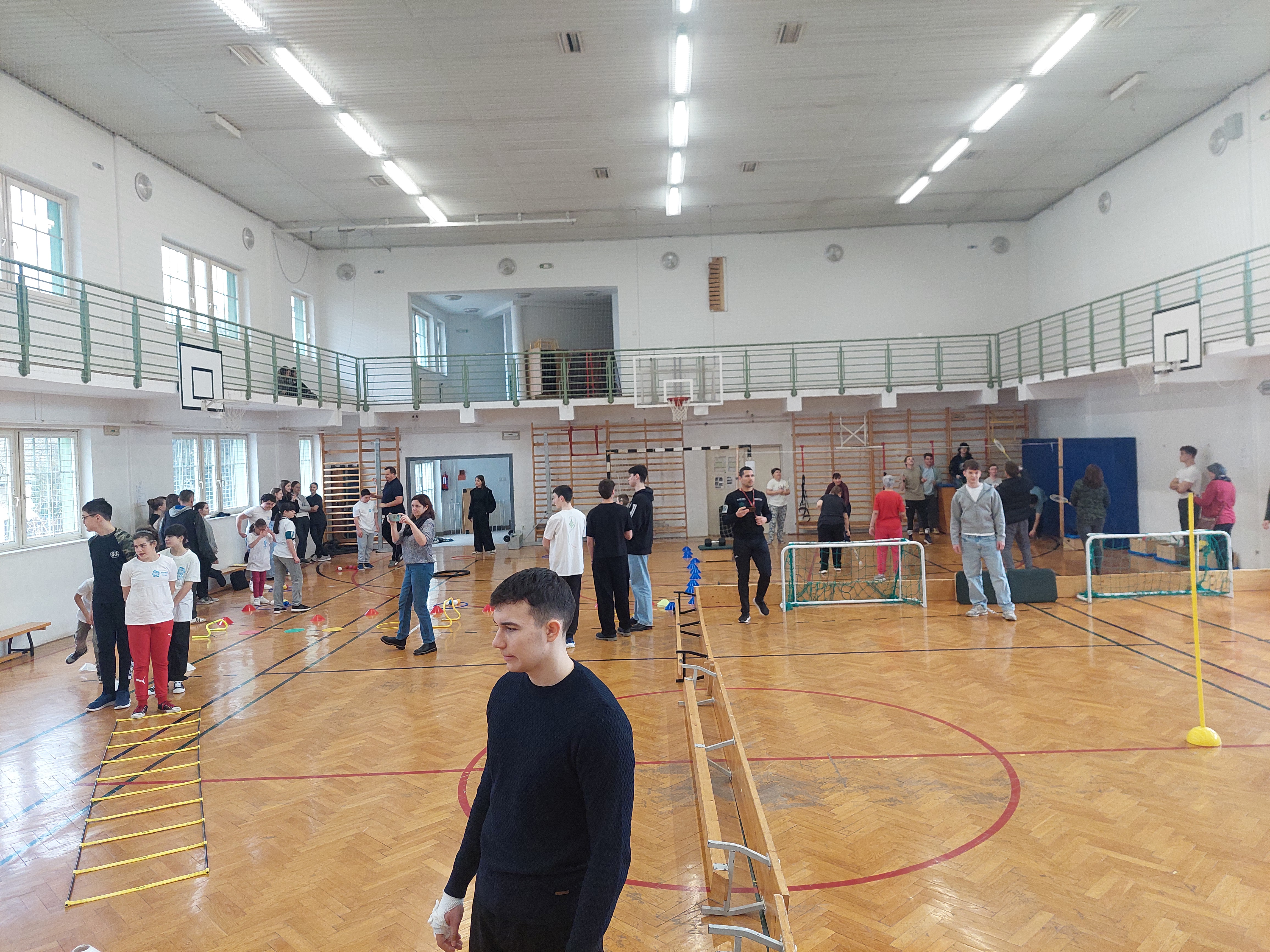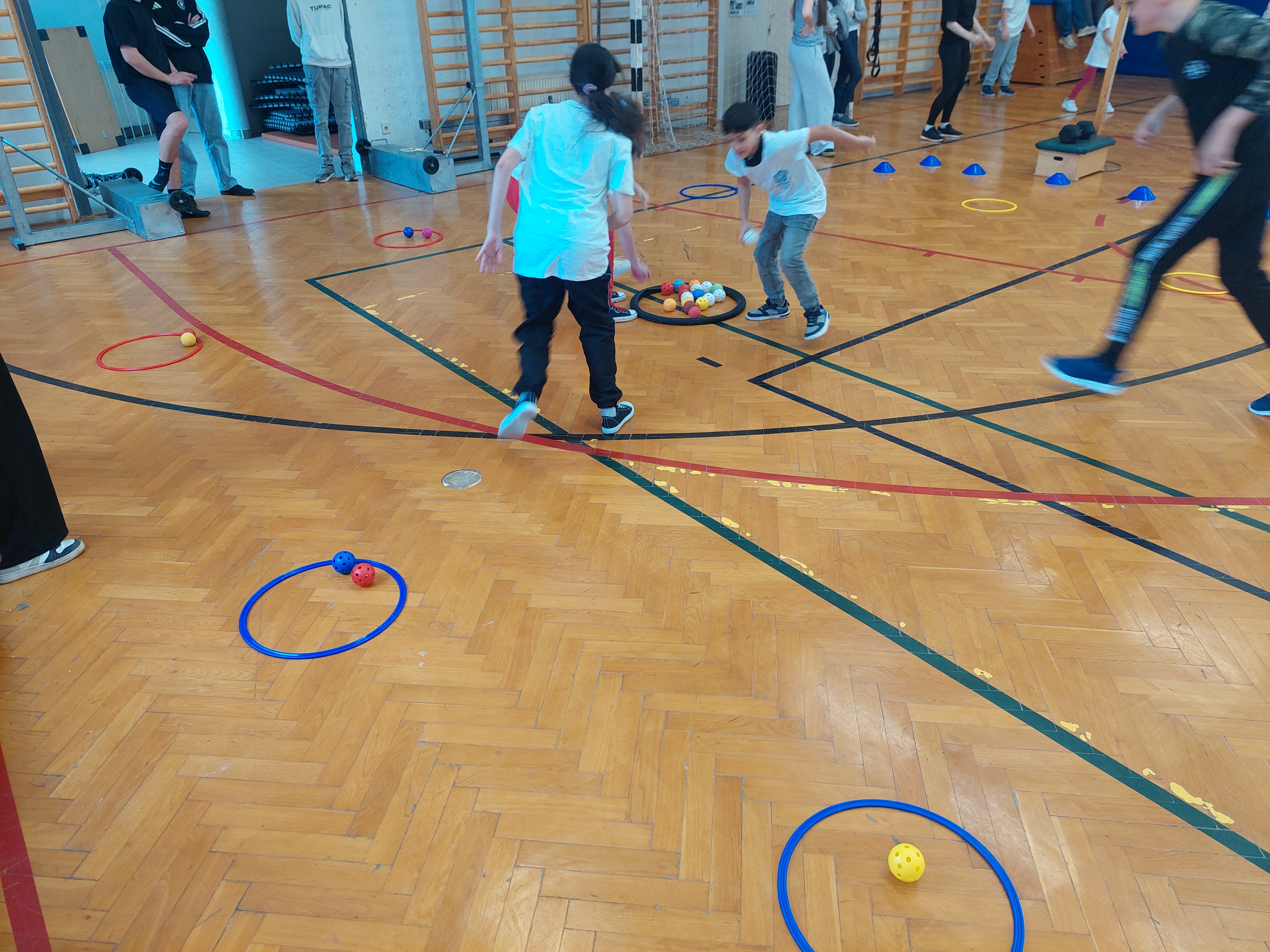 Ezután sportfesztivál következett. A tornatermünket bójákkal hat részre osztottuk. Hat állomás volt, ahol mindenütt más-más volt a feladat. Mindenütt volt egy-egy diákunk, akik állomásvezetőként elmagyarázták, bemutatták a feladatokat. A vendégeket a mi diákjainkkal vegyesen beosztottuk az állomásokra és hangulatkeltő zene mellett kezdték el a feladataikat. Amikor elhalkult a zene, akkor következett az állomások közötti csere.