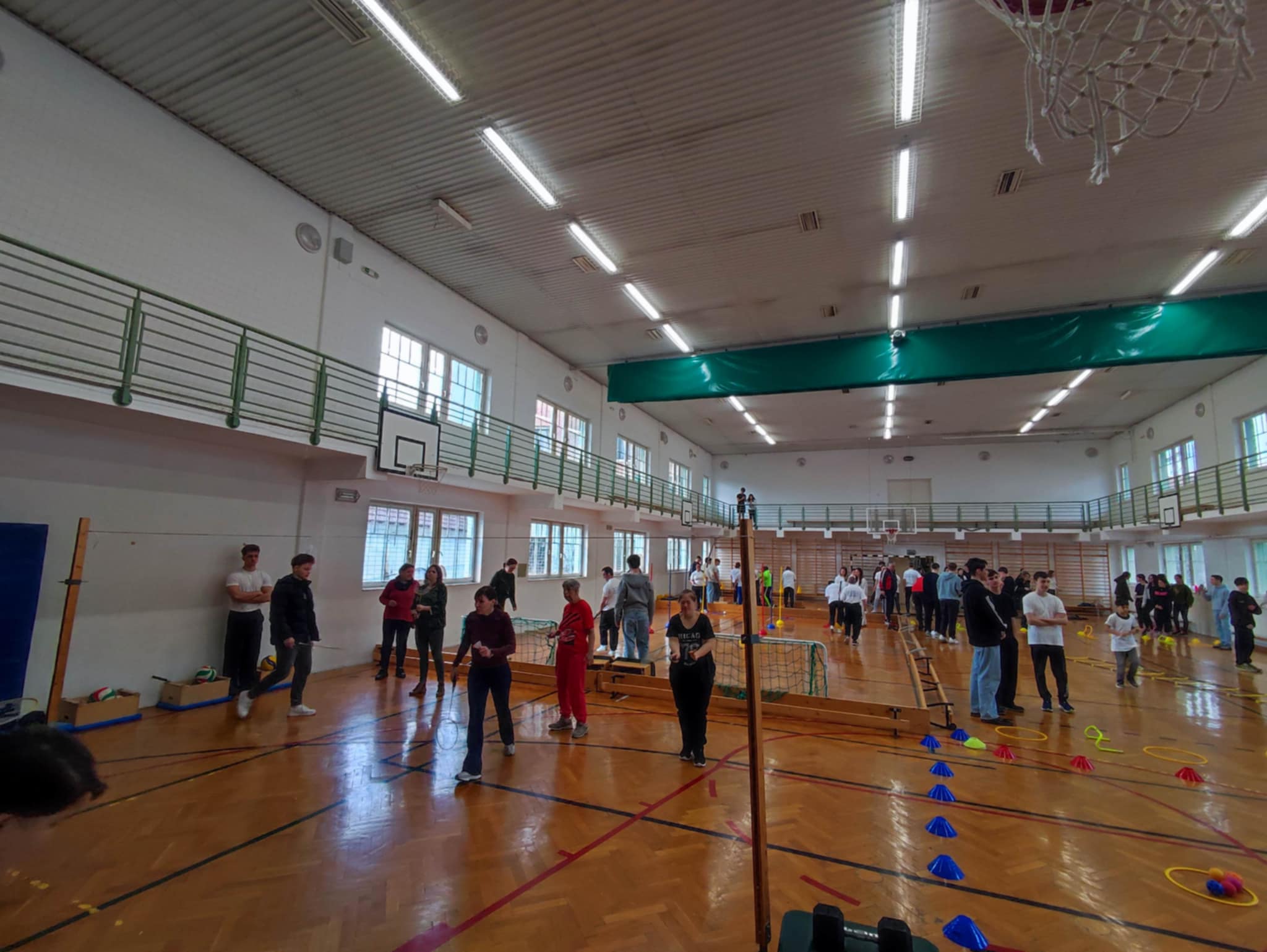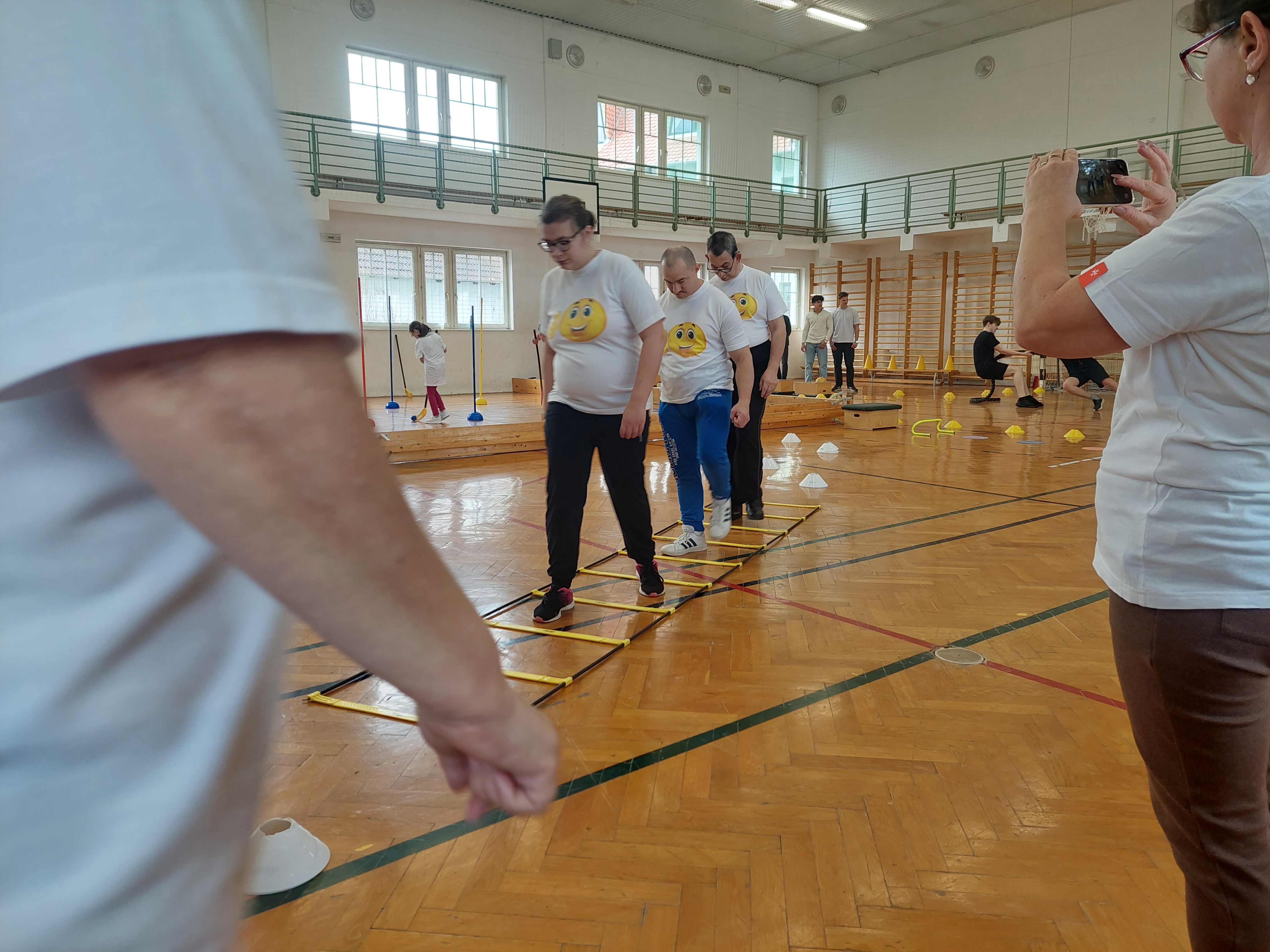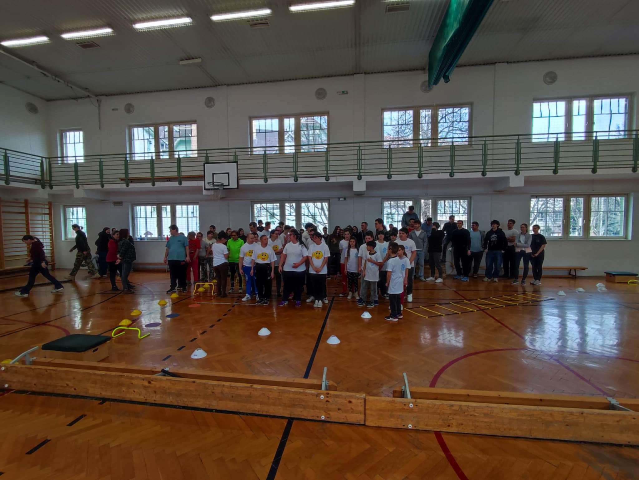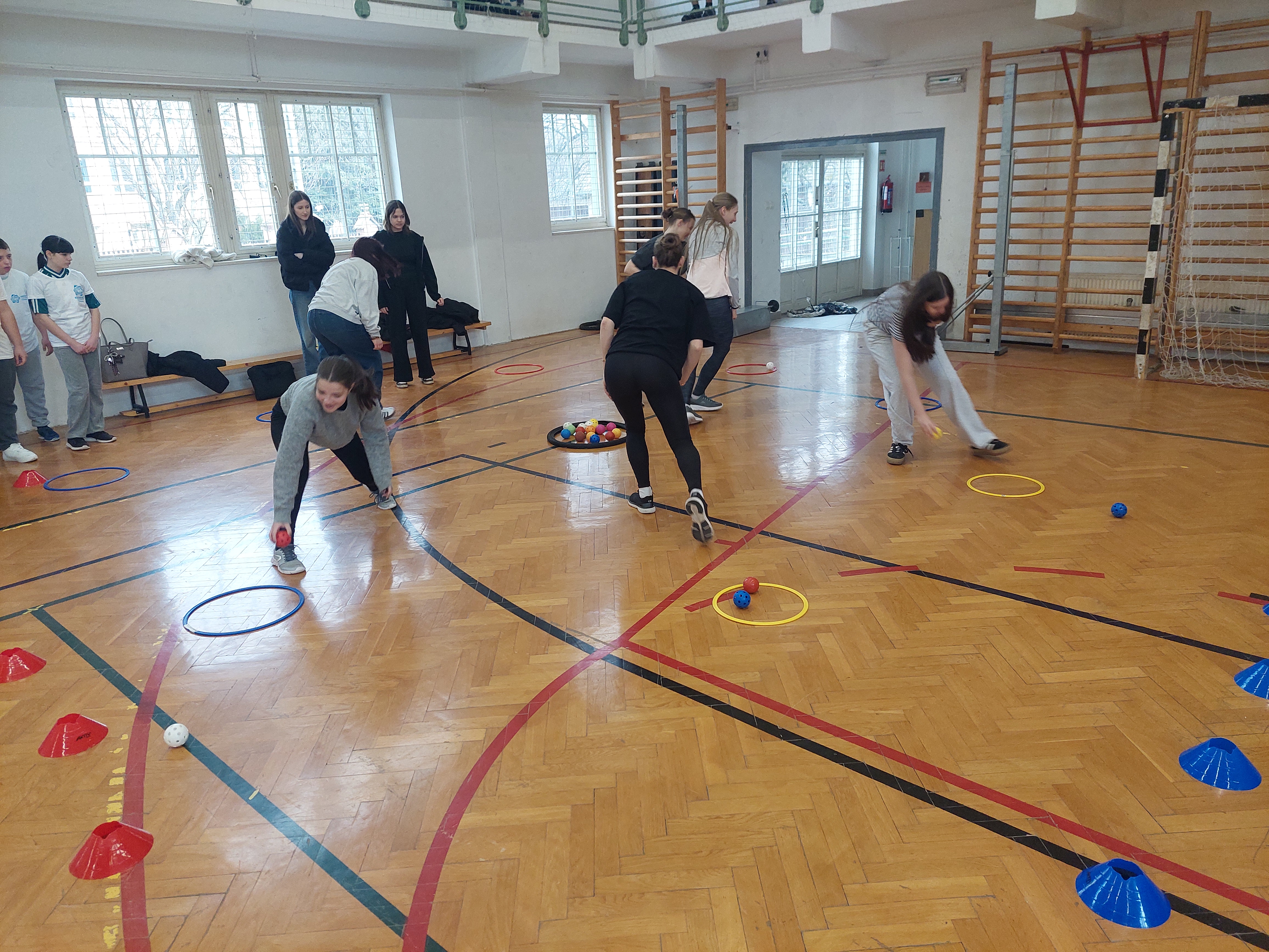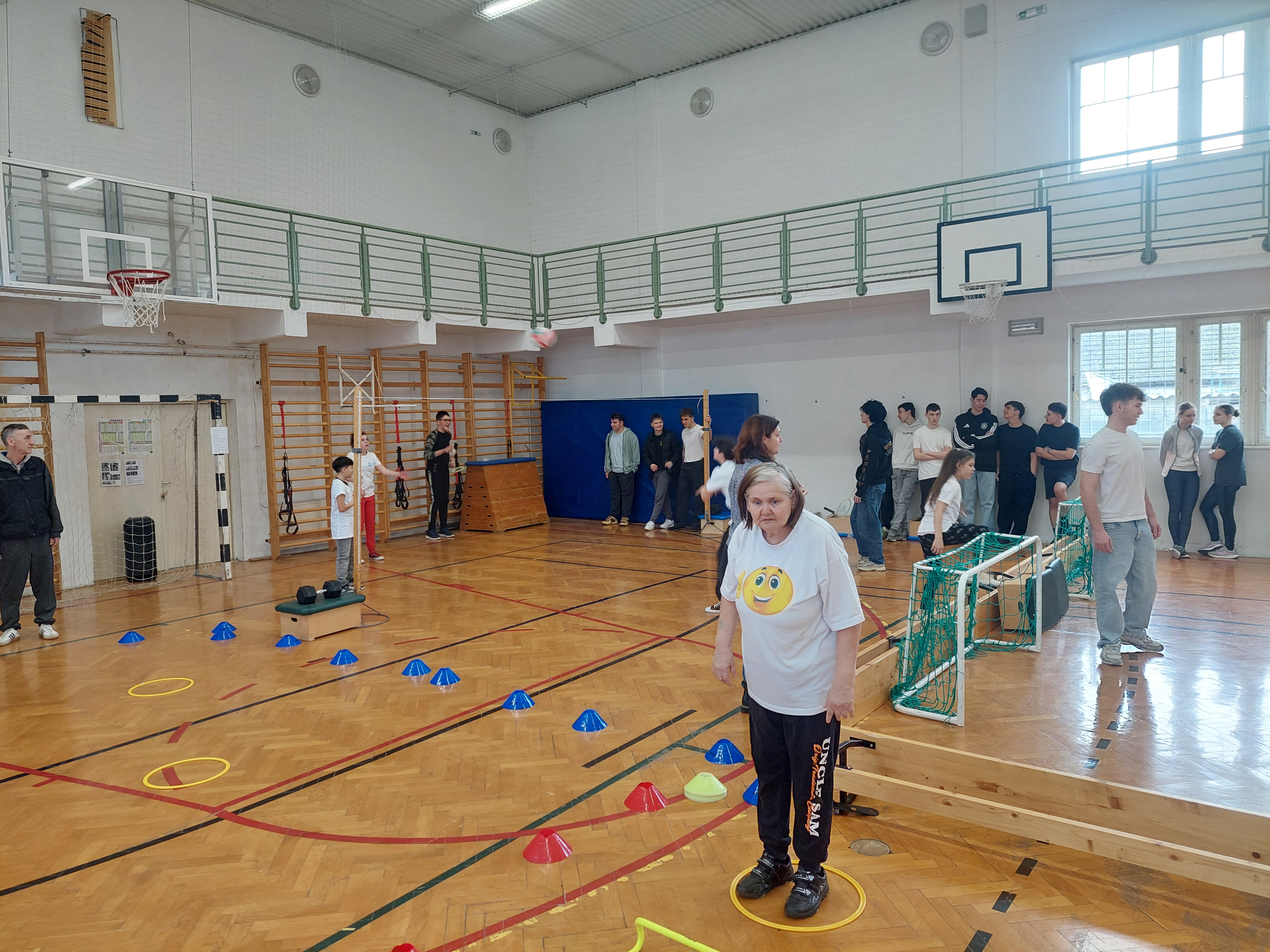 Ezután sportfesztivál következett. A tornatermünket bójákkal hat részre osztottuk. Hat állomás volt, ahol mindenütt más-más volt a feladat. Mindenütt volt egy-egy diákunk, akik állomásvezetőként elmagyarázták, bemutatták a feladatokat. A vendégeket a mi diákjainkkal vegyesen beosztottuk az állomásokra és hangulatkeltő zene mellett kezdték el a feladataikat. Amikor elhalkult a zene, akkor következett az állomások közötti csere.