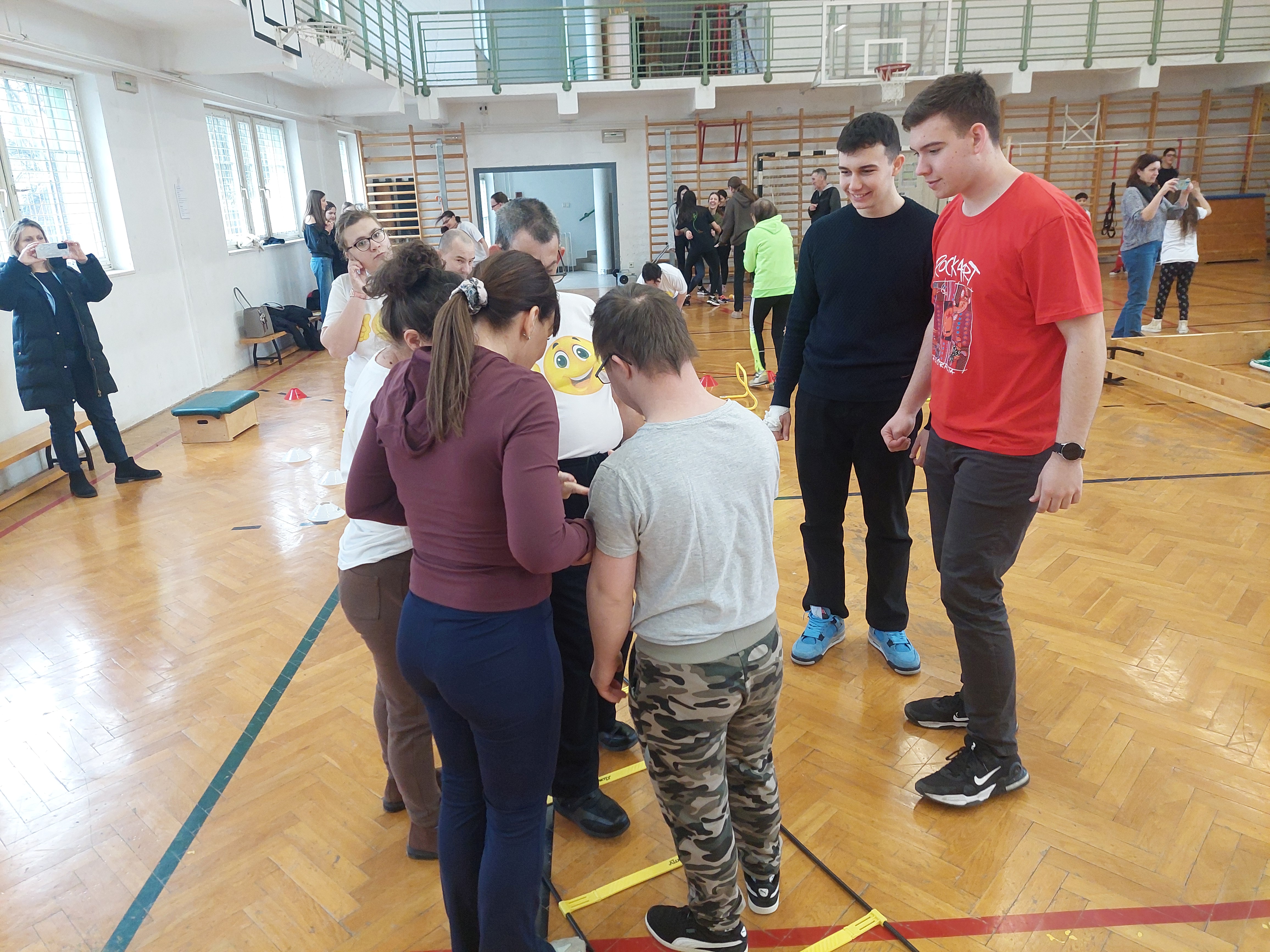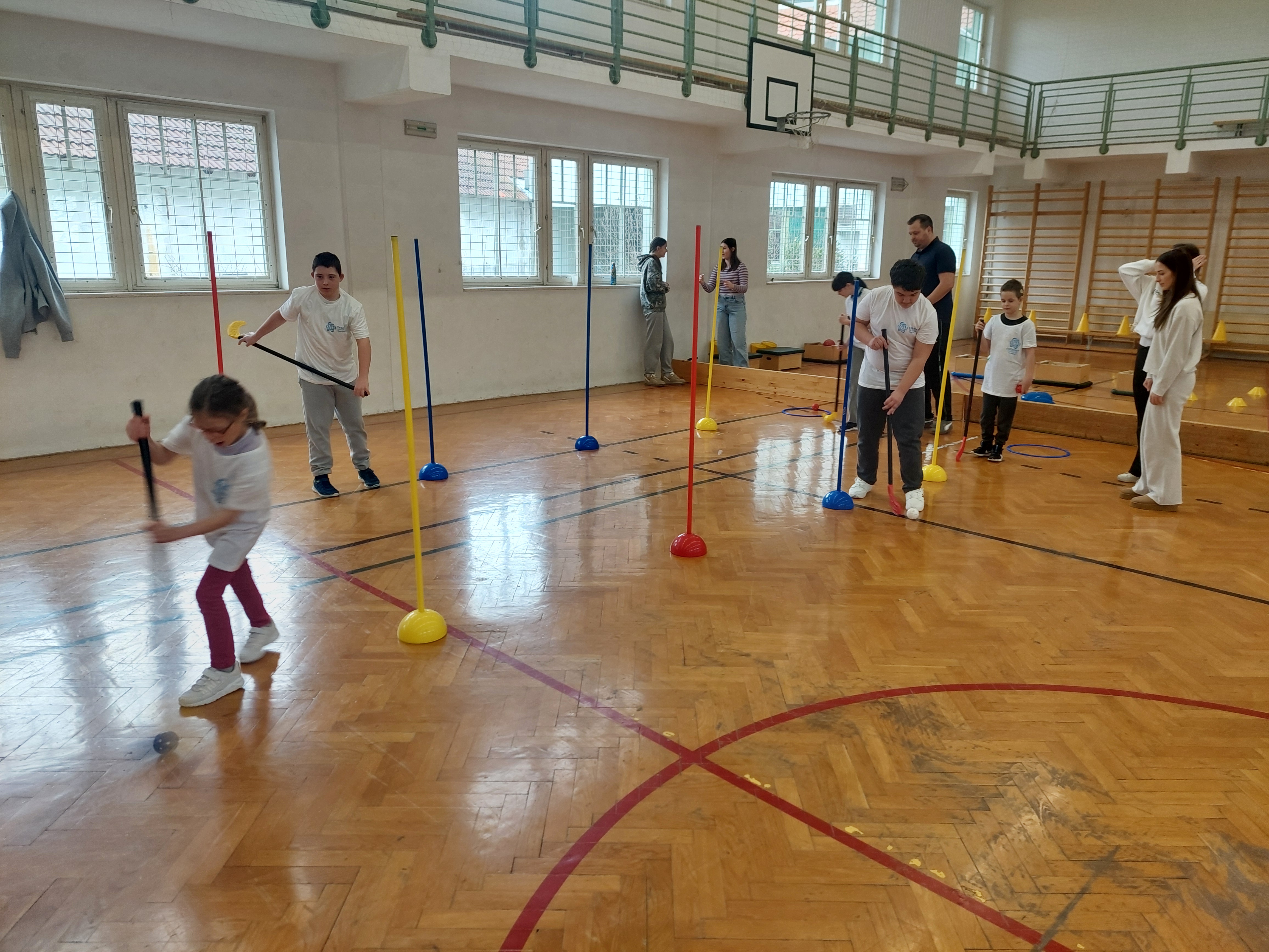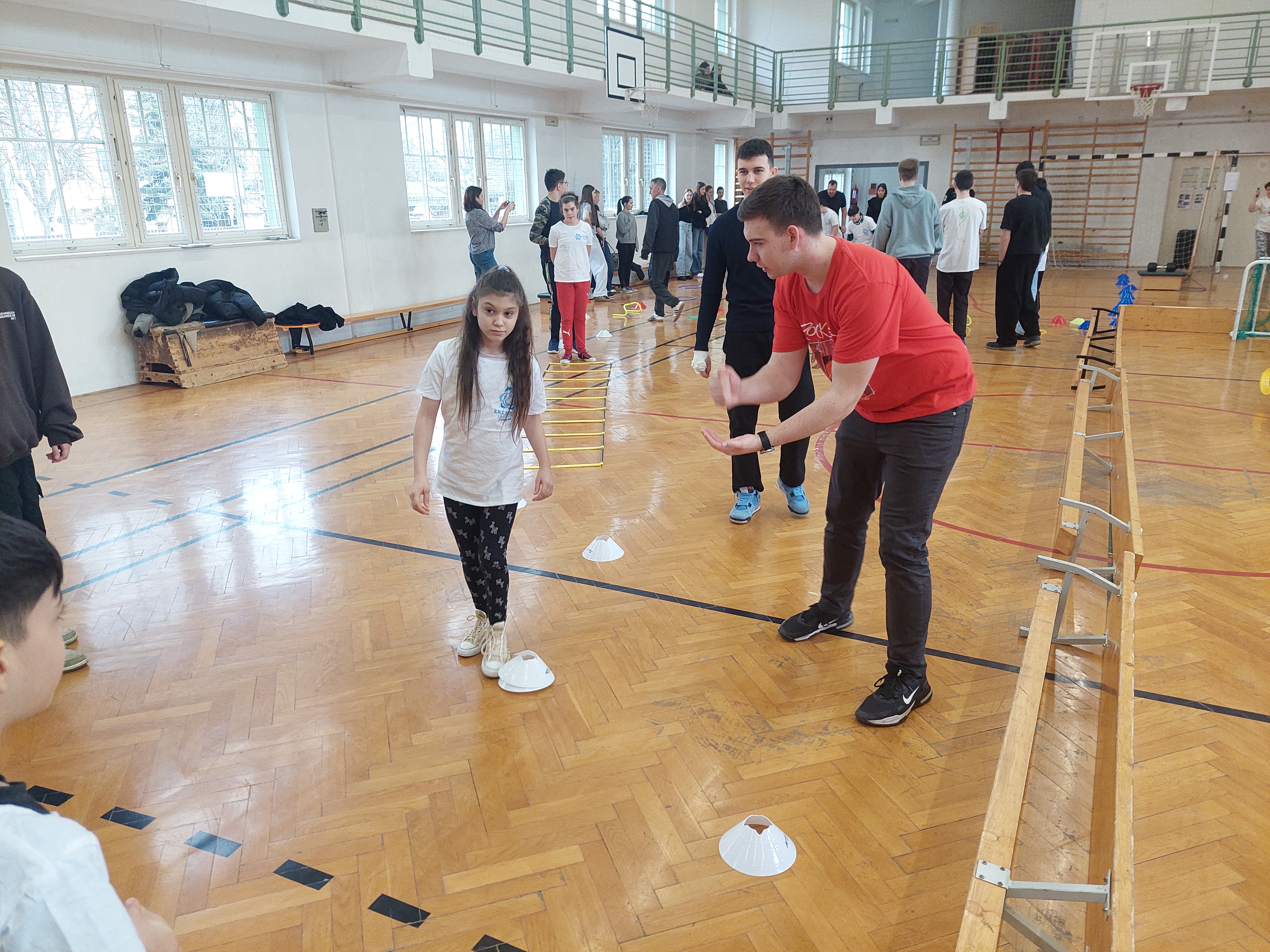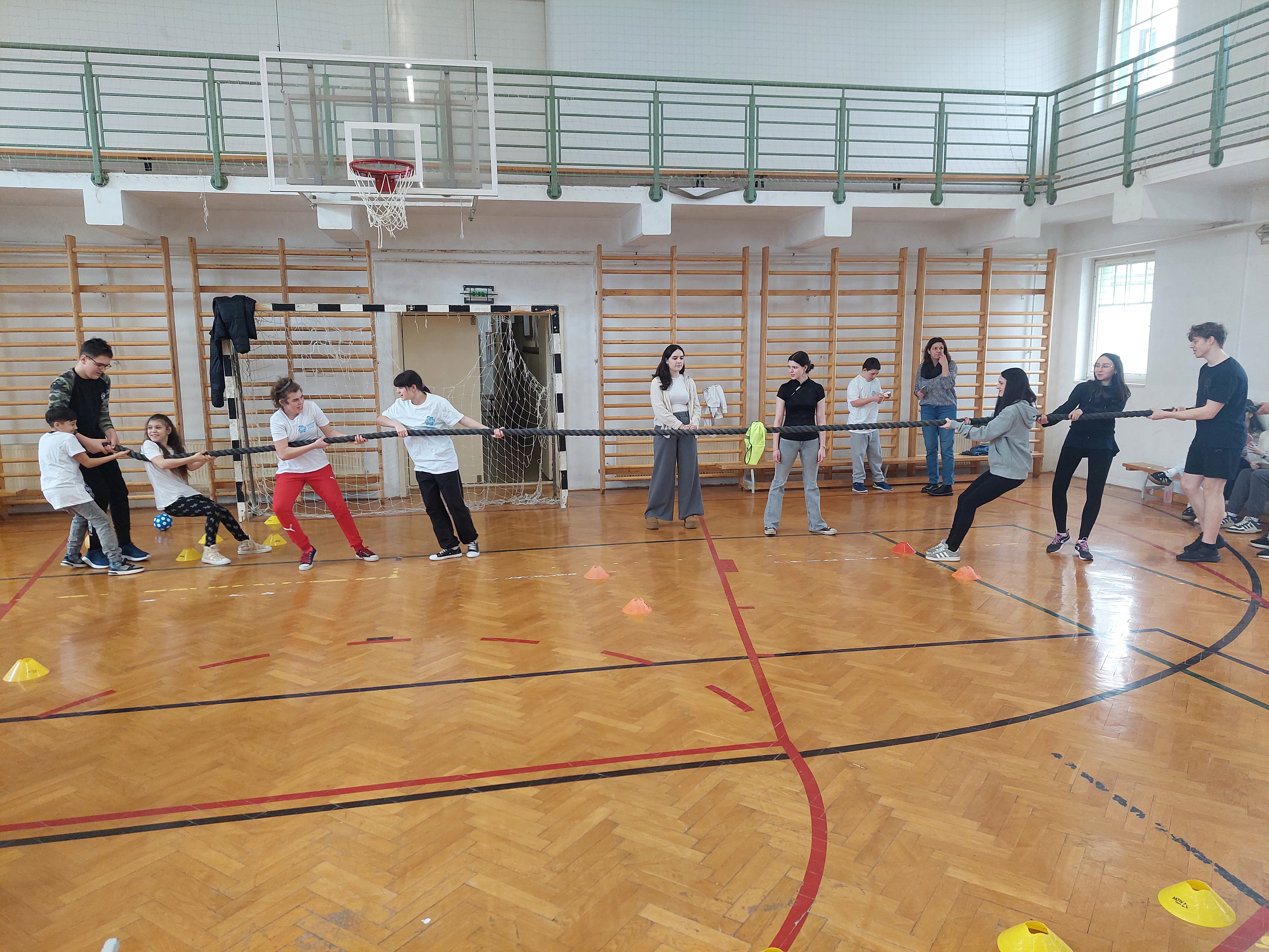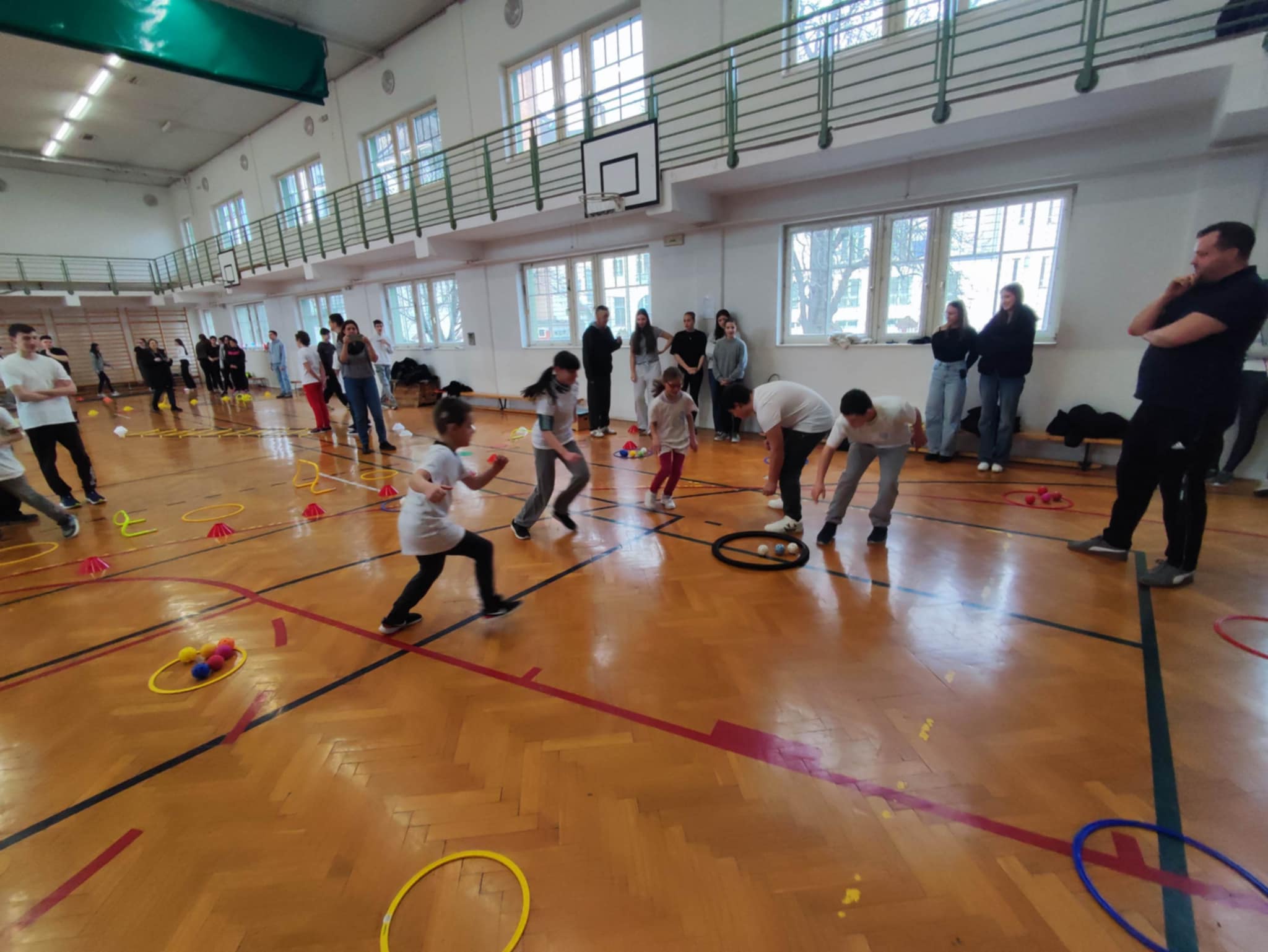 Ezután sportfesztivál következett. A tornatermünket bójákkal hat részre osztottuk. Hat állomás volt, ahol mindenütt más-más volt a feladat. Mindenütt volt egy-egy diákunk, akik állomásvezetőként elmagyarázták, bemutatták a feladatokat. A vendégeket a mi diákjainkkal vegyesen beosztottuk az állomásokra és hangulatkeltő zene mellett kezdték el a feladataikat. Amikor elhalkult a zene, akkor következett az állomások közötti csere.