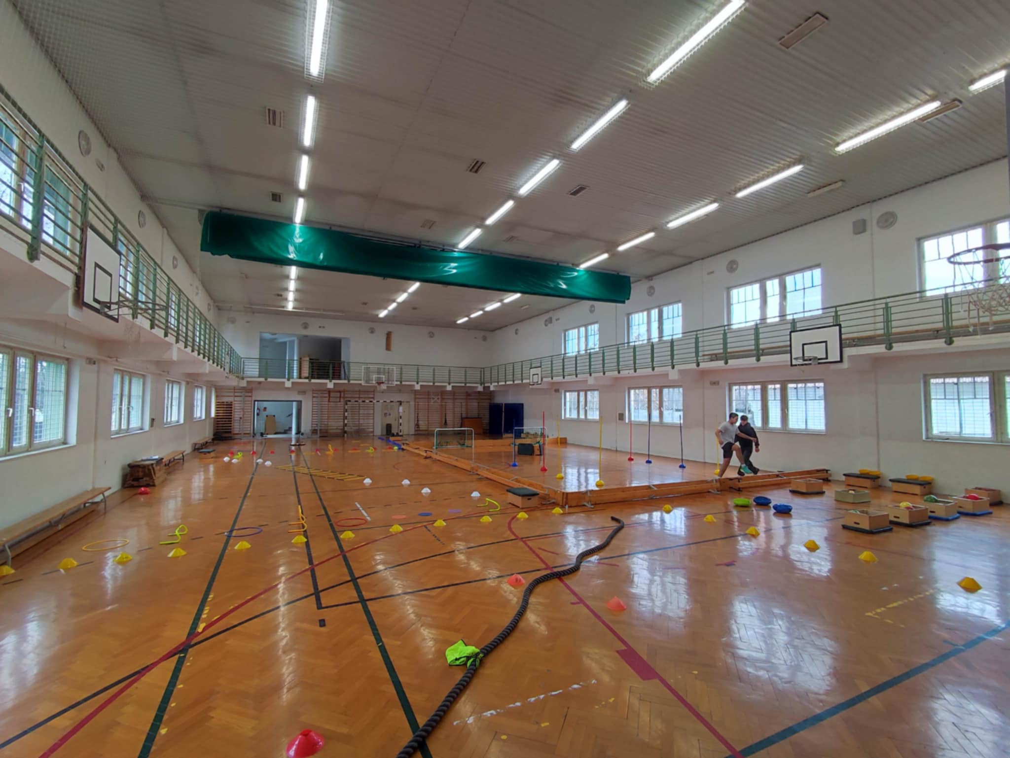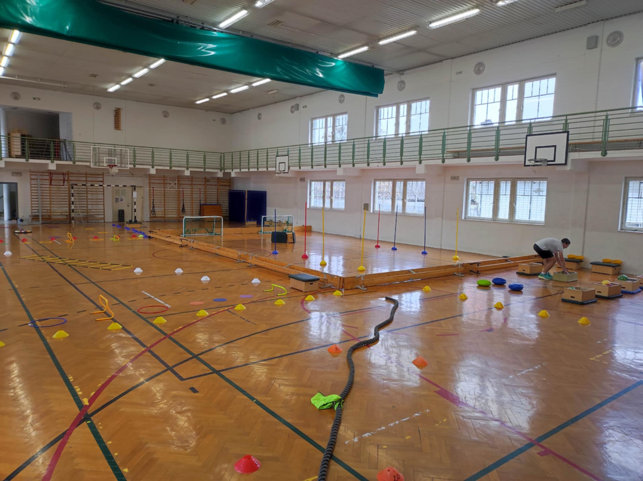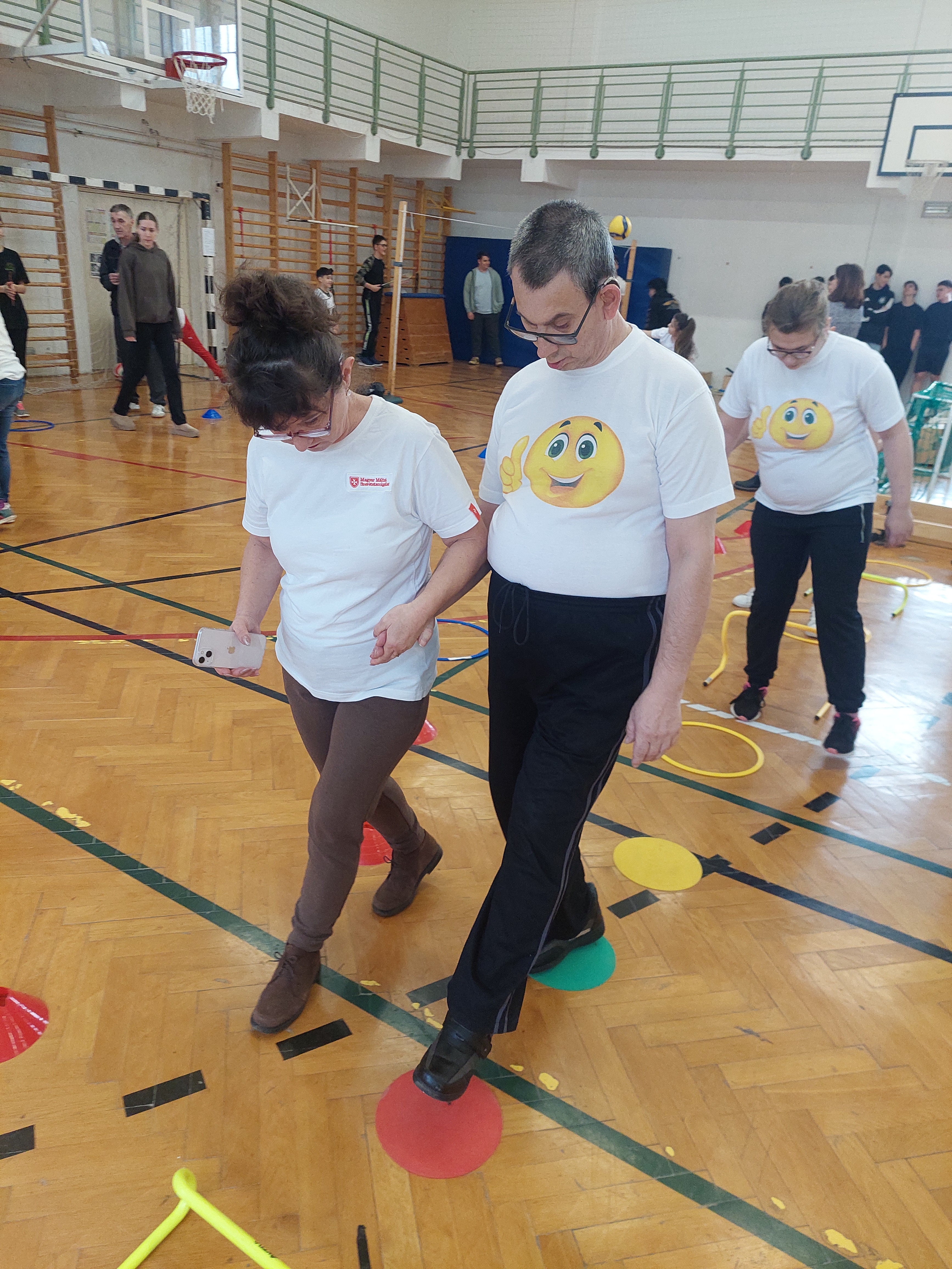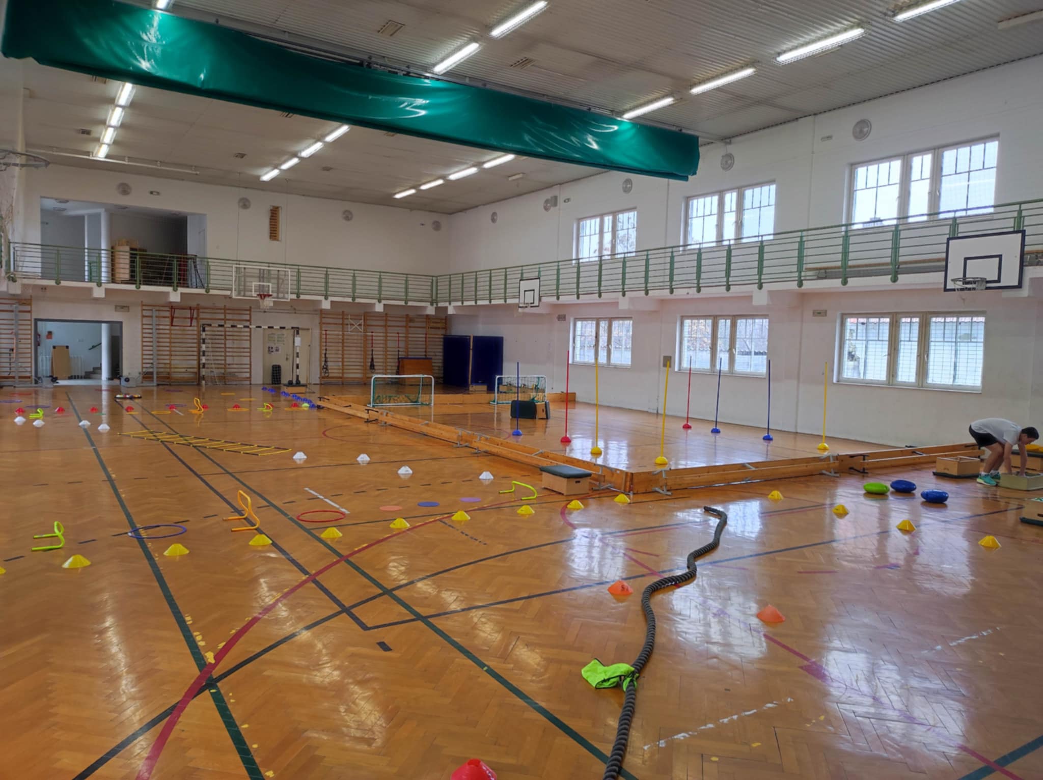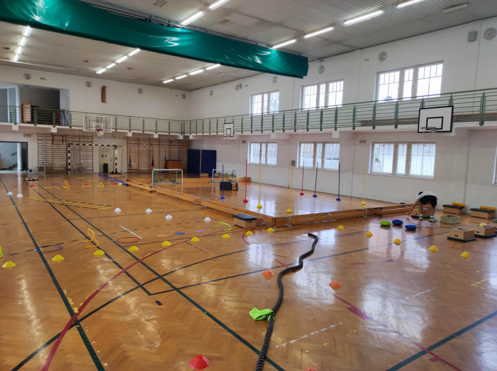 Ezután sportfesztivál következett. A tornatermünket bójákkal hat részre osztottuk. Hat állomás volt, ahol mindenütt más-más volt a feladat. Mindenütt volt egy-egy diákunk, akik állomásvezetőként elmagyarázták, bemutatták a feladatokat. A vendégeket a mi diákjainkkal vegyesen beosztottuk az állomásokra és hangulatkeltő zene mellett kezdték el a feladataikat. Amikor elhalkult a zene, akkor következett az állomások közötti csere.