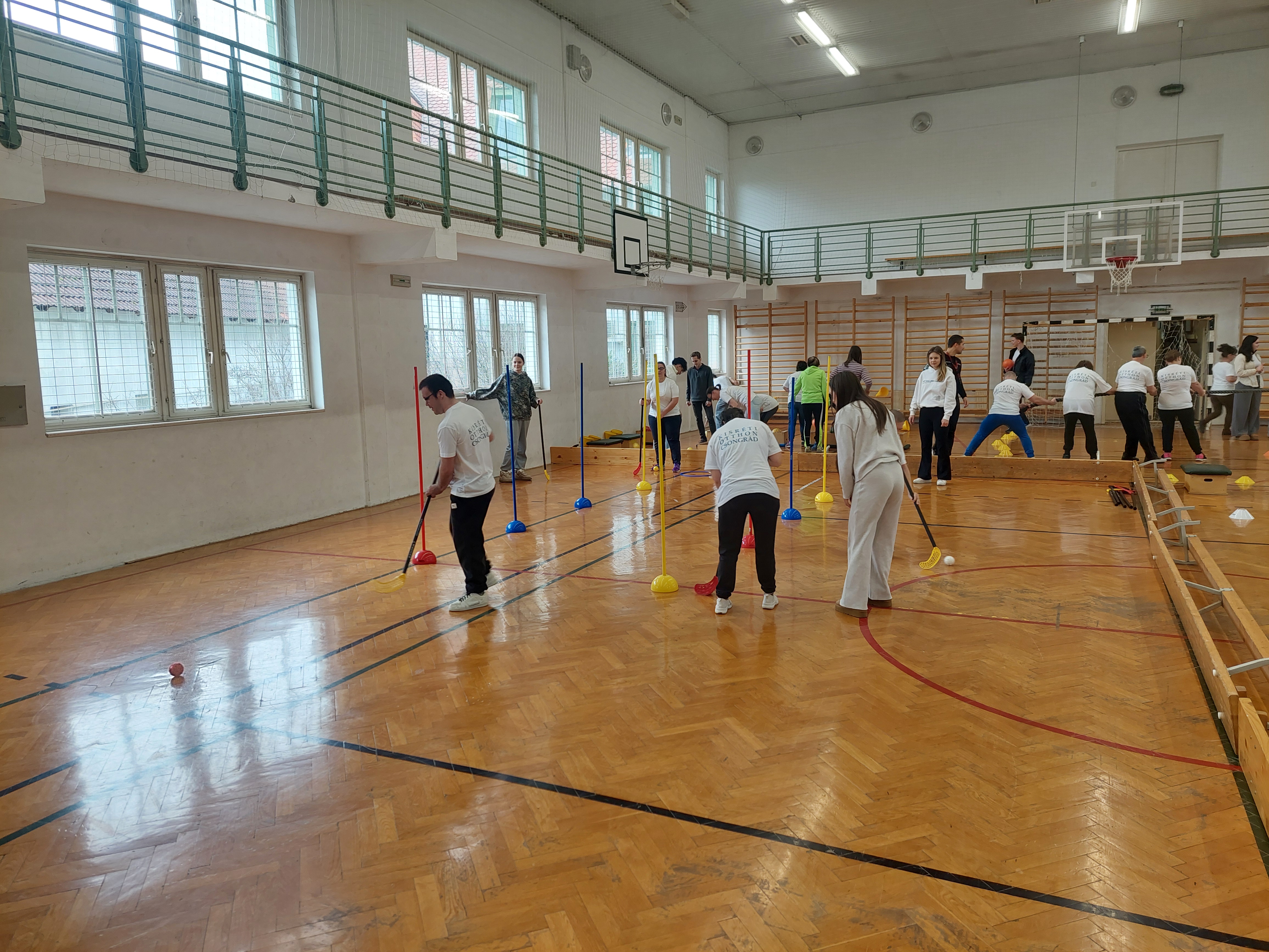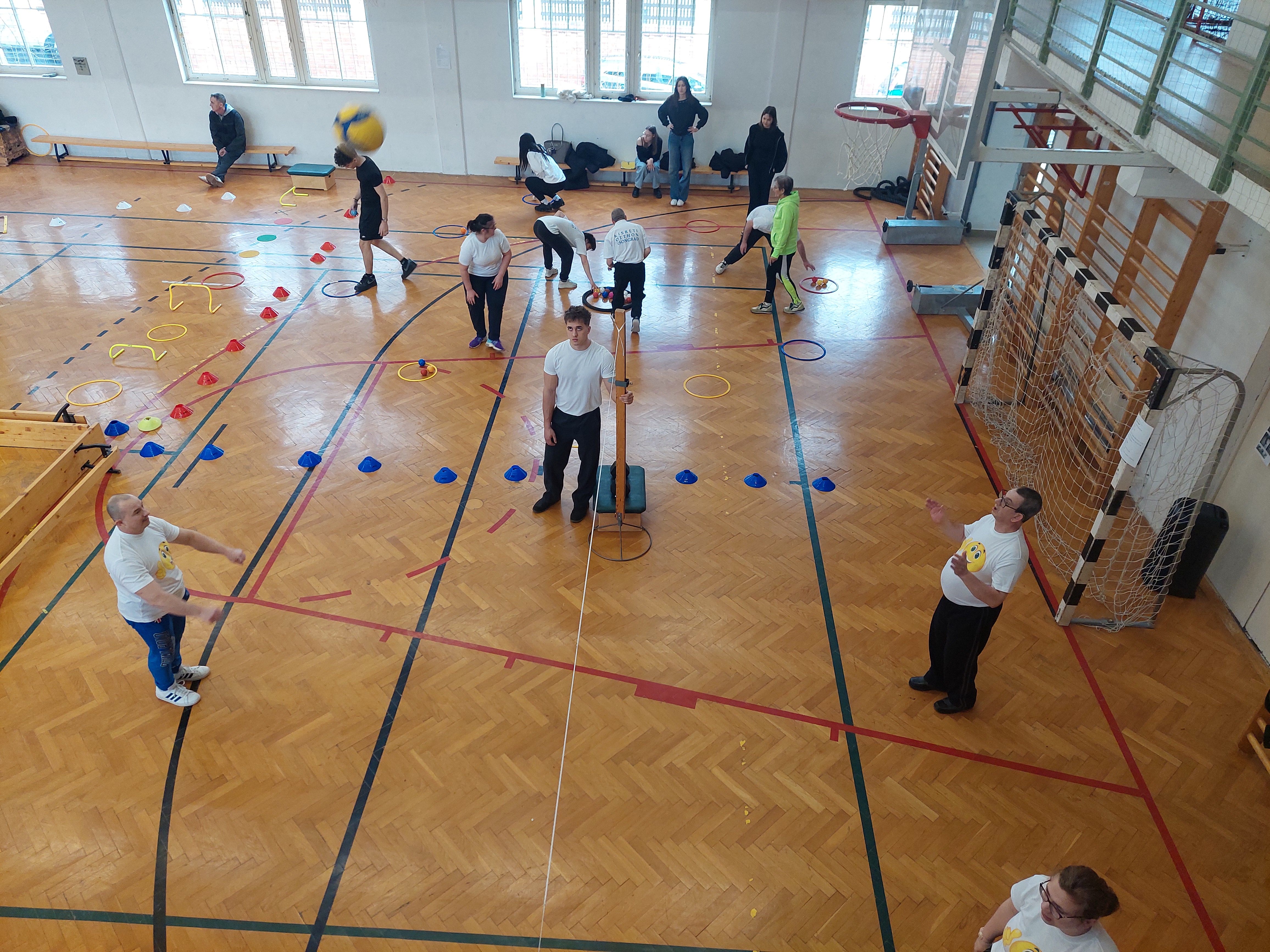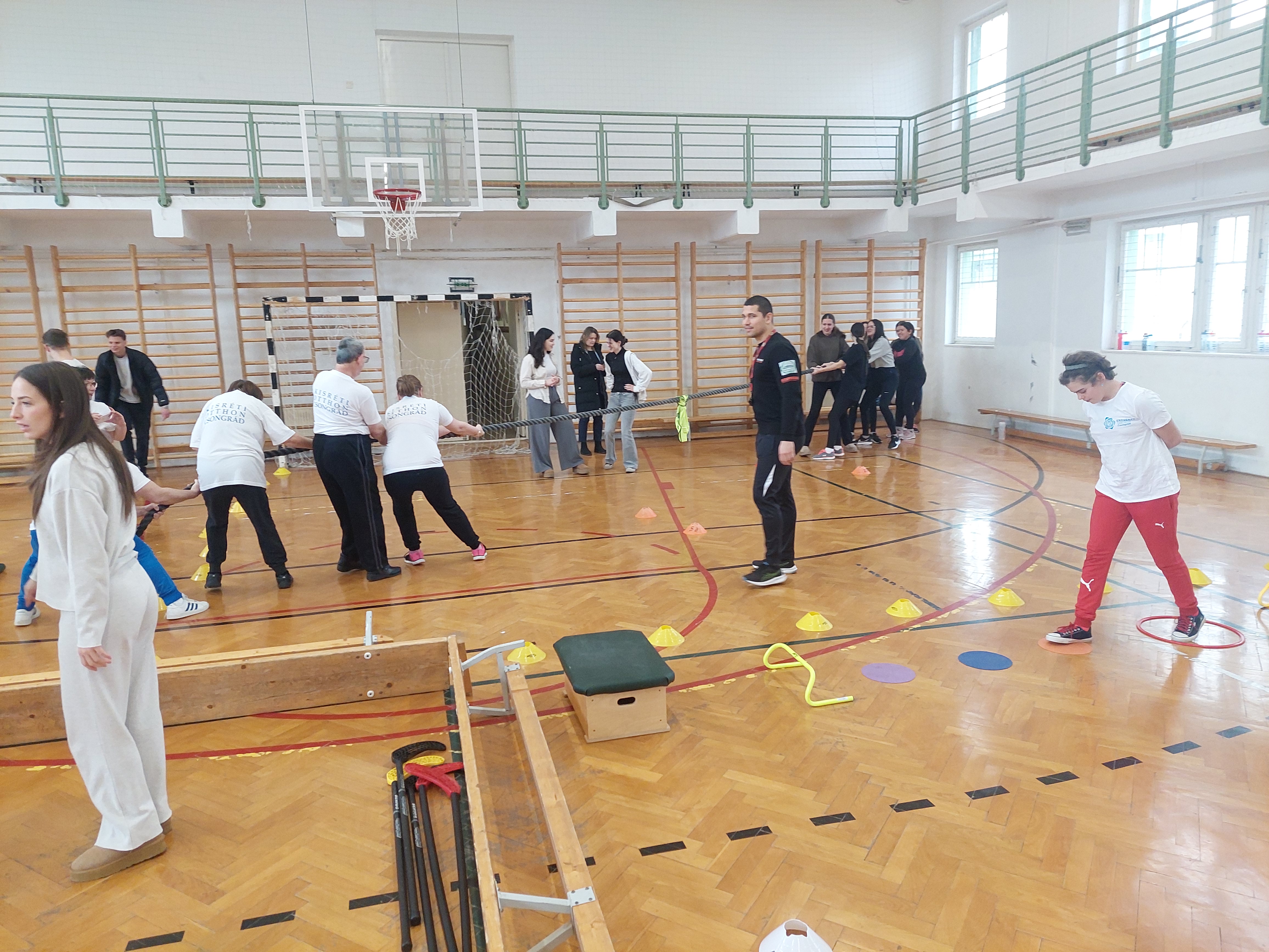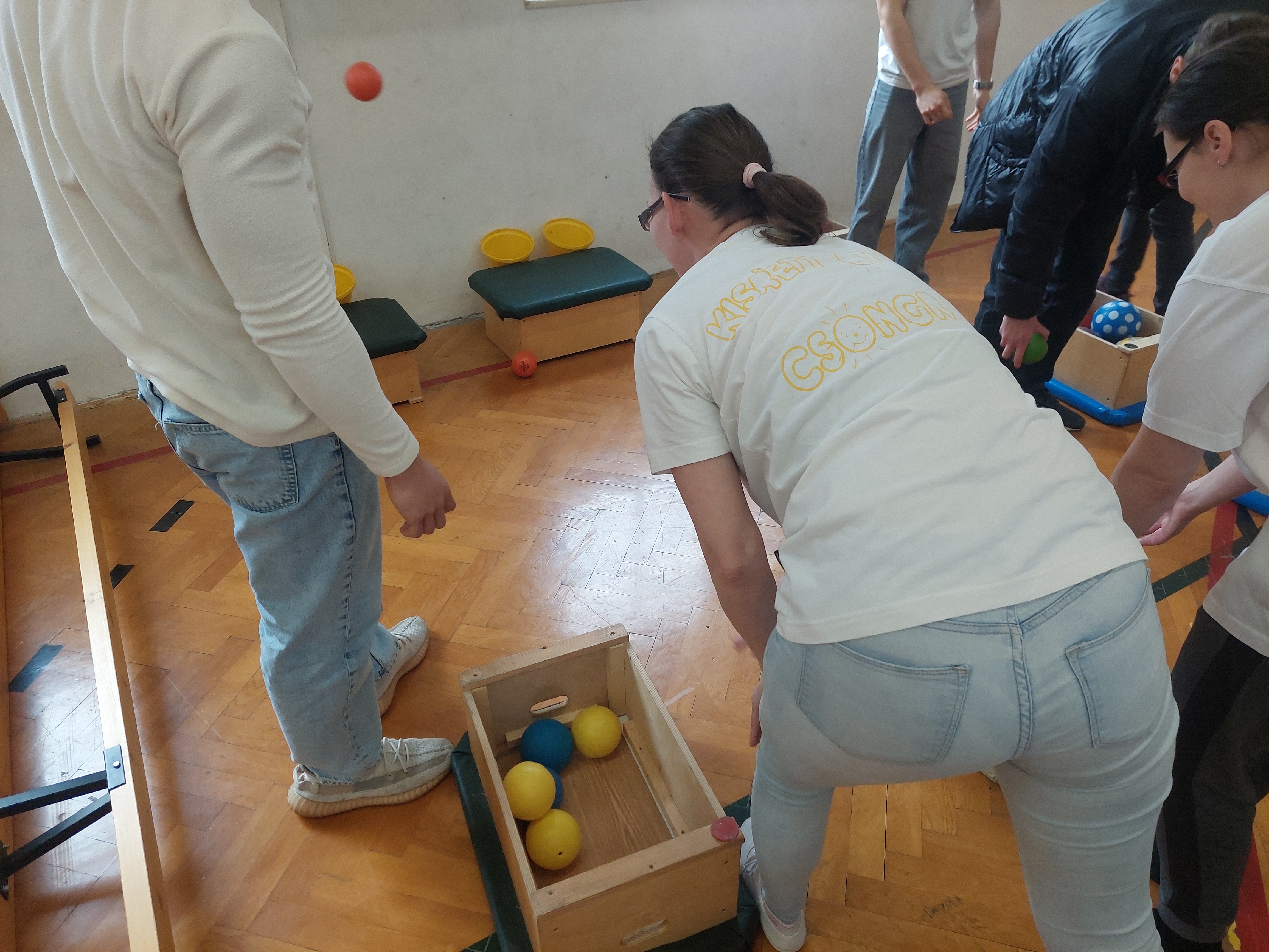 A meghívott külsős vendégeink egyenruhát hoztak. Az átöltözés és egy kis ismerkedés után zenés gimnasztikával kezdtünk, bemelegítésképpen. Ezt Kátai Judit gyógytestnevelő tanárnő vezényelte.