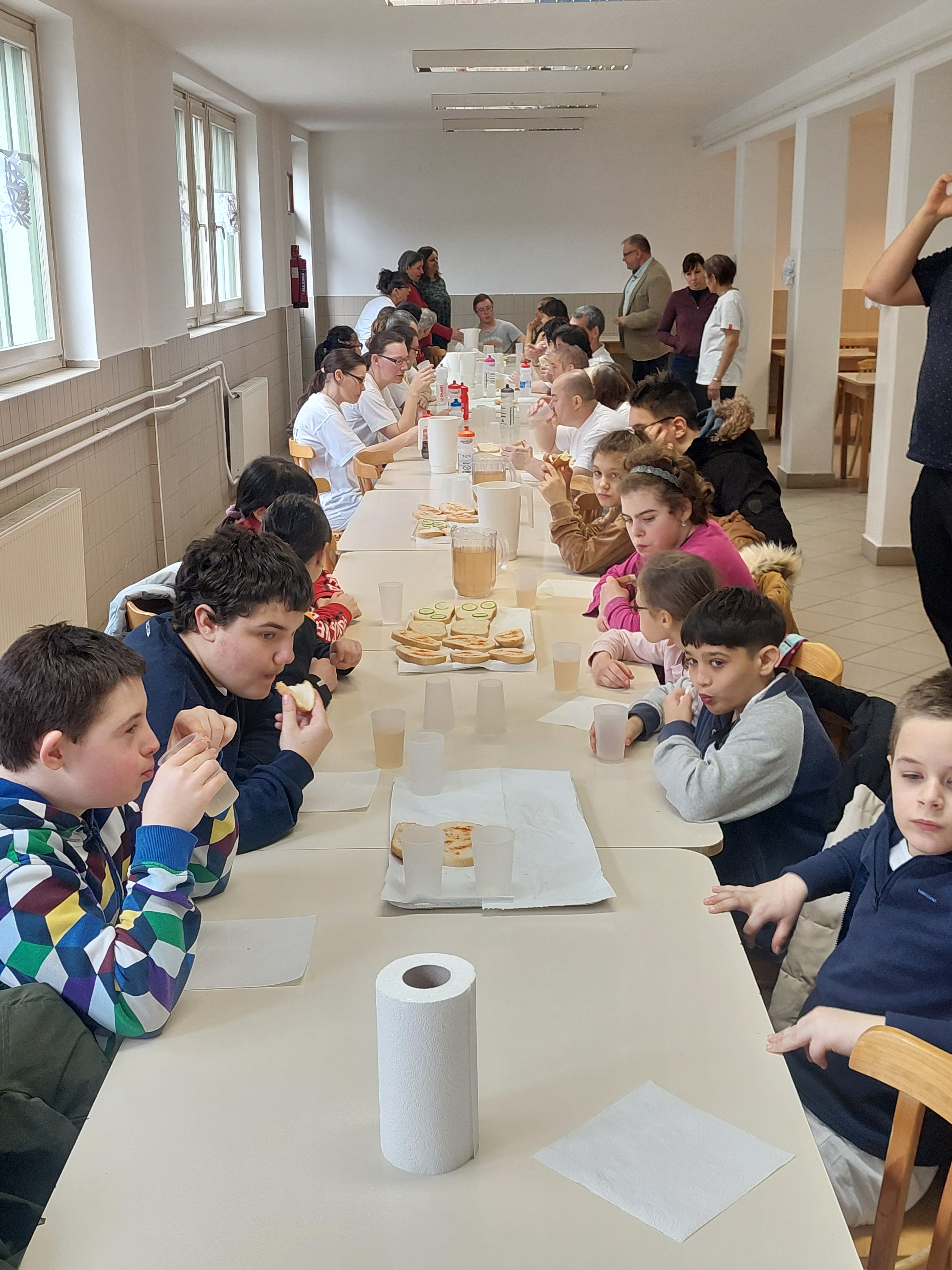 A legvégén egy kis meglepetéssel szolgáltunk a vendégeinknek és a diákjainknak. Az iskola éttermében készítettünk zsíros kenyeret, mellé hagymával, uborkával. Meg persze volt finom tea is. Jólesett nekik és jóízűen elfogyasztották.