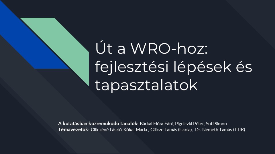 Az elmúlt másfél-két évben a csongrádi gimnázium kutatócsoportját végzősök: Pigniczki Péter, Suti Simon és időközben már elballagott diákunk Bárkai Fáni alkották. Számukra az utóbbi évek fontos eseményei voltak a WRO versenyek. Az elért hazai és nemzetközi versenyeredmények, nem pusztán a sikert, hanem sok és folyamatos tanulást, fejlődést, szakirodalomkutatást, új agoritmusok keresését, megértését, saját ötletekhez illesztését, rengeteg tesztelést, a megoldási módszerek folyamatos tökéletesítését jelentette. Így egyértelmű volt, hogy a diákkonferencián is e kutatási folyamatot és a robotépítés, tesztelés és az algoritmizálás, programozás tapasztalatait választják témaként.