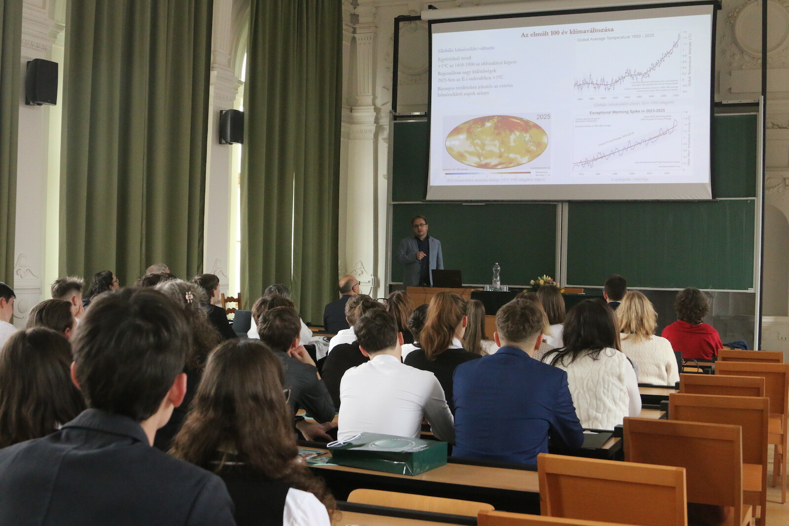 egész napos esemény, amelynek fő védnöke, és egyben levezető elnöke Dr. Papp Tamás általános és tudományos dékánhelyettes. Legelőször bemutatják a következő időszak kutatási terveit, majd kezdetét veszi az előadássorozat: az első előadó mindig az SZTE TTIK egyik oktatója. Idén Dr. Gál Tamás Mátyás tanszékvezető egyetemi tanár (Légkör- és Téradattudomány Tanszék) beszélt a Klímaváltozás aktuális és nyitott tudományos kérdéseiről.