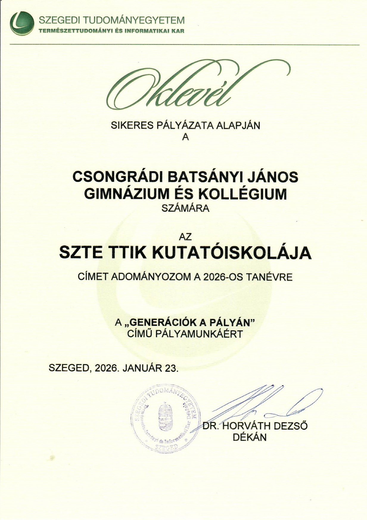 A csongrádi gimnáziumot Pigniczki Péter képviselte a Szegedi Tudományegyetem Természettudományi és Informatikai Kara által szervezett diákkonferencián. E rendezvény célja, hogy az SZTE TTIK Kutatóiskolája címmel rendelkező iskolák bemutathassák a középiskolai tanulmányokon túlmutató témában végzett kutatómunkájukat, megszerzett tapasztalataikat, az elért eredményeket, esetleges jövőbeni terveiket.