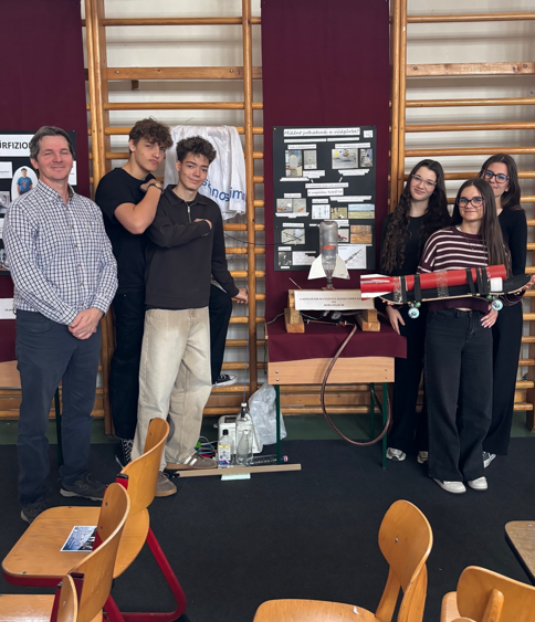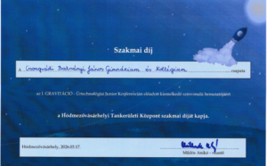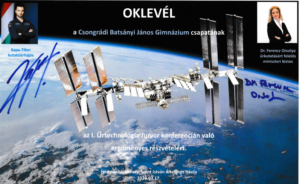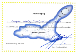Ezek után a diákok előadásai következtek. Sok érdekes témát ismertettek a diákok, a BJG csapata arról beszélt, hogy miként is lehet a világűrbe jutni. Az előadás közben érdekes kísérleteket is bemutattak, szó esett arról is, hogy hőlégballonnal vagy légcsavaros repülővel miért nem lehet a légkört elhagyni. Az előadásuk zárásaként az udvaron egy gördeszkára szerelt rakétát is működésbe hoztak. Bemutatójukat Szakmai és Közönség díjban is részesültek. Gratulálunk a csapatnak! A csapat tagjai: Csaba Petra, Deák Zsófia, László Eszter, Kőrösi Tibor, Szremkó János 9. évfolyamos diákok. Felkészítő tanár Szabó László tanár úr.