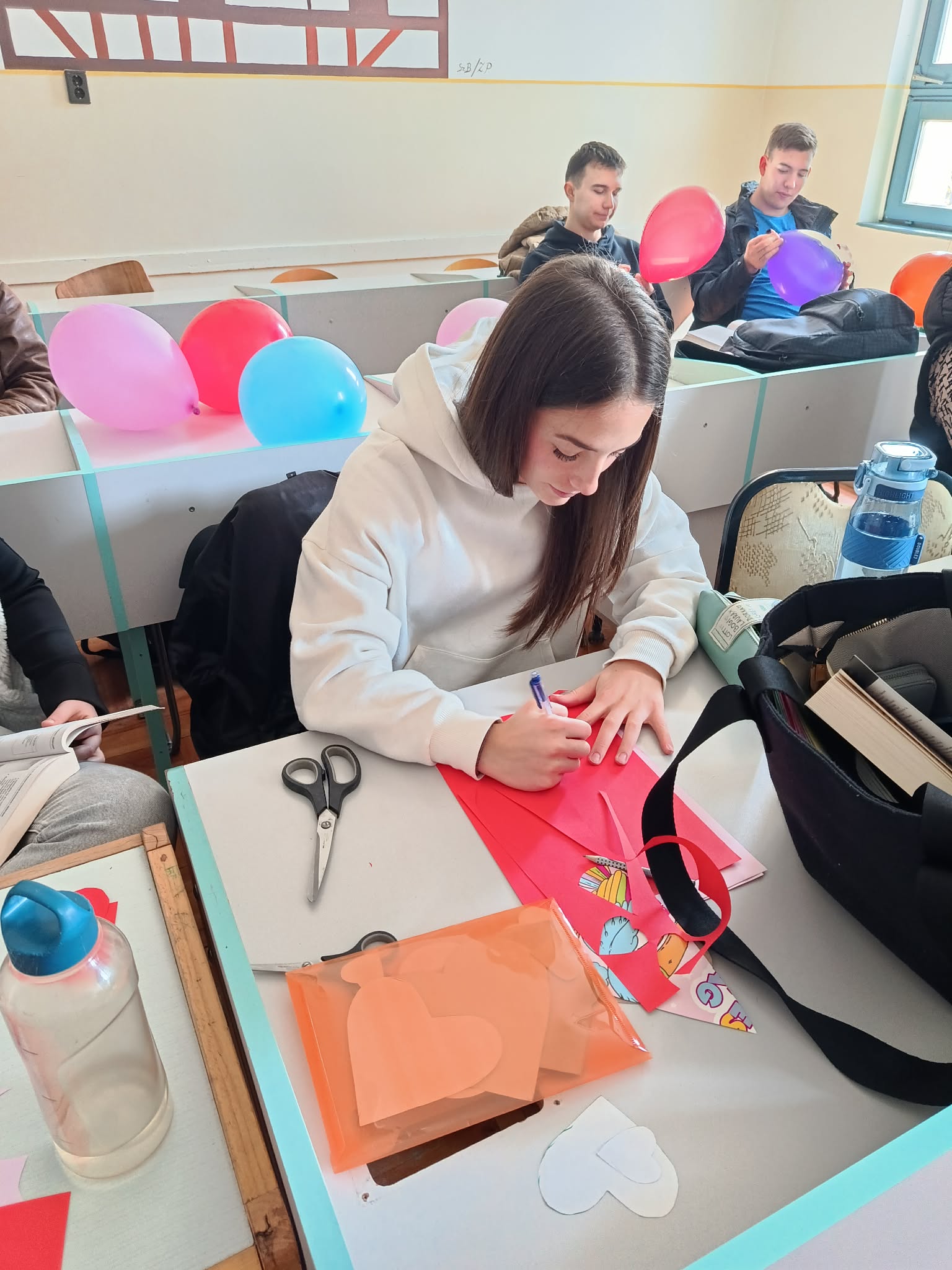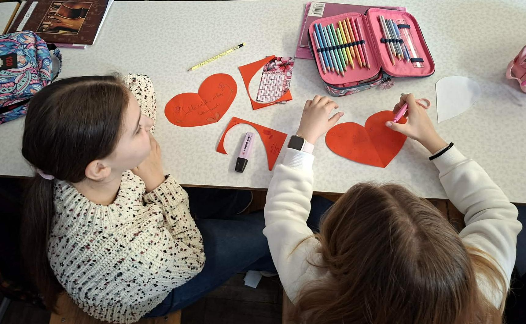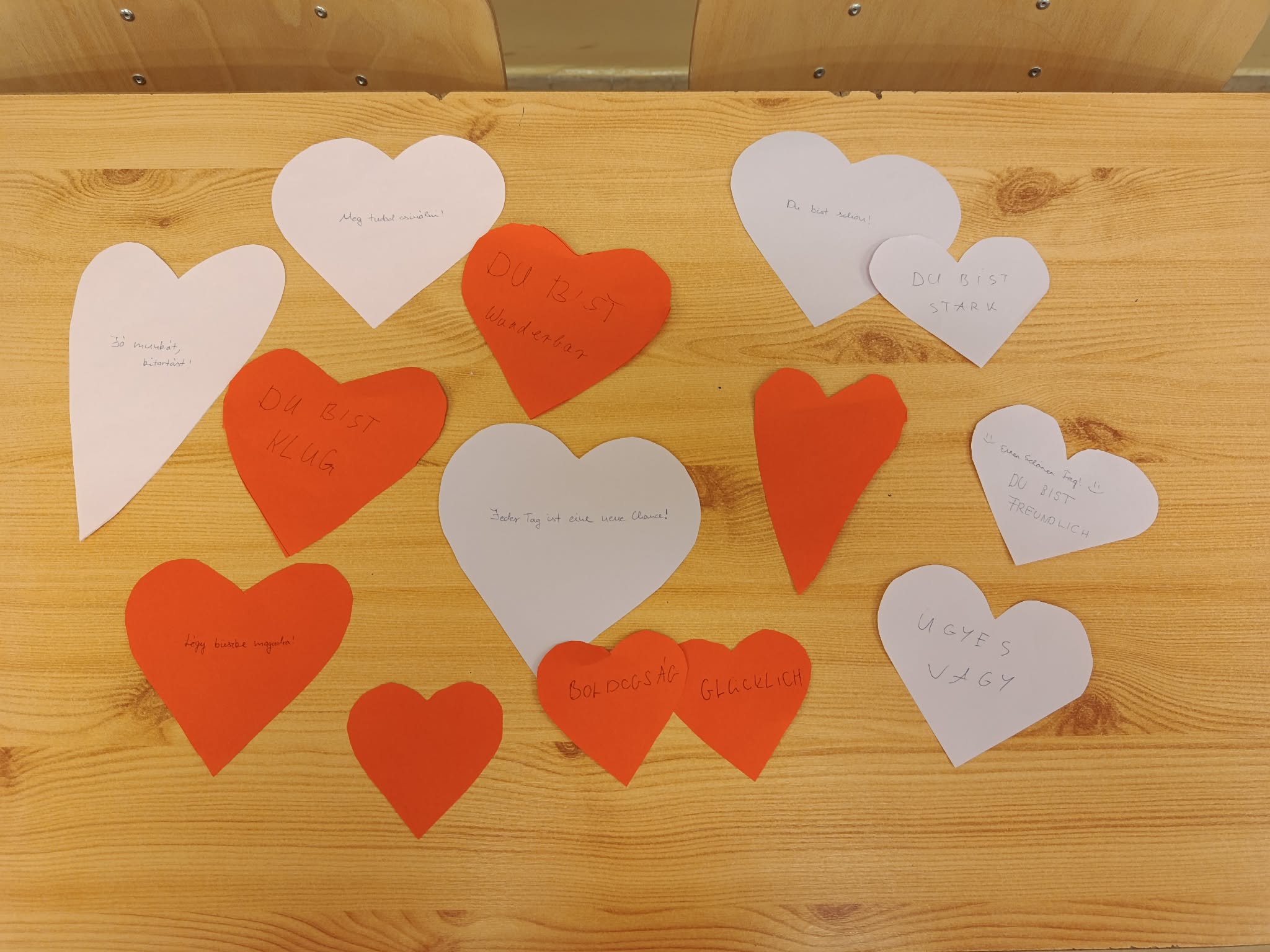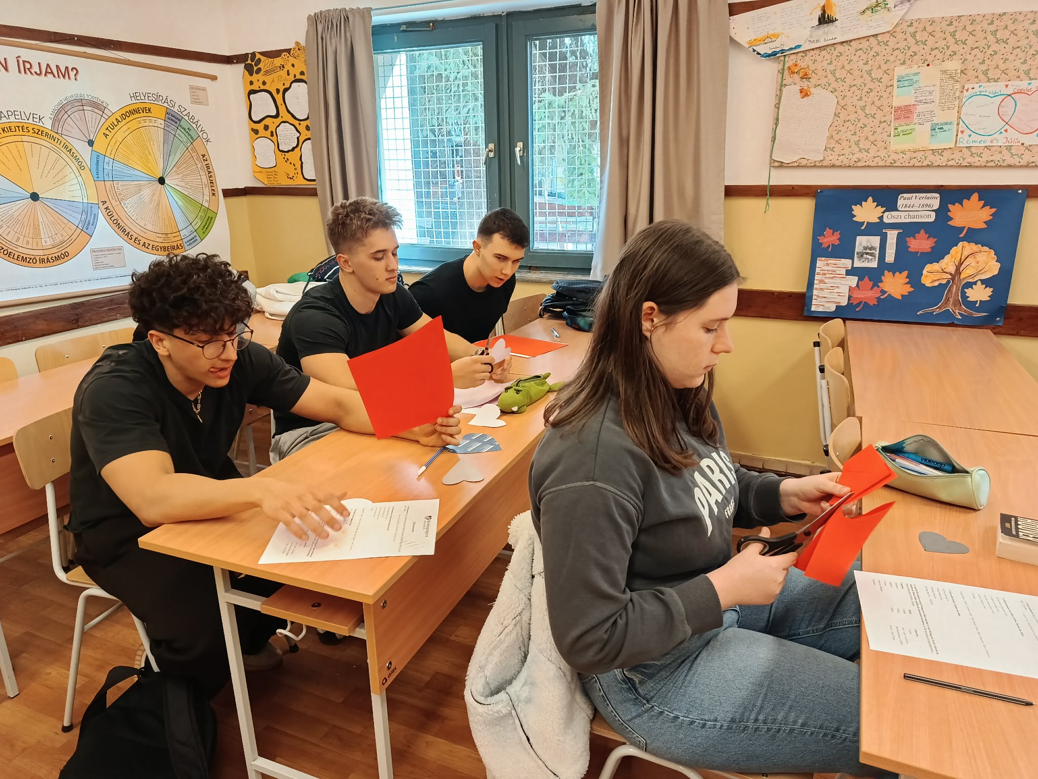 12.F osztály, németes csoport – Biró Edit tanárnő: Március az apró örömök élvezetének hónapja, ezért a boldogságórán ezzel a témával foglalkoztunk. Először megnéztünk egy rövid, német nyelvű videót arról, miért fontos észrevenni a hétköznapok apró, boldog pillanatait. Egy kis trükköt is tanultunk a filmből: ha minden reggel egy marék gyöngyöt, vagy üveggolyót rakunk az egyik zsebünkbe, és minden egyes alkalommal, amikor valamilyen öröm ért bennünket, egyet áthelyezünk a másik zsebünkbe, akkor este átgondolhatjuk (és ezzel együtt újraélhetjük), mennyi boldog pillanatunk volt a nap során. Ezután a diákok németül elmondták, mi minden okoz nekik örömet, mi az, ami boldoggá teszi őket. Sok minden szóba került, az olvasástól a zenehallgatáson át az iskolai sikerekig és a barátokkal eltöltött időig. Ezután a Költészet Világnapja tiszteletére verset írtunk, ezúttal a mesterséges intelligencia segítségével. A tavaly már megtanult cinquain és haiku versformák után most a limerick nevű versformával ismerkedtünk meg. Mivel a következő nap ünnepeltük iskolánkban a Boldogság Világnapját, színes papírokból szíveket vágtunk ki, amelyekre motiváló üzeneteket írtunk magyar és német nyelven, majd ezeket a diákok átadhatták társaiknak, barátaiknak, ismerőseiknek.