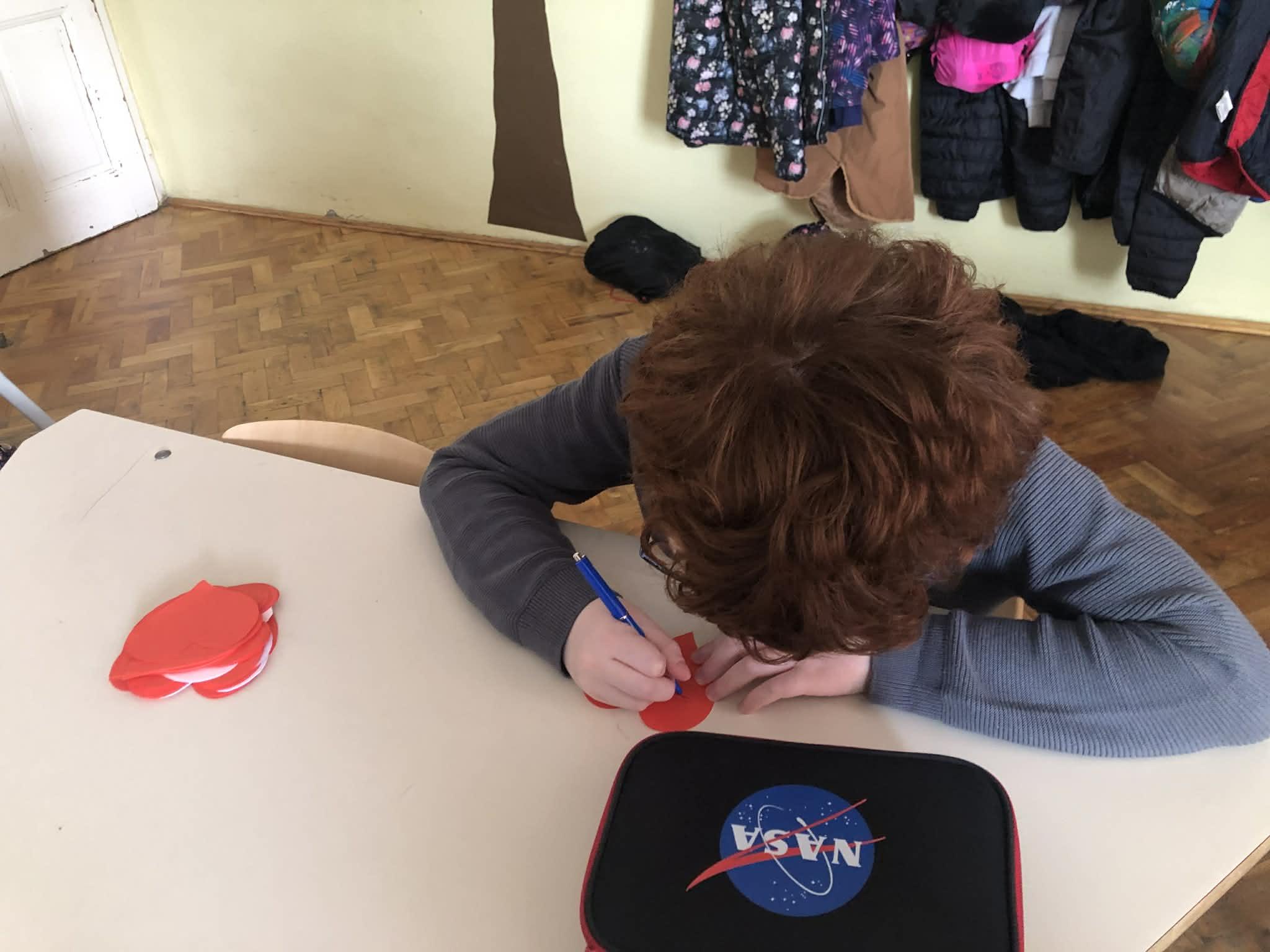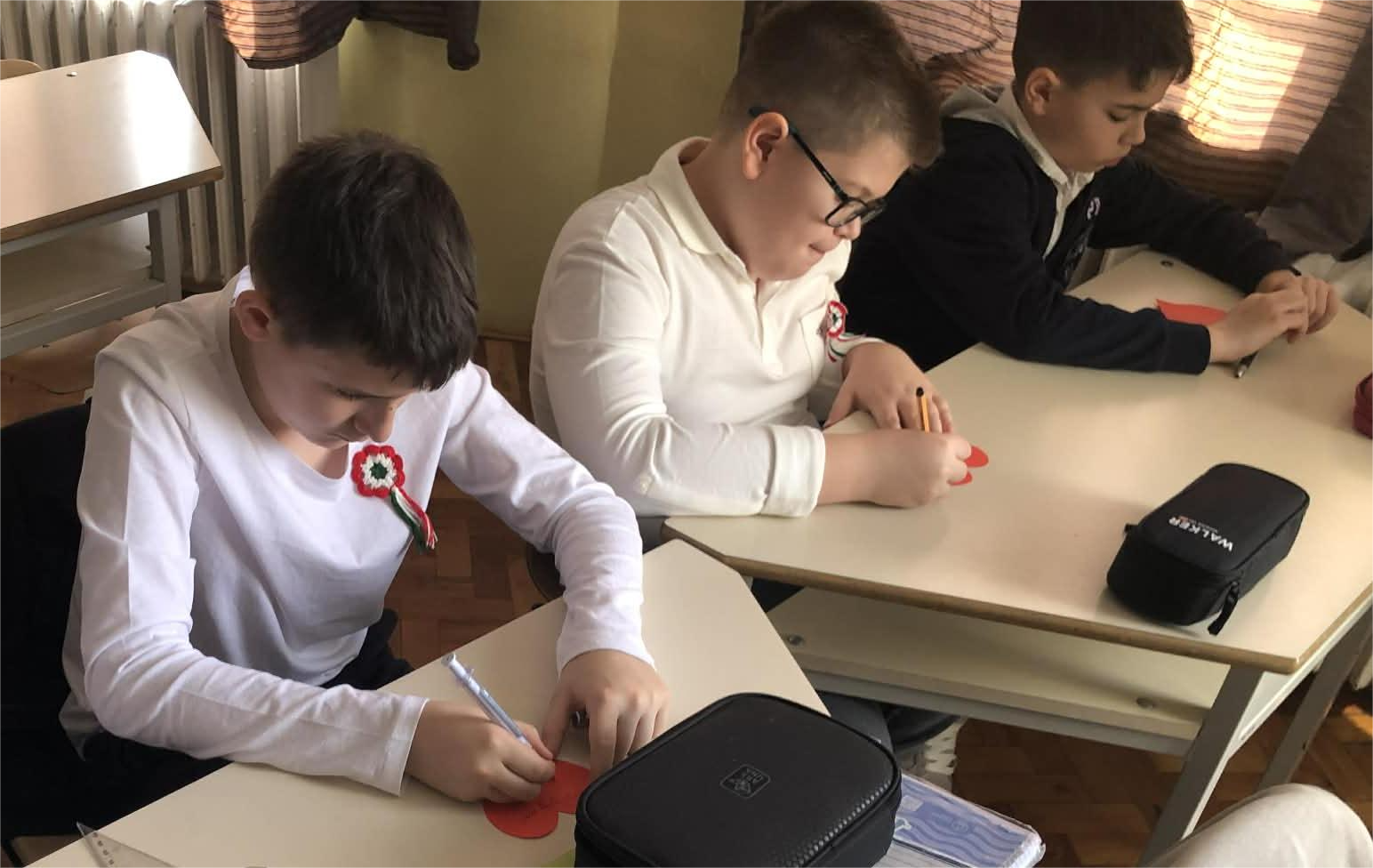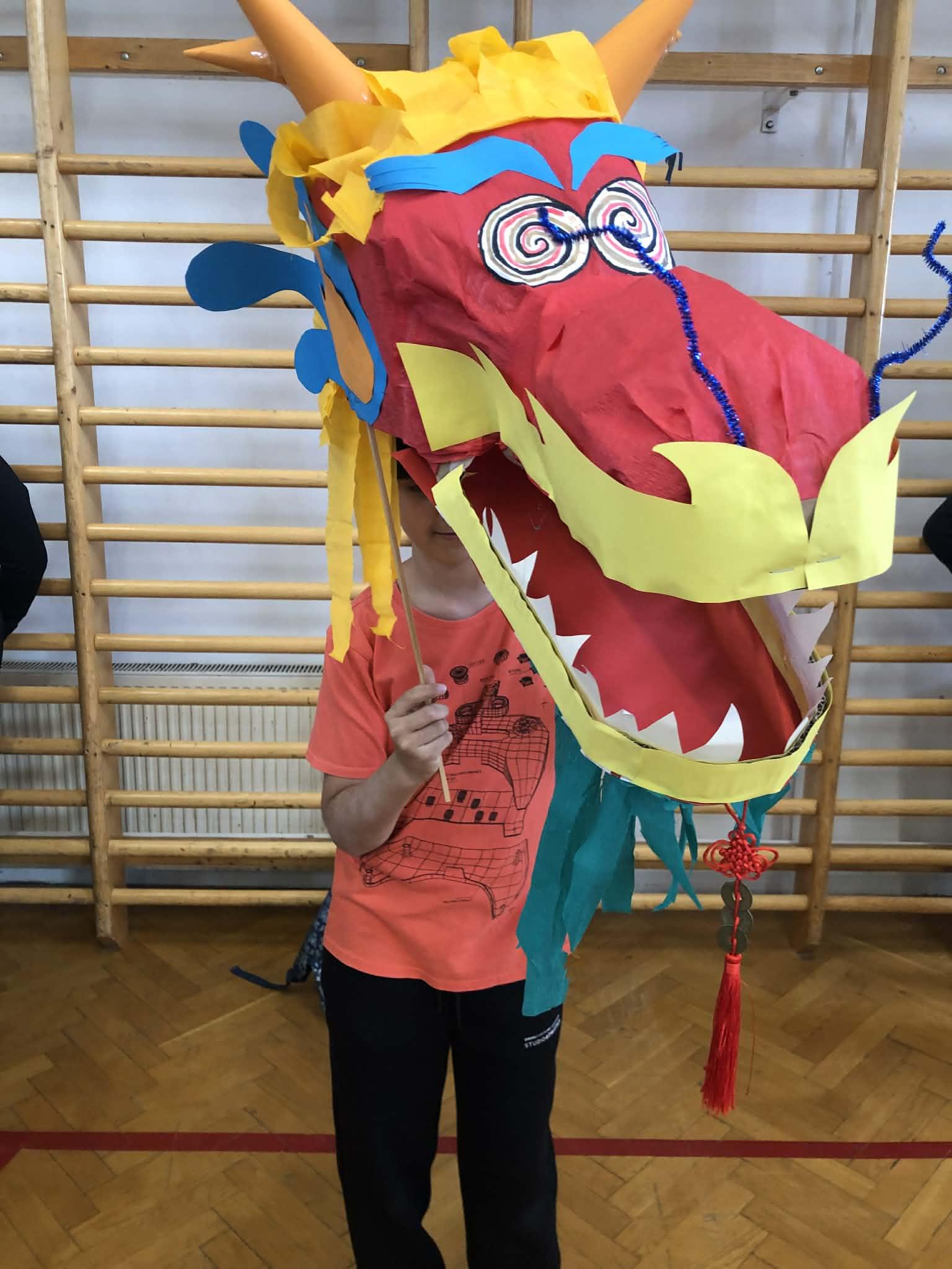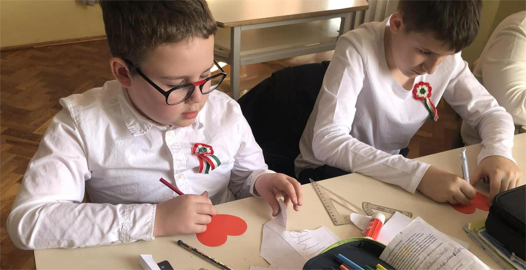5.F osztály – Bedéné Fodor Virág tanárnő: Az osztállyal a diáknapra, illetve a Boldogság Világnapjára is készültünk márciusban, így ezek a közösen végzett tevékenységek és készülődés jelentették azokat az örömteli pillanatokat, amelyekkel igyekeztünk az osztályközösséget összekovácsolni, erősíteni a társas kapcsolatainkat, megélni az apró örömöket a mindennapokban. Március 20-án, a Boldogság Világnapján, az előzetesen elkészített papír szívecskékkel egy nagy szívet formáltunk iskolánk aulájában a nagy szünetben. Iskolánk fecskéi meglepetésként és ajándékként lufikat kaptak a nagyobb gimis diákoktól a szünet végén. A nap zárásaképpen az elkészült szívecskéket mindenki oda adhatta ismerősének, családtagjának vagy éppen a városban ismeretlen embereknek, így szerezve kellemes pillanatokat ezen a különleges napon. A DÖK napra meglepetésként Németh Zente saját maga tervezte és készítette el papírból azt a sárkányfejet, amelyet az osztályprodukcióban láthattunk.