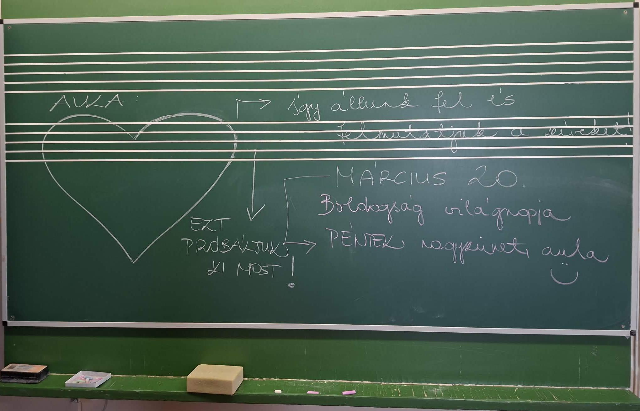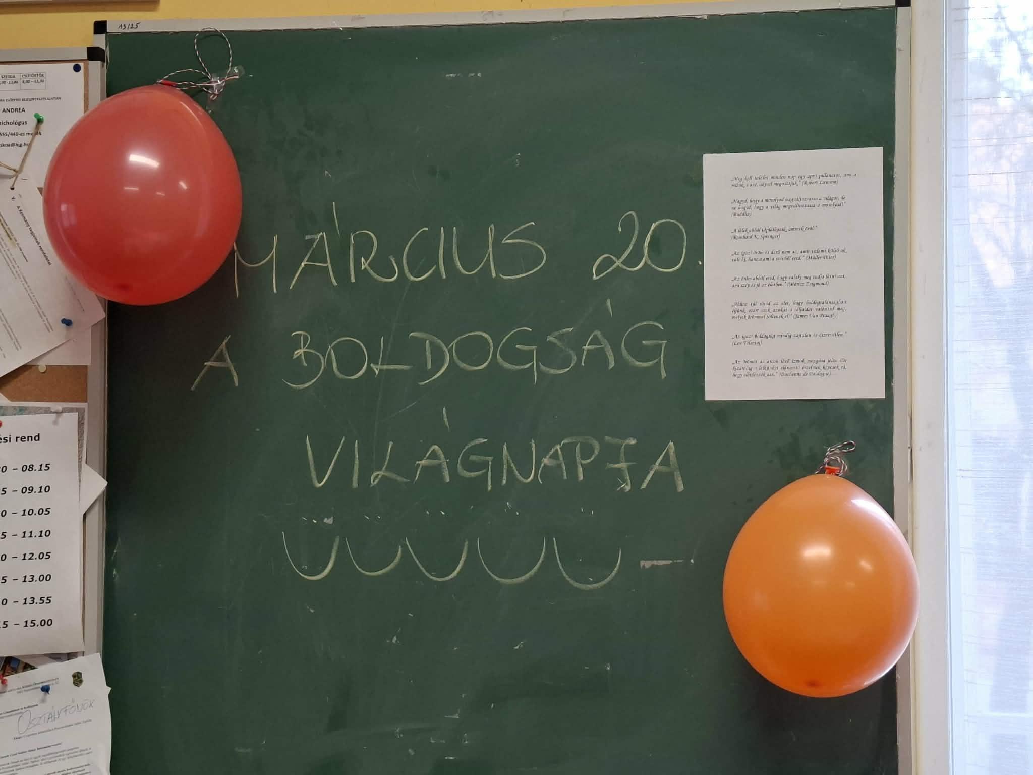 Hálásan köszönjük Stéhlikné Szalkai Mária tanárnő, Molnár Attila technikus, Kaszás Tamás informatikus és az összes boldogságórát tartó kolléga előzetes pluszmunkáját a március 20-i világnapi rendezvényünkhöz kapcsolódóan! Reméljük (és nem titkolt célja is volt ennek a napnak), hogy képesek leszünk a mindennapi örömteli pillanatokra is jobban odafigyelni, hiszen ezzel a tudatos attitűddel is hozzájárulunk a testi-lelki-mentális jóllétünkhöz.