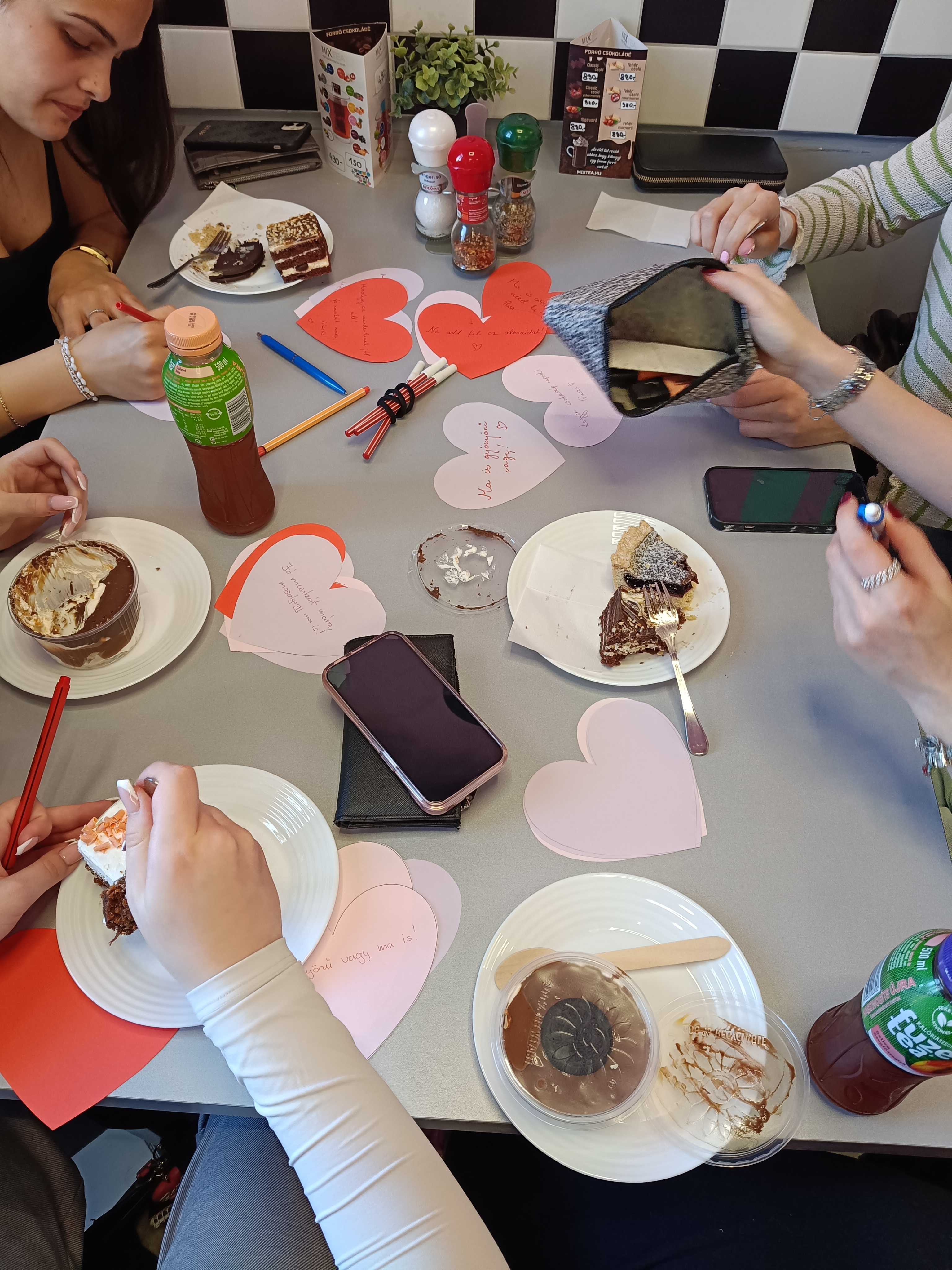 11.F osztály, németes csoport – Kovácsné Baranyi Margit tanárnő: A hetedik boldogságóránkat március 20-án tartottuk a Boldogság Világnapján. A helyszín most kivételesen nem az iskola volt, hanem egy közeli cukrászda. Egy finom süti elfogyasztása mellett a tanulók szívecskékre írtak kedves üzeneteket. Az iskolába visszavezető úton a megírt szívecskéket az utcán és a környékbeli üzletekben szétosztogatták, amivel nagy örömet szereztek az embereknek. Az iskolában még lufikat is fújtak, amit meglepetésként a gimnáziumunk legkisebb tanulói, az ötödikesek kaptak meg. Azt hiszem, hogy ezen a napon sok mindenkinek sikerült a napját boldogabbá tennünk.