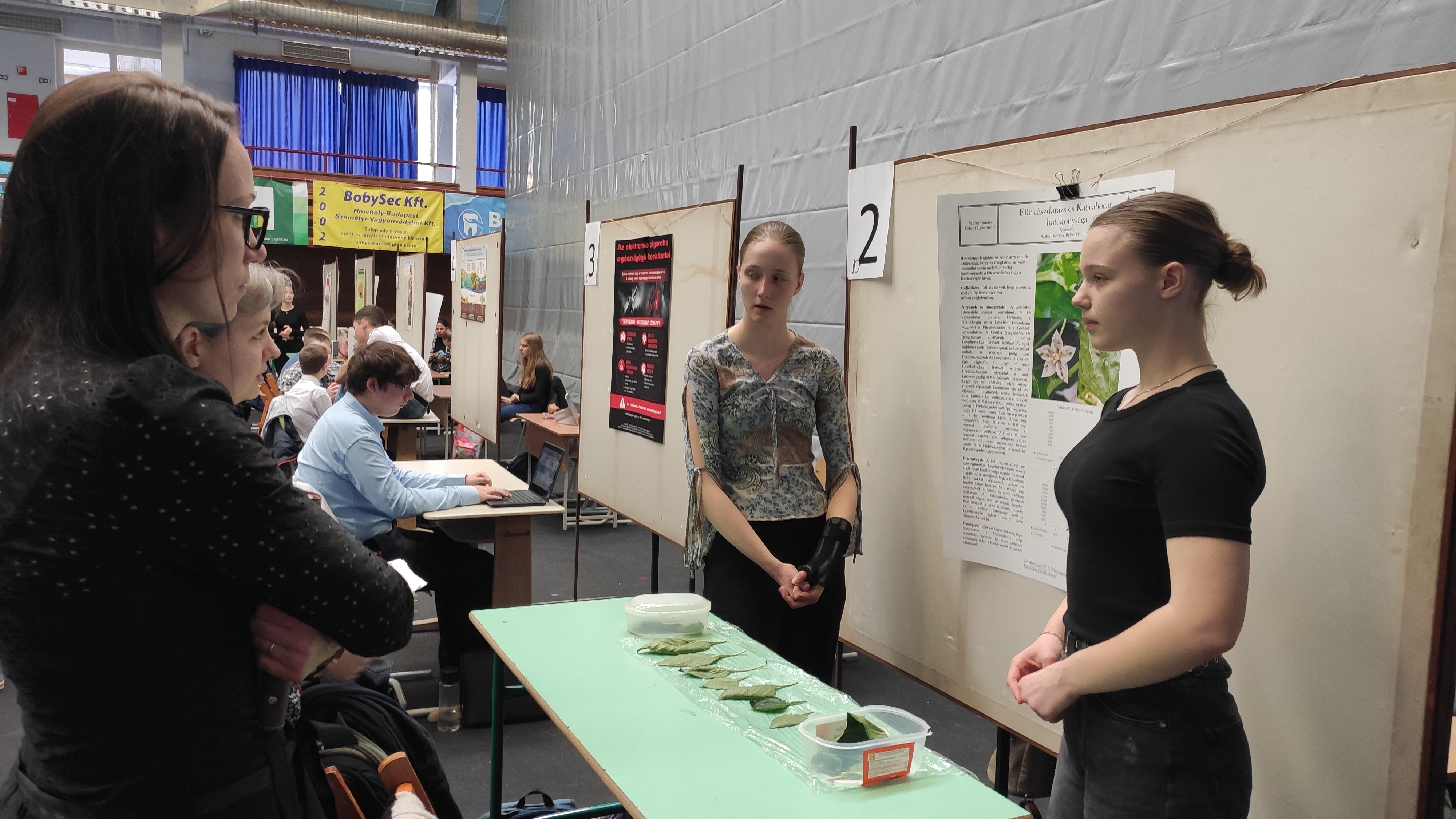 Buleca Flóra és Szalva Dorottya 10.A biológia-kémia tagozatos tanulók a „Fürkészdarázs és a Katicabogár hatékonyságának összehasonlítása a levéltetvek ellen” címmel mutatták be vizsgálataikat.